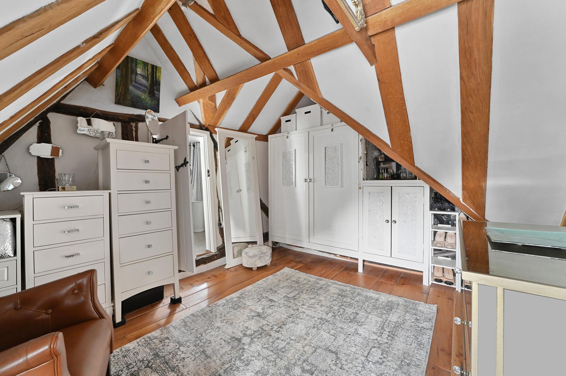 This unique cottage benefits from two staircases, each leading to a bedroom on the first floor. The stairs to the master suite are accessed from the kitchen and open out into a spacious landing, with room for storage and a contemporary ensuite shower room. The master bedroom is housed within the eaves with a tall pitched ceiling and skylight; a quirky ceiling joist running across the width of the floor, neatly separates the sleeping area from the dressing area.