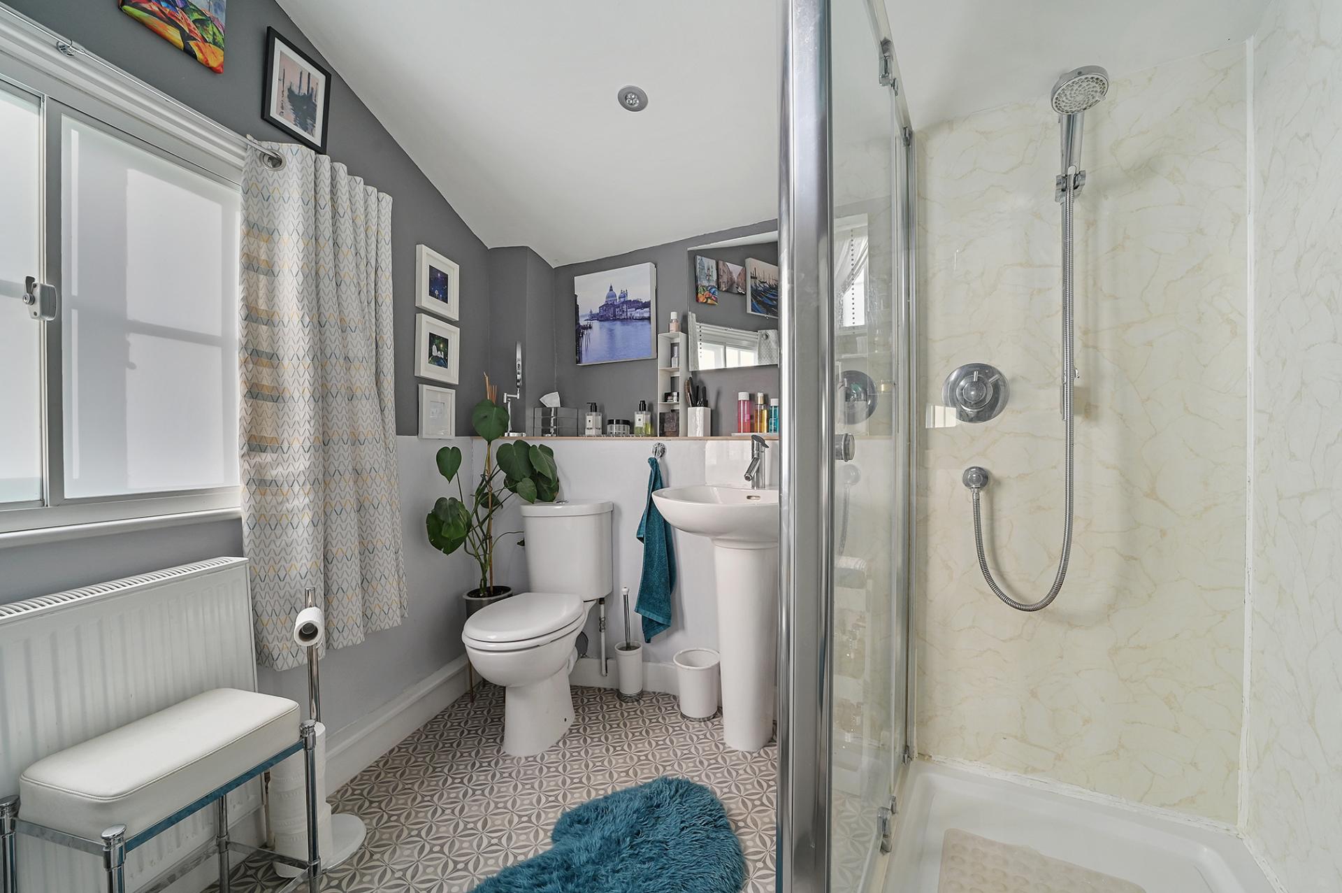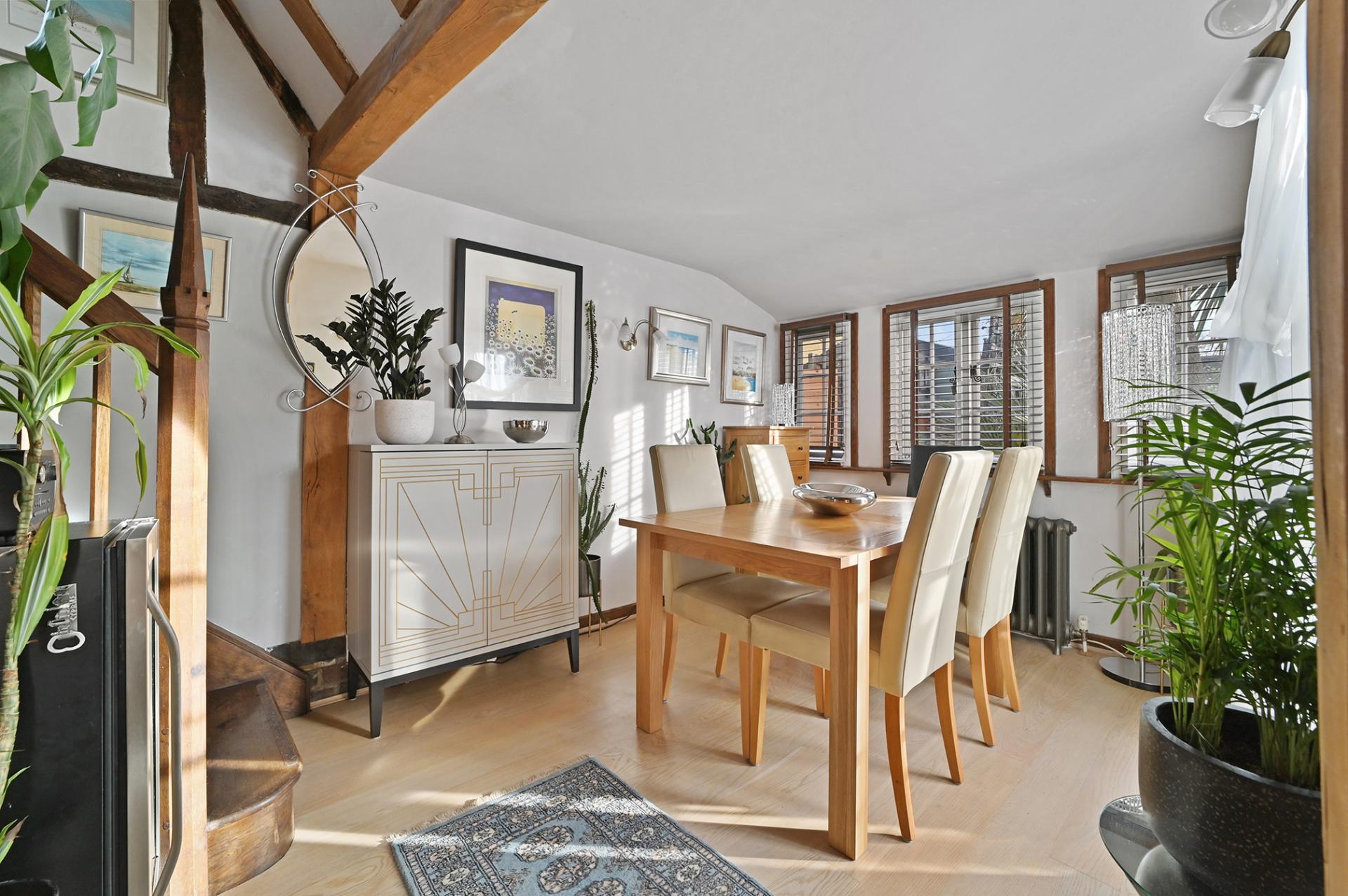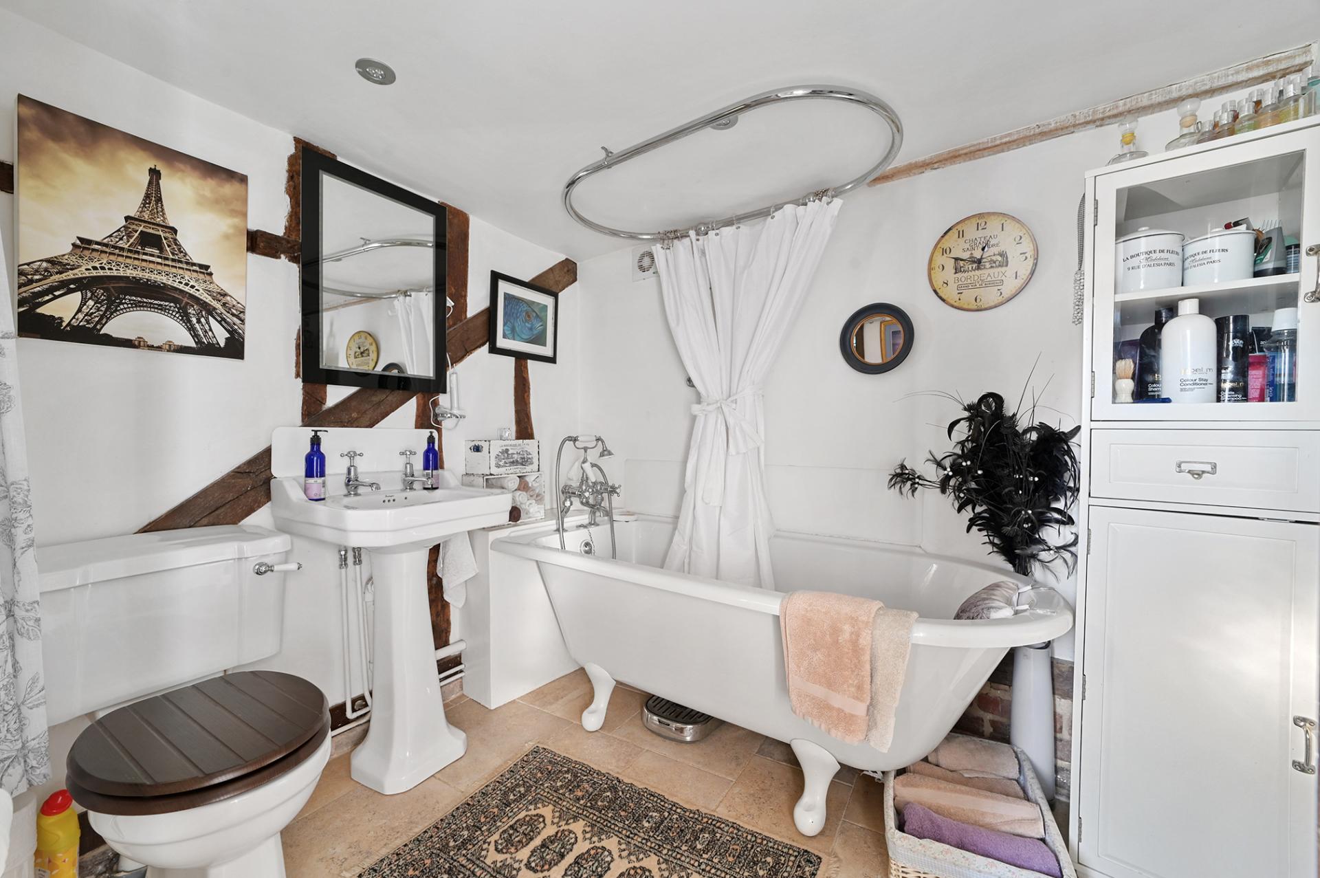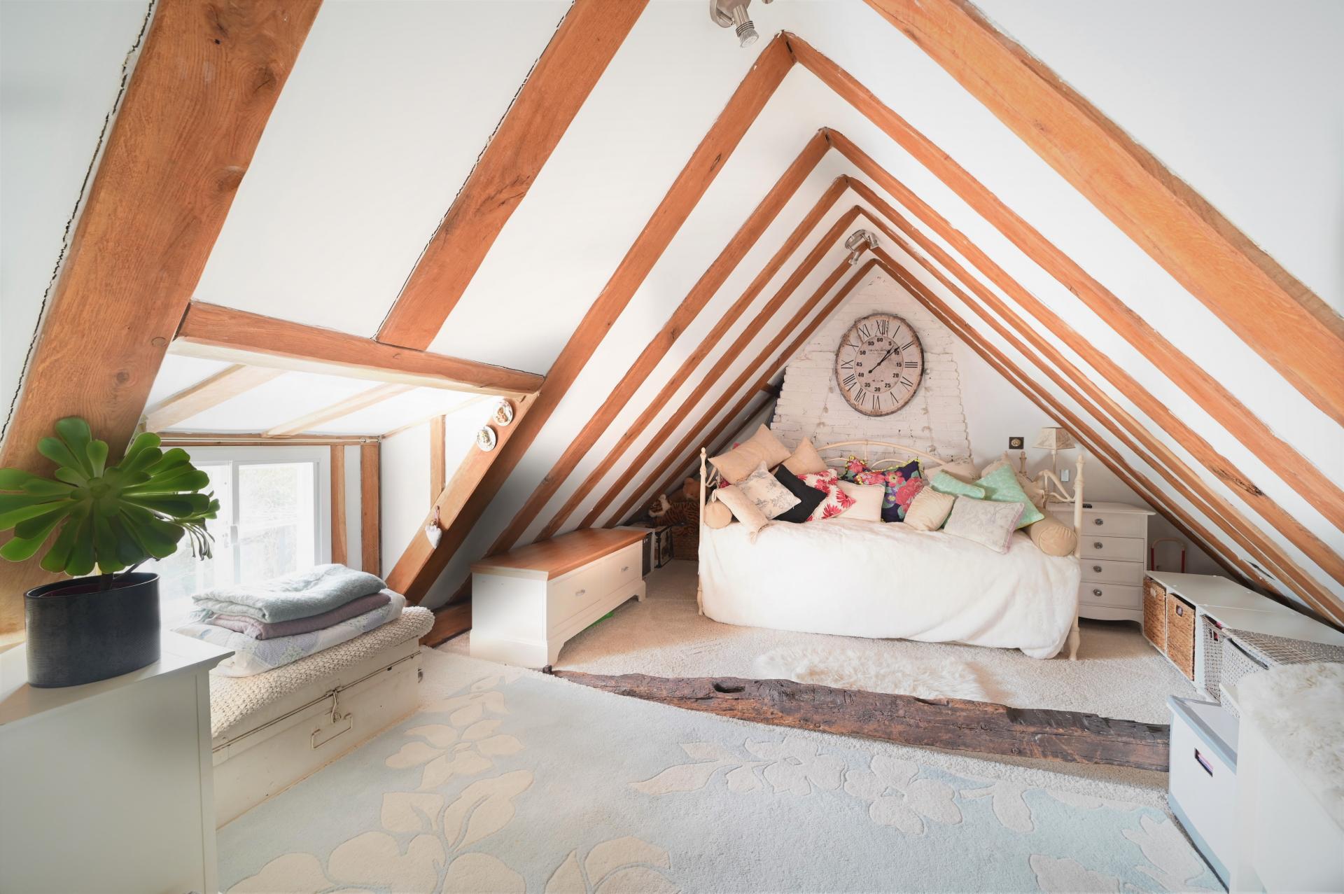 The second bedroom, with views across the garden, is located to the rear of the property and is accessed via the staircase leading from the dining room. At the turn of the stairs is a charming landing which is currently used as a small office area. The bedroom is once again housed in the eves, with exposed brick chimney breast, and ample space for storage. The bedroom is serviced by the ground floor family bathroom.