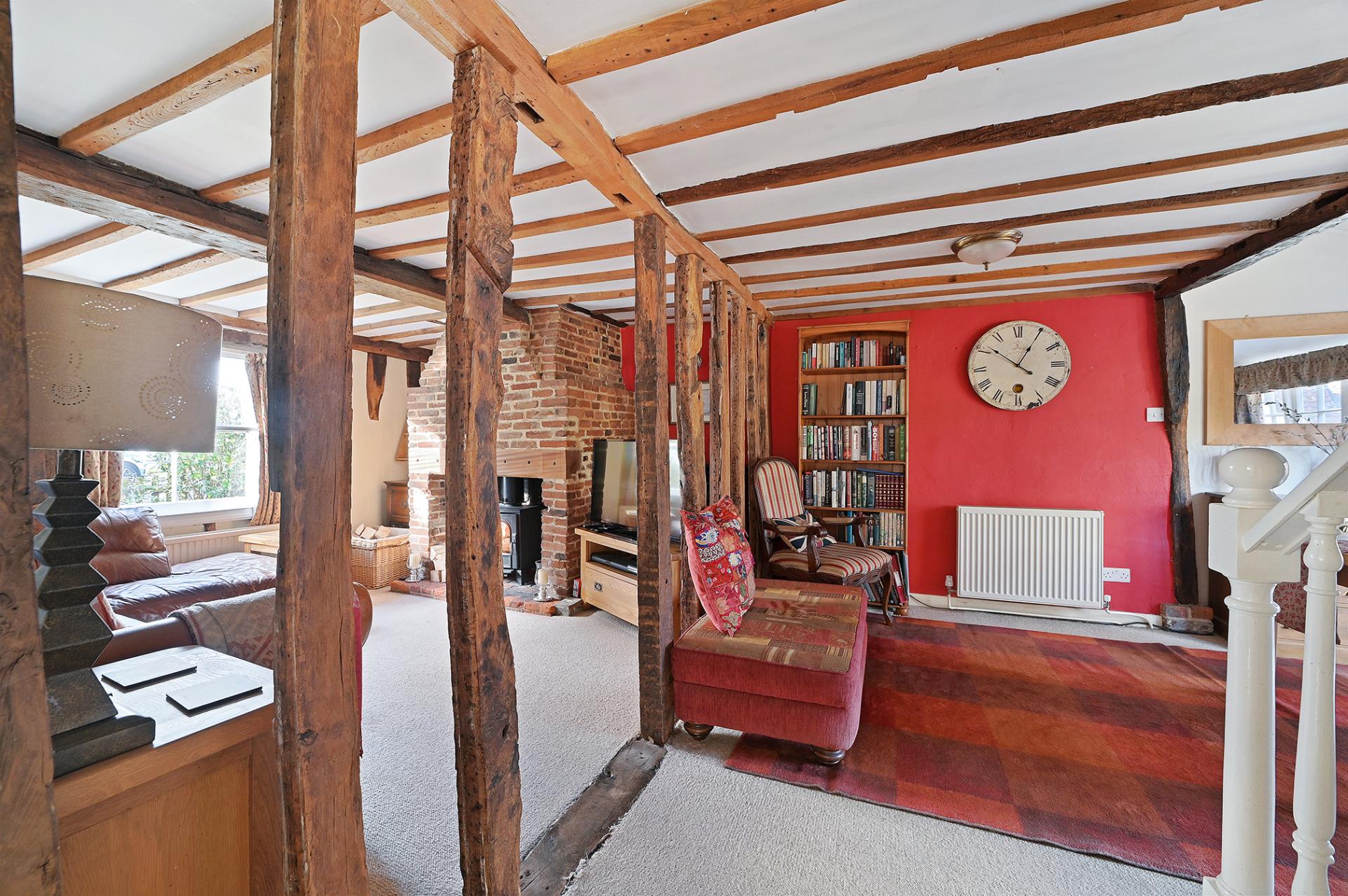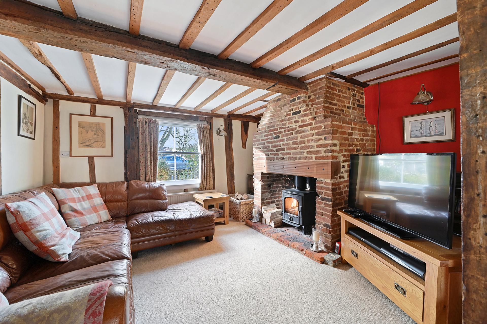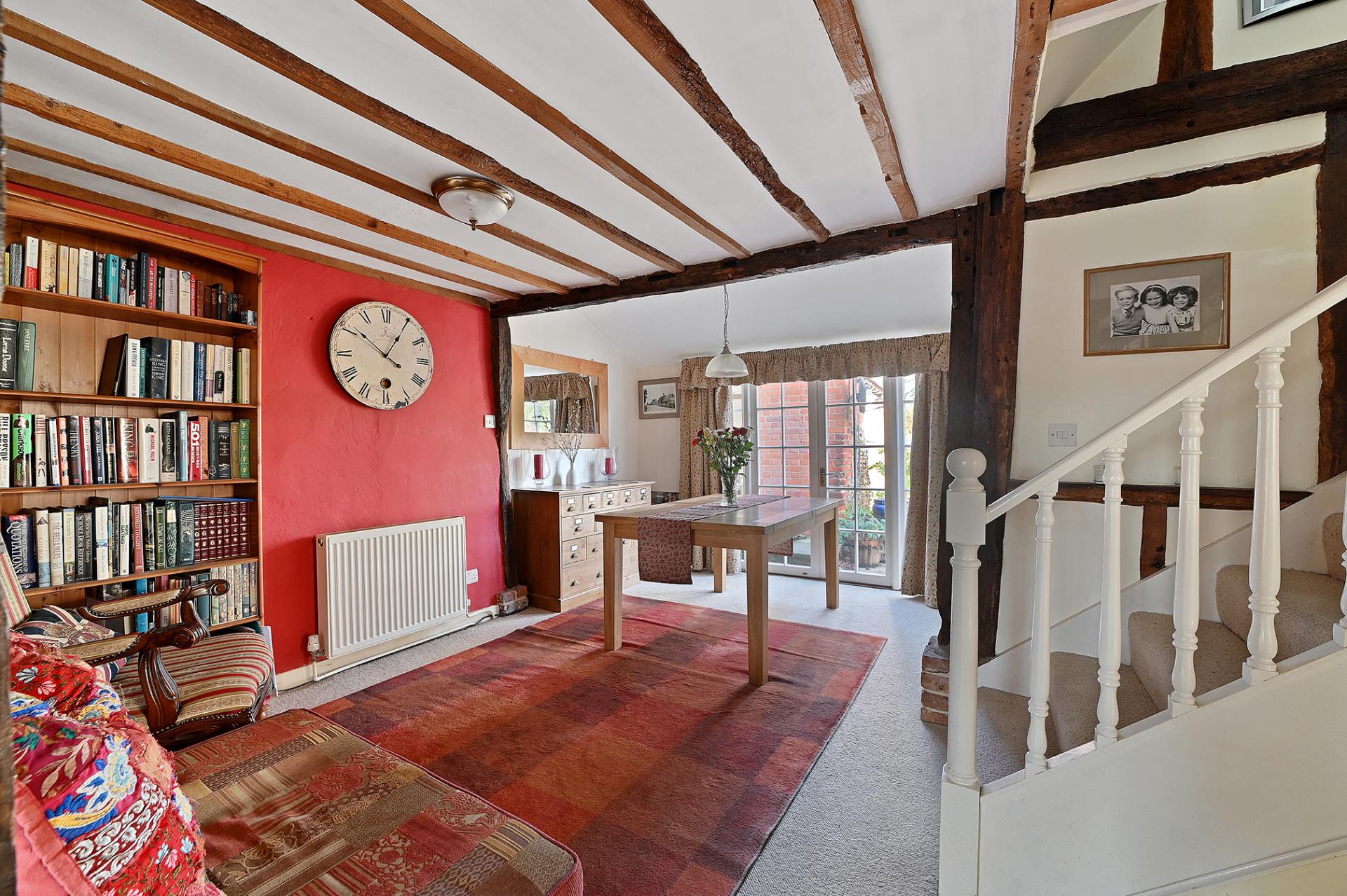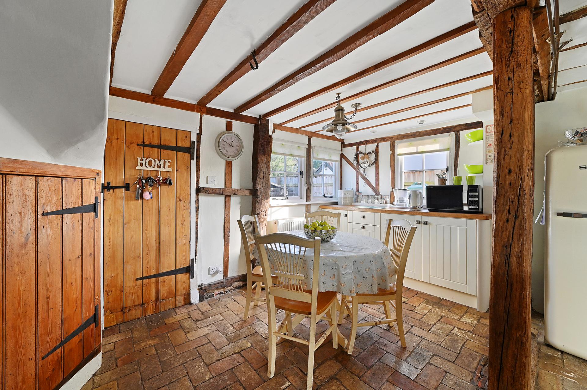 Leading directly from the kitchen into the cosy sitting room and dining room, separated once again by open beams, both rooms have a sense of space, with natural light entering from the front and rear aspects of the cottage. The sitting room boasts an imposing brick feature fireplace with log burner and the bright dining room has double doors which lead out onto the pretty terrace to the rear.