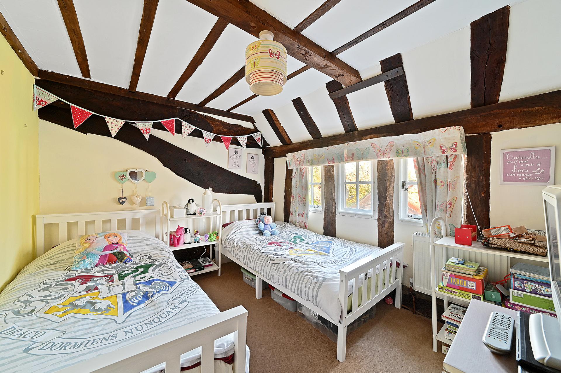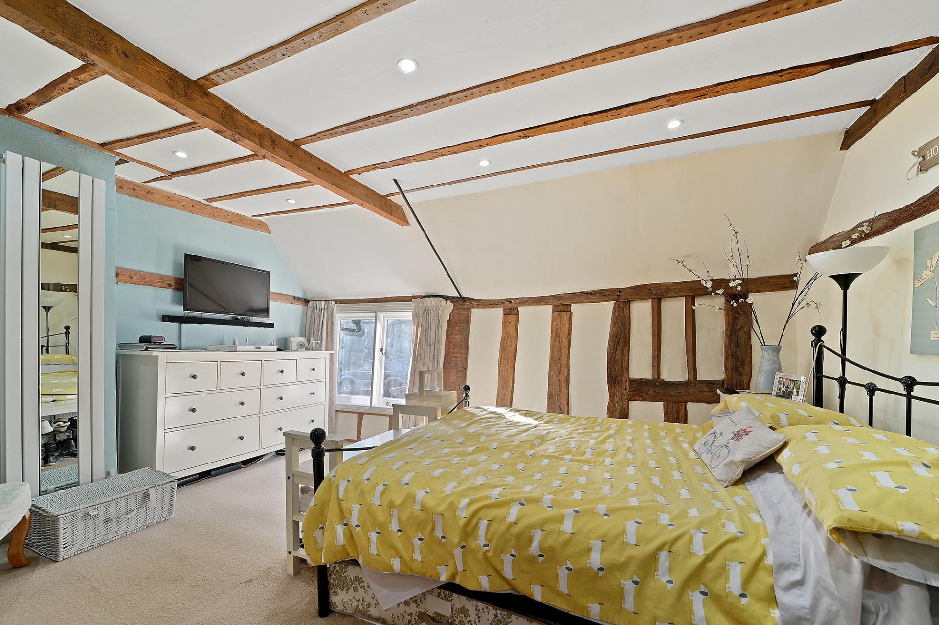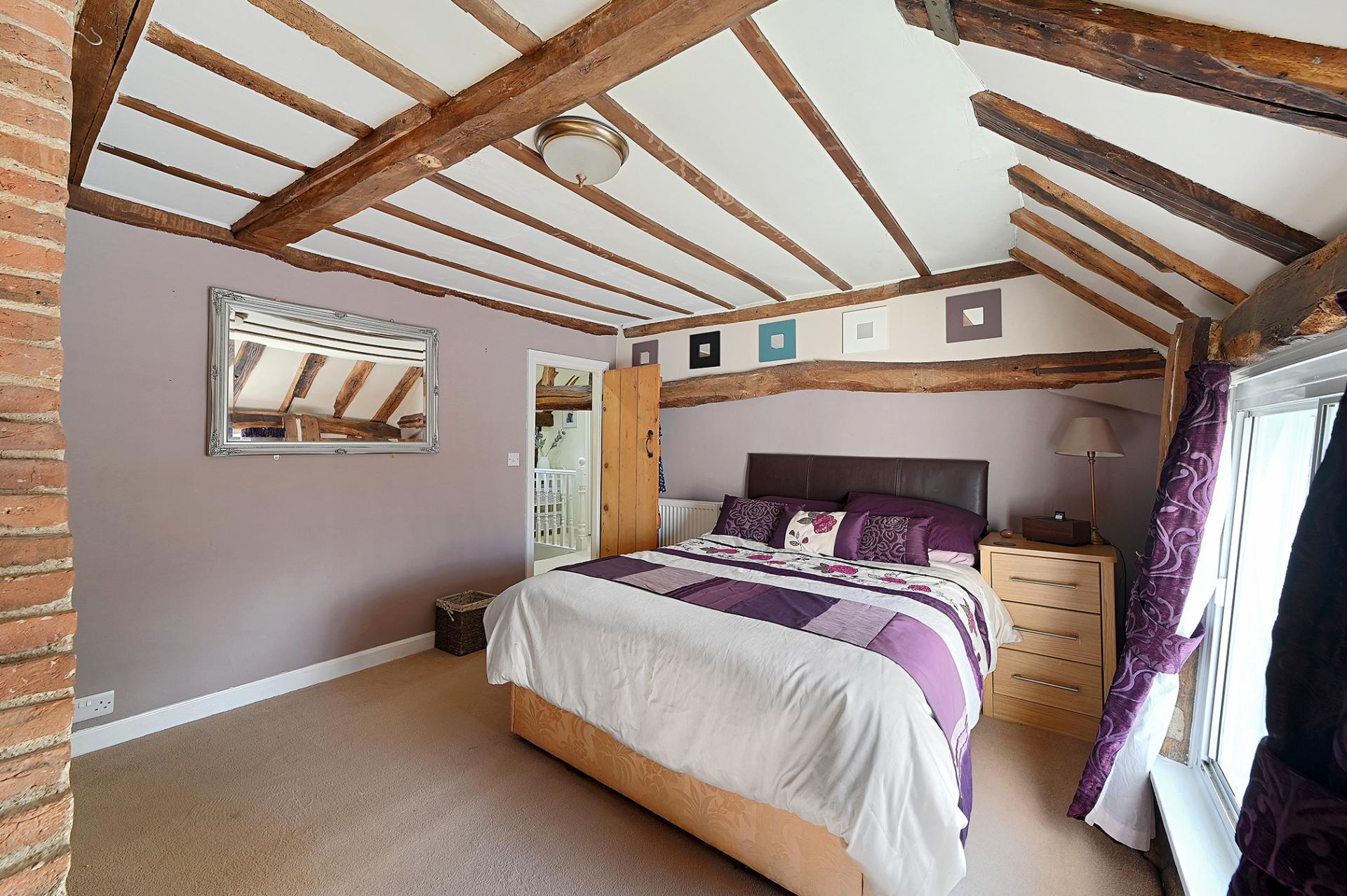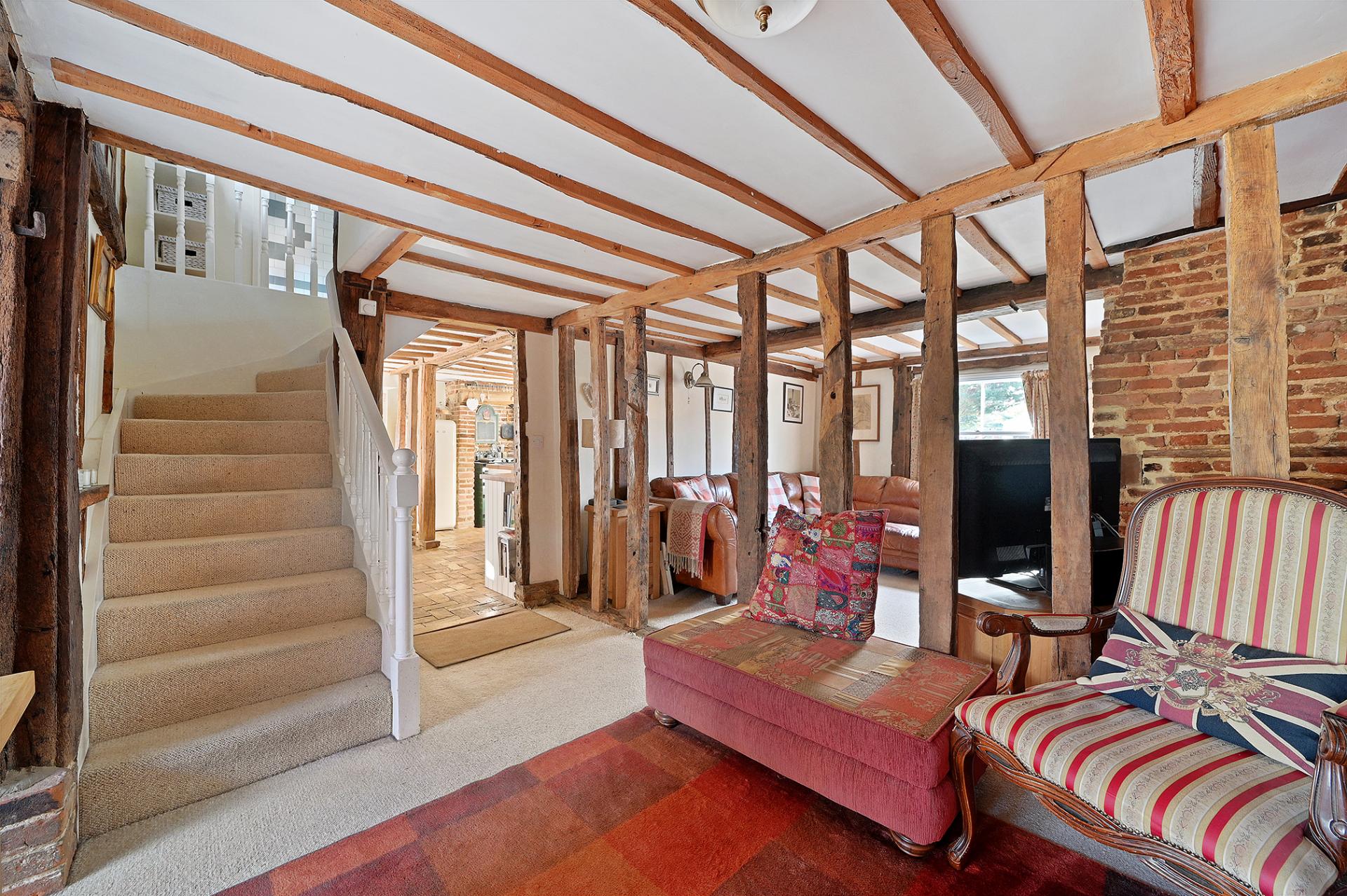 Leading directly from the kitchen into the cosy sitting room and dining room, separated once again by open beams, both rooms have a sense of space, with natural light entering from the front and rear aspects of the cottage. The sitting room boasts an imposing brick feature fireplace with log burner and the bright dining room has double doors which lead out onto the pretty terrace to the rear.