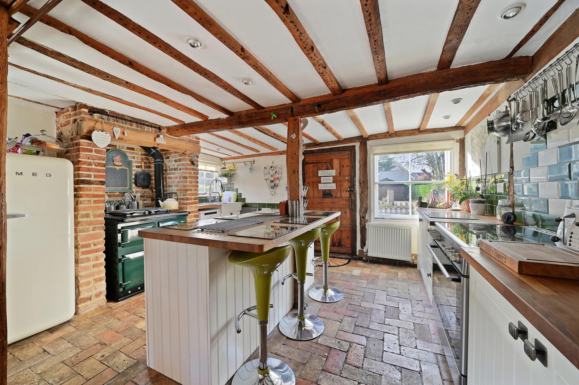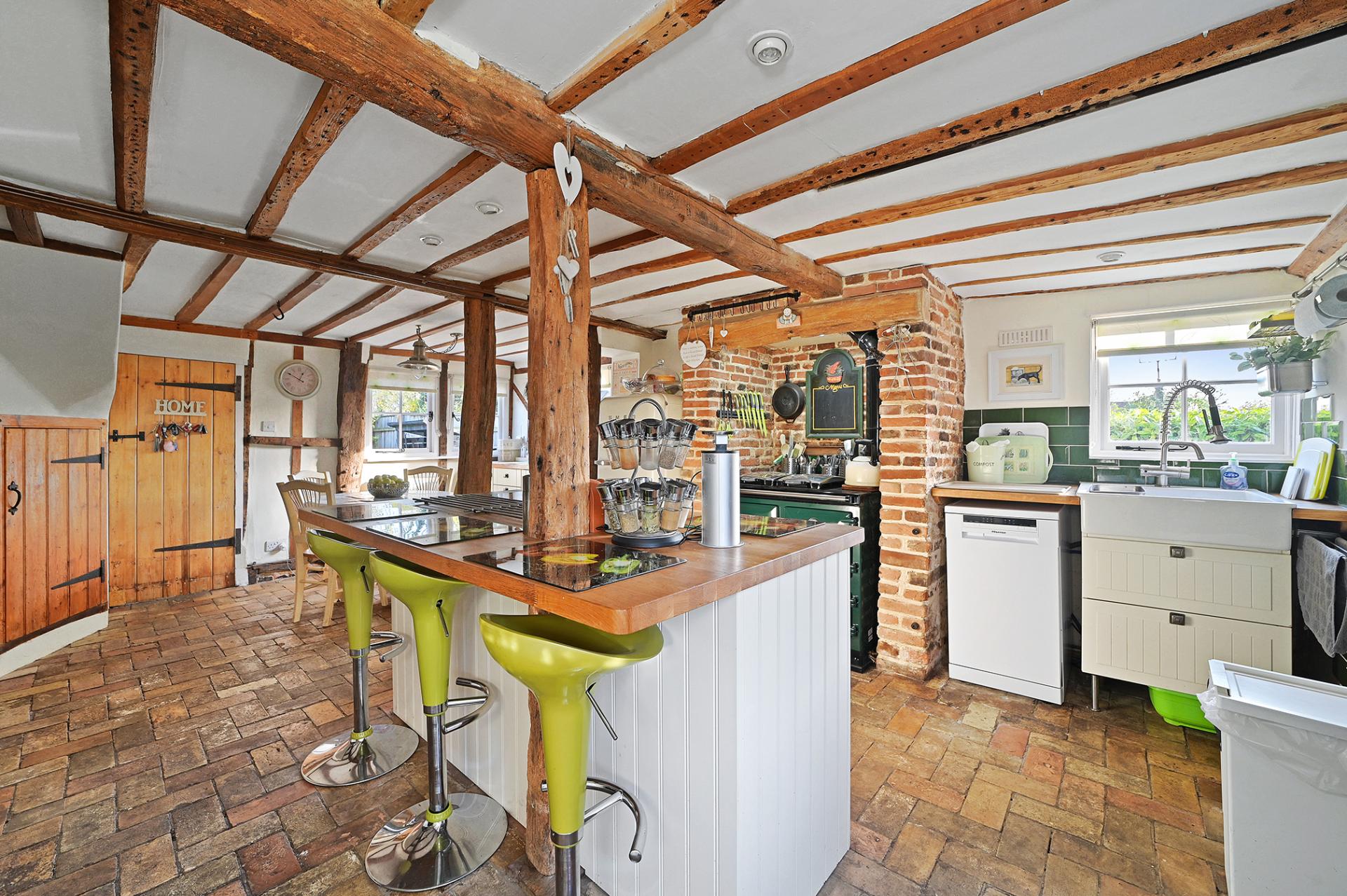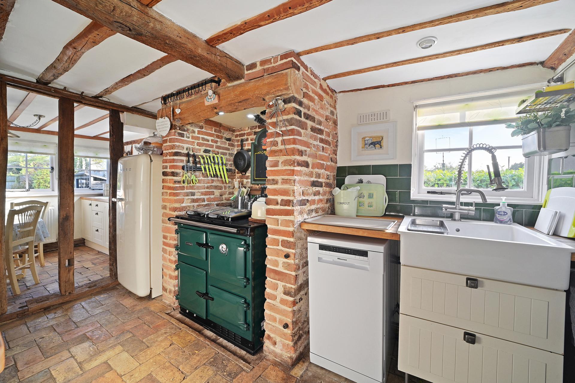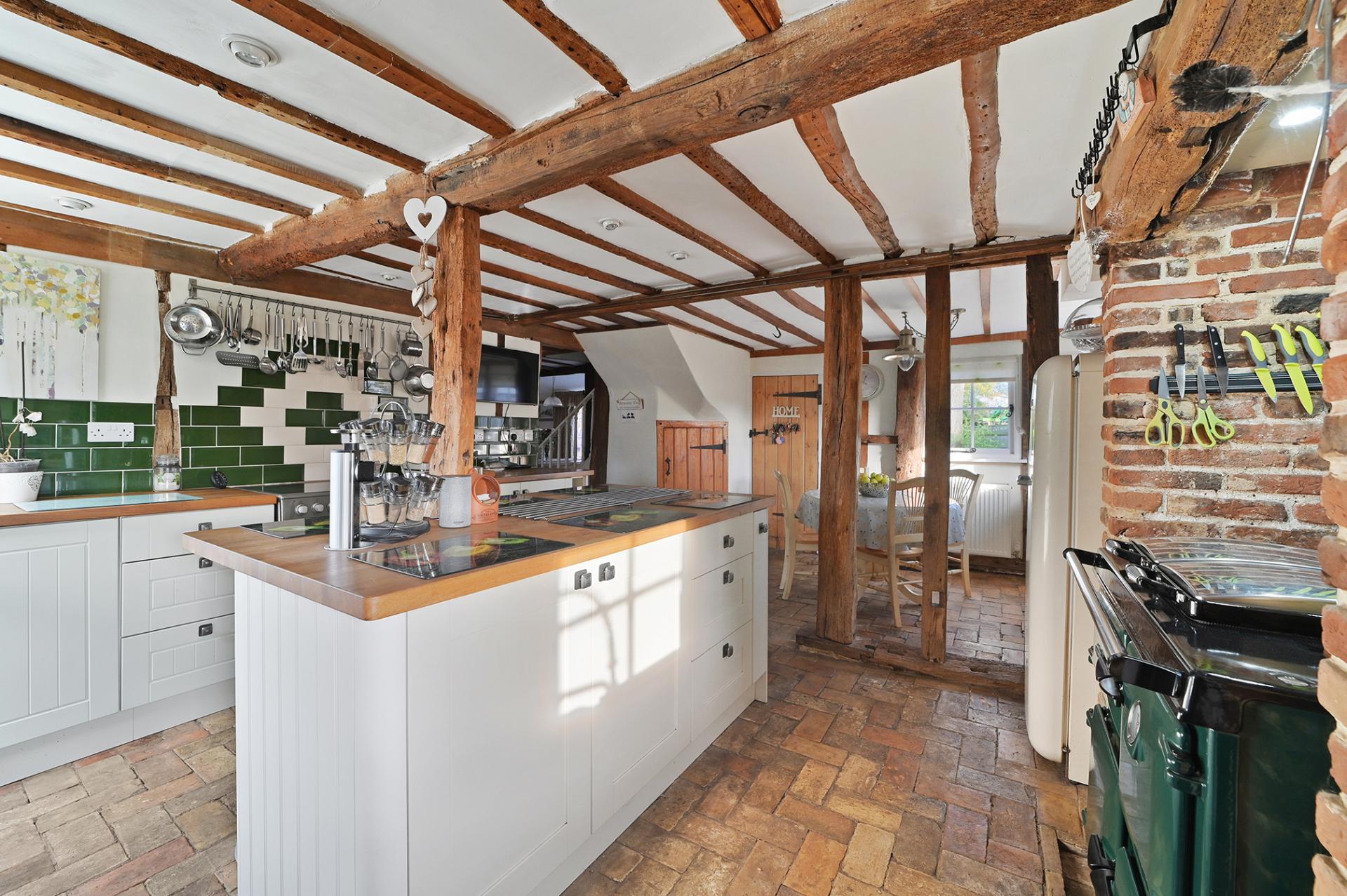 On entering the property, through the utility room and past the guest cloakroom, the house opens out into the most charming country cottage kitchen, with brick paver floor, traditional style Shaker kitchen and the 'must have' Rayburn set into the original kitchen fireplace – which acts as a focal point of the house on cold winter days, whilst also running the heating and hot water system. The kitchen is well-equipped with an additional oven and hob, good storage, a central island with breakfast bar, and a breakfast room area, separated by open beams.