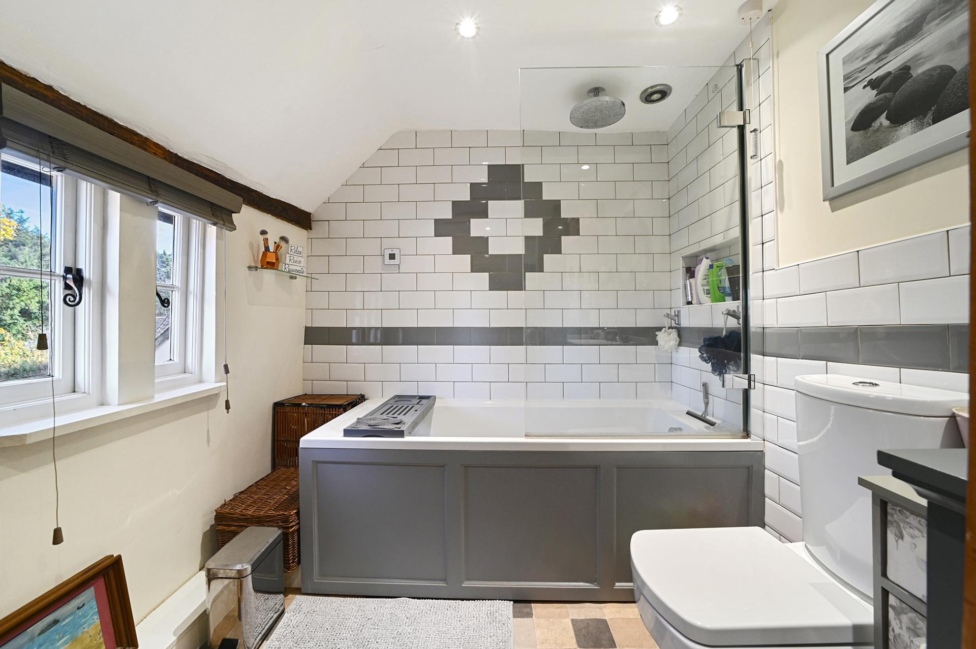Ascending to the first floor are three double bedrooms, all with traditional style doors, Suffolk latches and fitted wardrobe space, and serviced by a smart contemporary family bathroom with over bath shower.