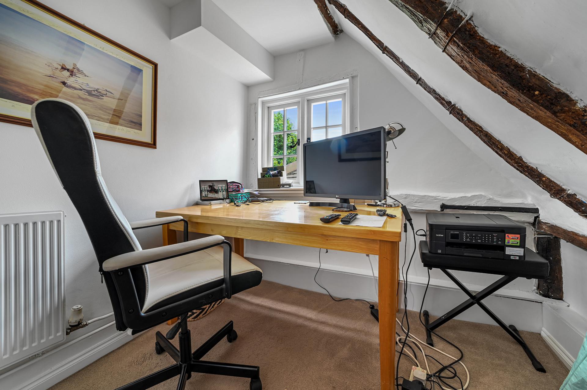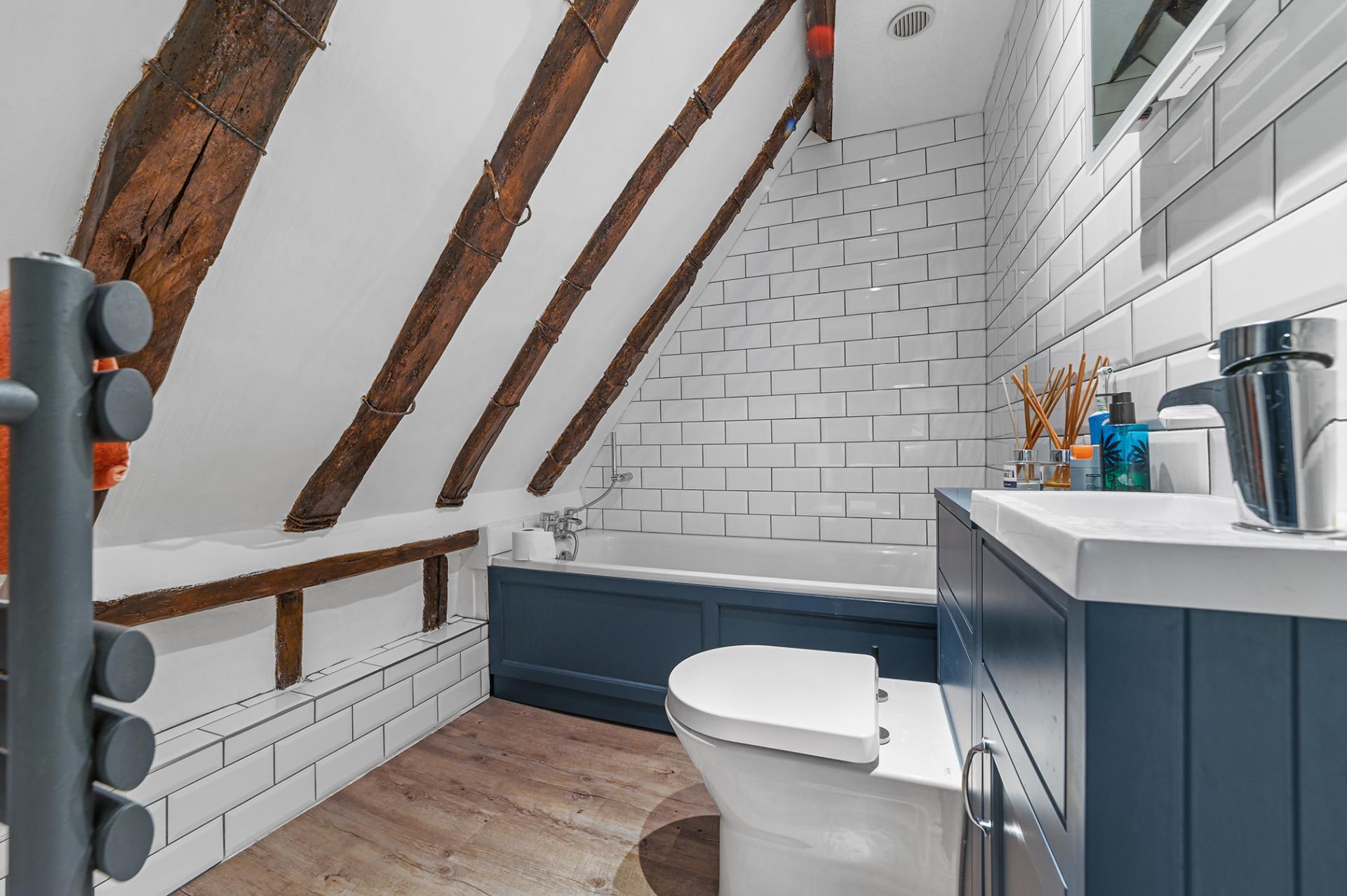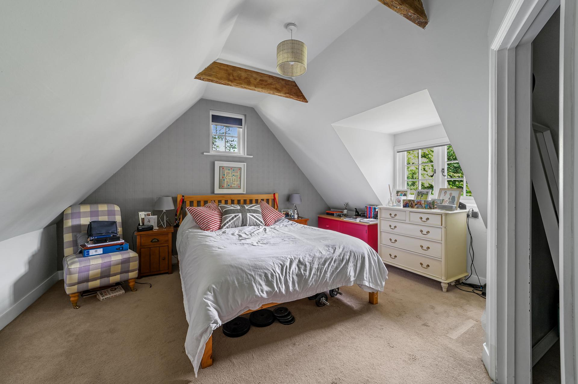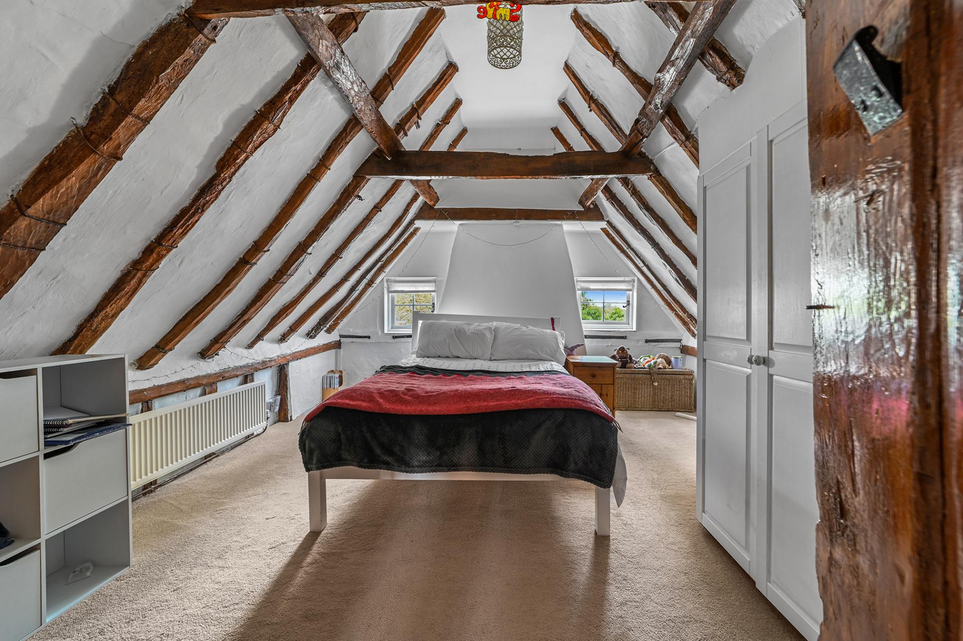 Stairs lead from the dining room to the master bedroom, a spacious double with gorgeous aspect over the large garden and ample built in storage space. Exposed beams lend the room its sense of period charm. Adjacent is the upstairs bathroom with bath and shower attachment. A further generous double bedroom can be found here, again with feature beams and built in storage. Another smaller room, suitable for a home office or nursery completes the rooms in this part of the period home.