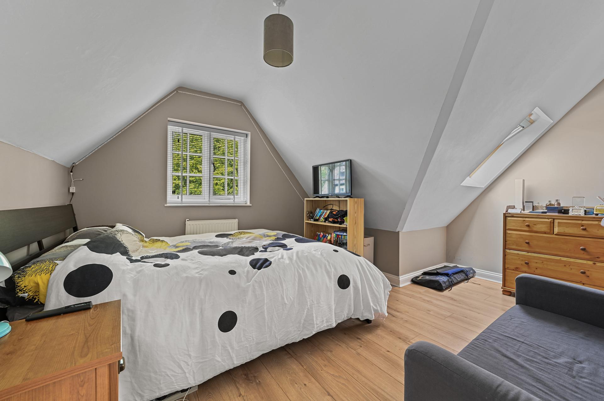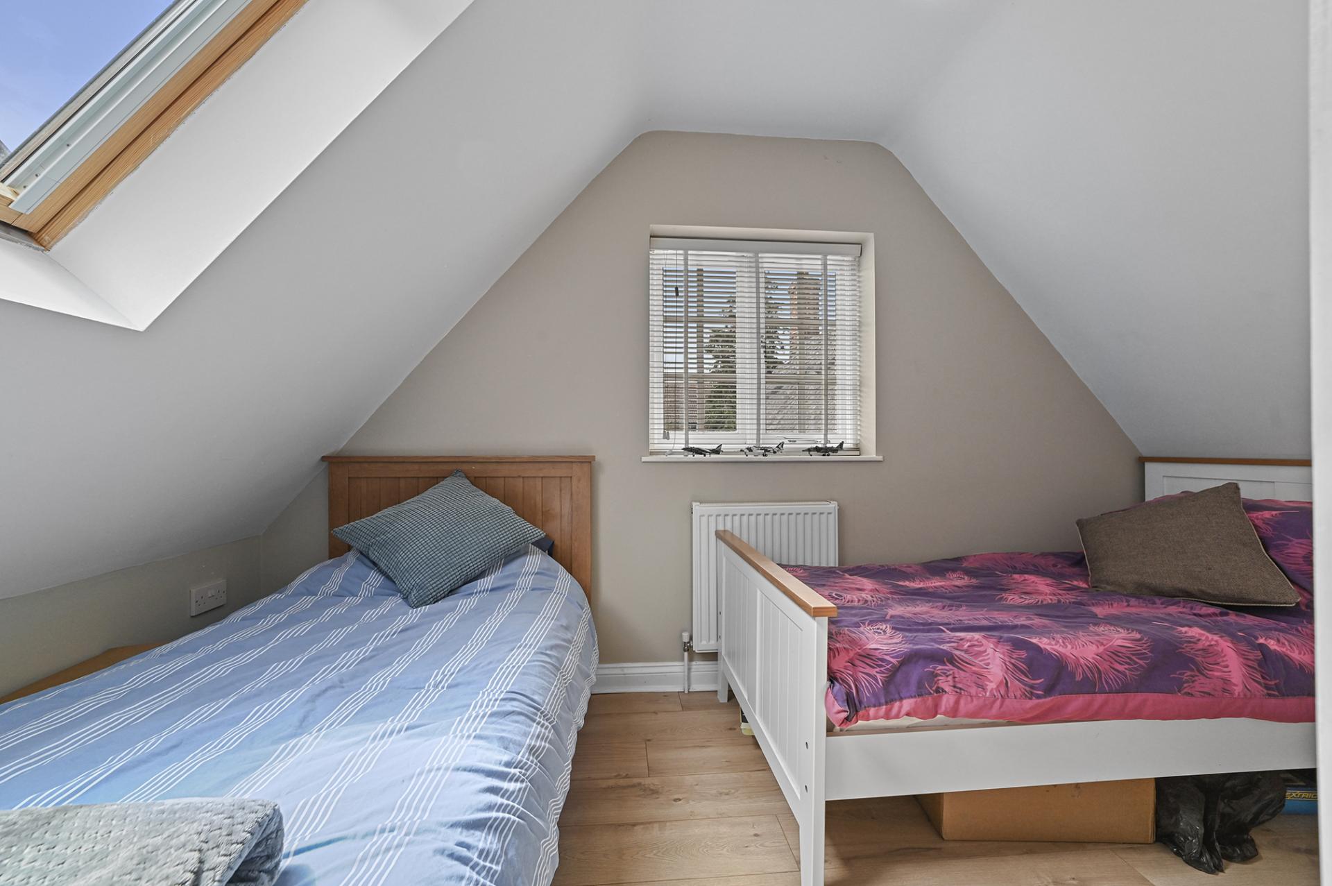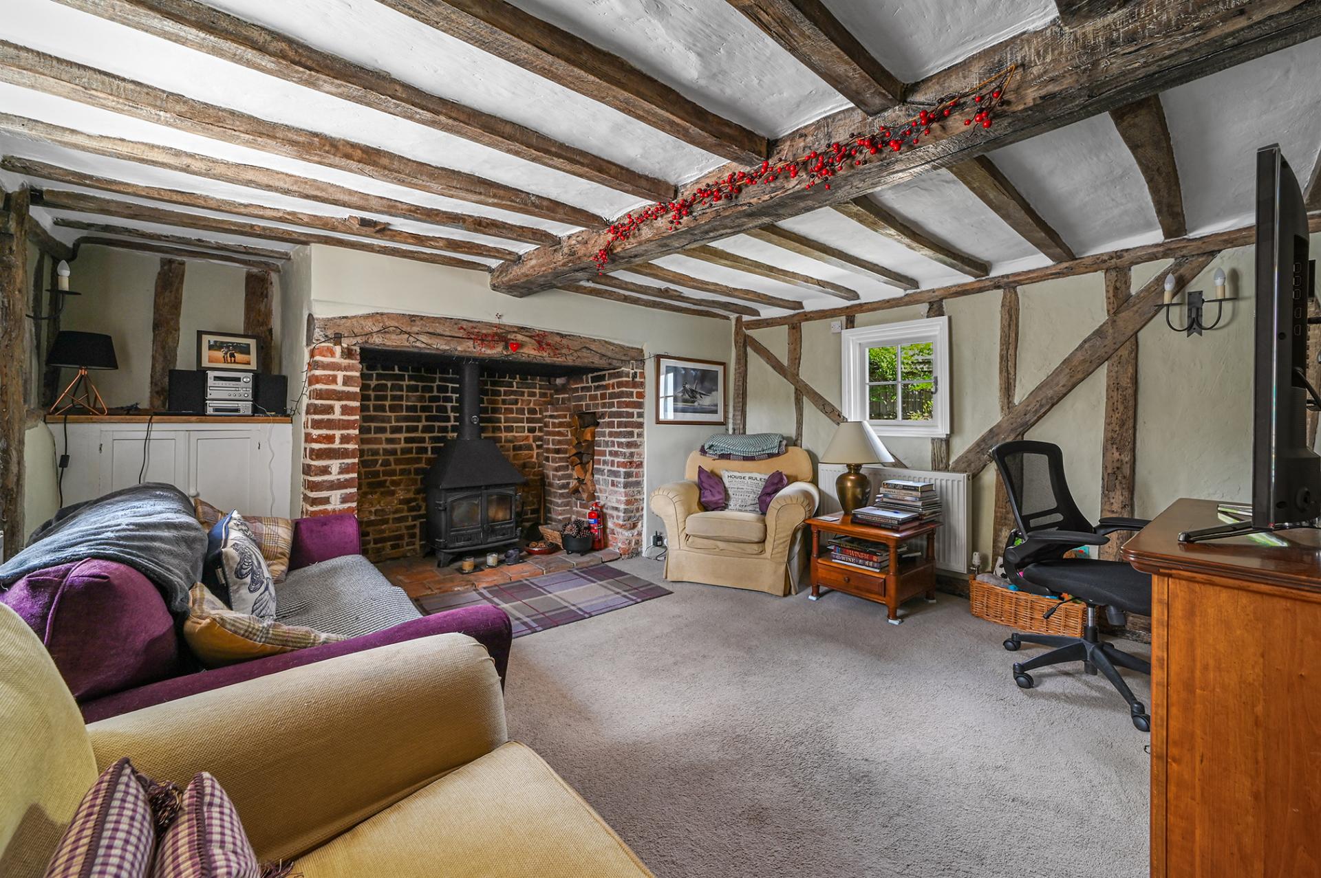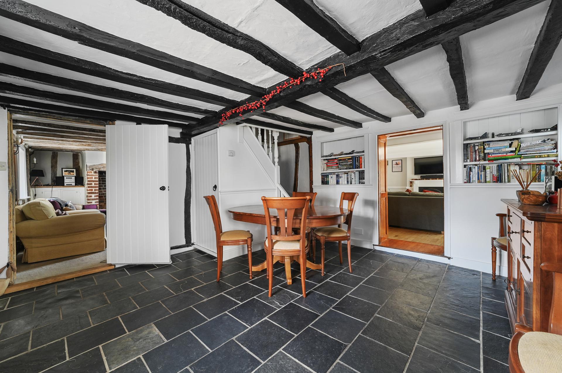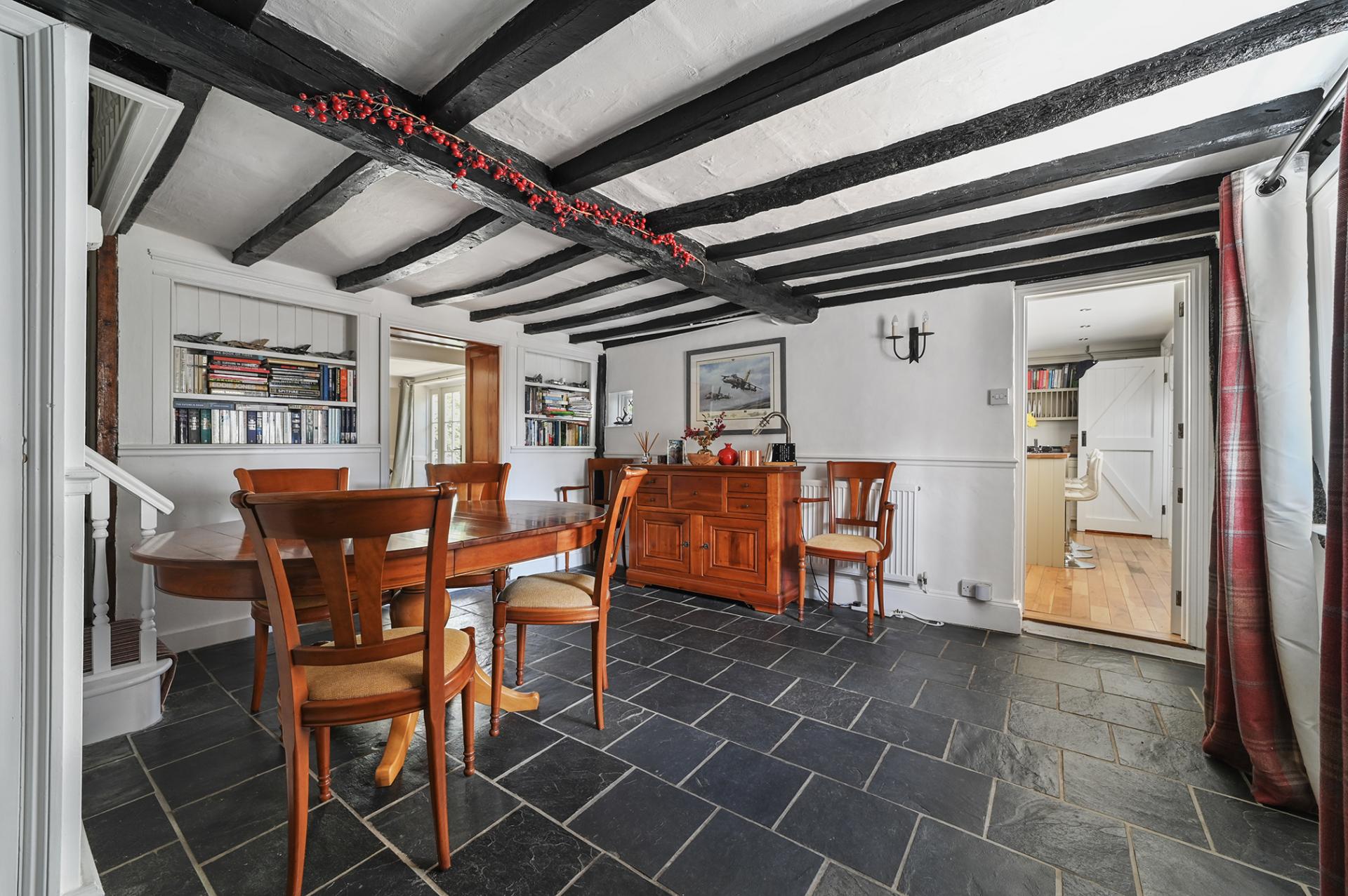 Stairs lead from the dining room to the master bedroom, a spacious double with gorgeous aspect over the large garden and ample built in storage space. Exposed beams lend the room its sense of period charm. Adjacent is the upstairs bathroom with bath and shower attachment. A further generous double bedroom can be found here, again with feature beams and built in storage. Another smaller room, suitable for a home office or nursery completes the rooms in this part of the period home.