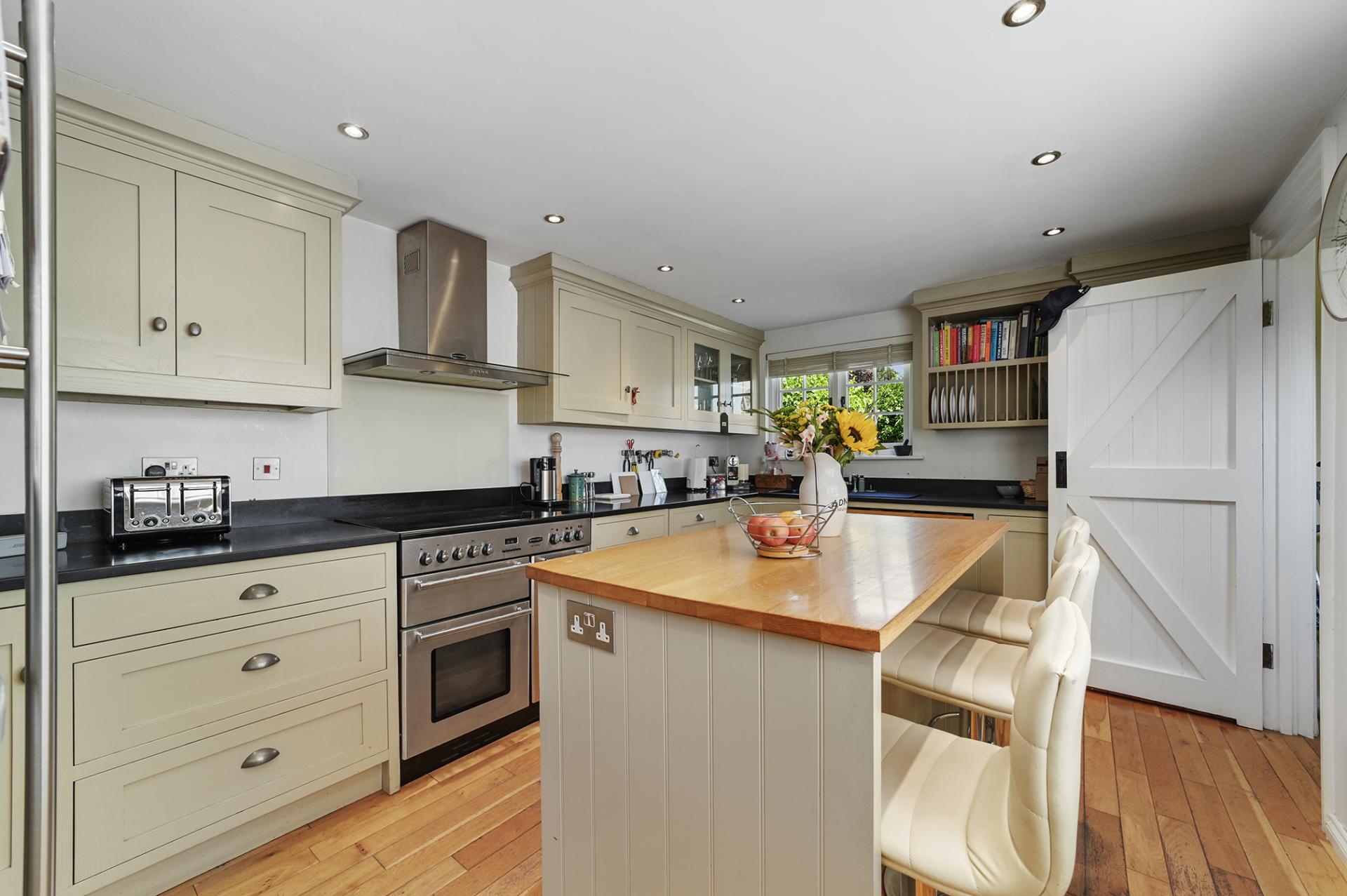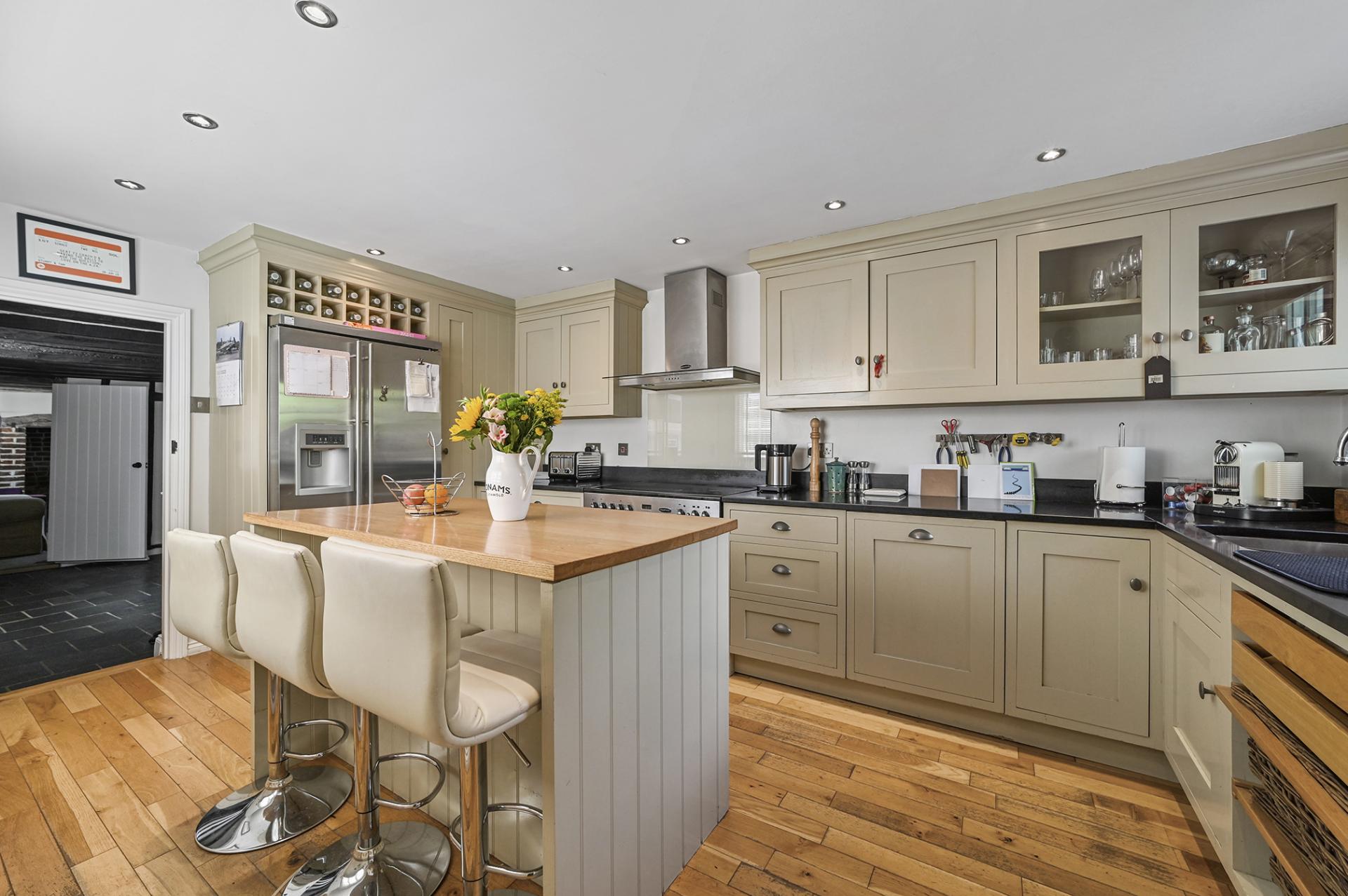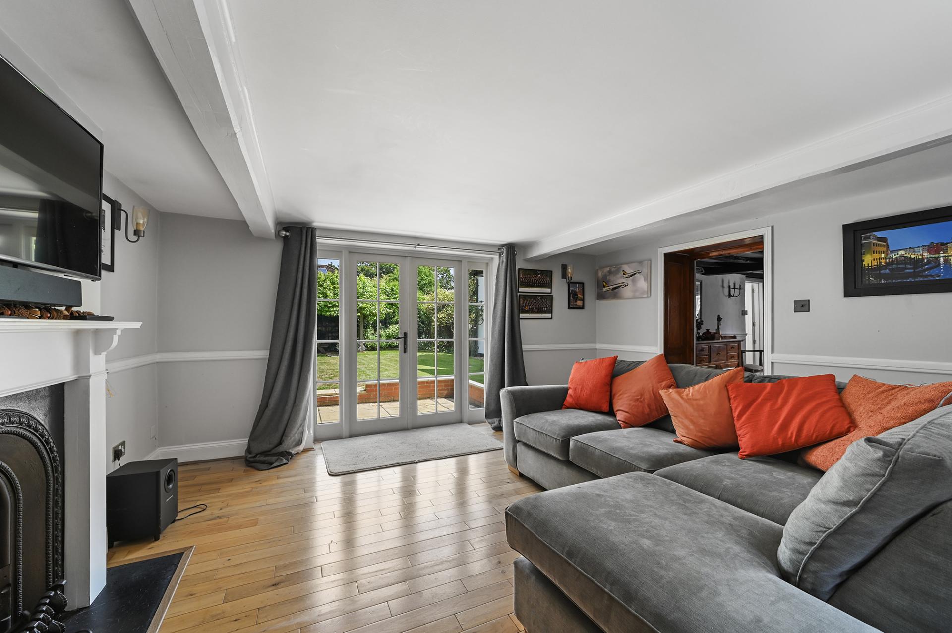 Open the front door and a light and an airy hallway leads to the stunning contemporary kitchen to the left and on to a spacious, modern family bathroom with large walk-in shower, utility room and separate stairs to two generous double bedrooms. The kitchen is bright, light and extremely well appointed. A large island in the centre with seating for three or more people, renders this the true "heart of the house". The shaker-style built-in units and modern, neutral tones, which contrast perfectly with the dark granite work surfaces make this a truly stylish and lovely space. The kitchen leads in to one of three large reception rooms, currently in use as a family dining room. Warm and atmospheric, the room is traditional in feel, echoing the historic roots of the property and features a striking, dark grey stone floor. From here, enter another of the reception rooms, a more modern, contemporary space perfect for a games room, living room or for entertaining, especially with its double French doors that open out onto the terrace and charming garden. The third reception room also leads off the dining room and is used as a "snug" by the current owners. This wonderful cozy space features a lovely Inglenook fireplace and working wood burning stove and is the ideal space for curling up with a good book!