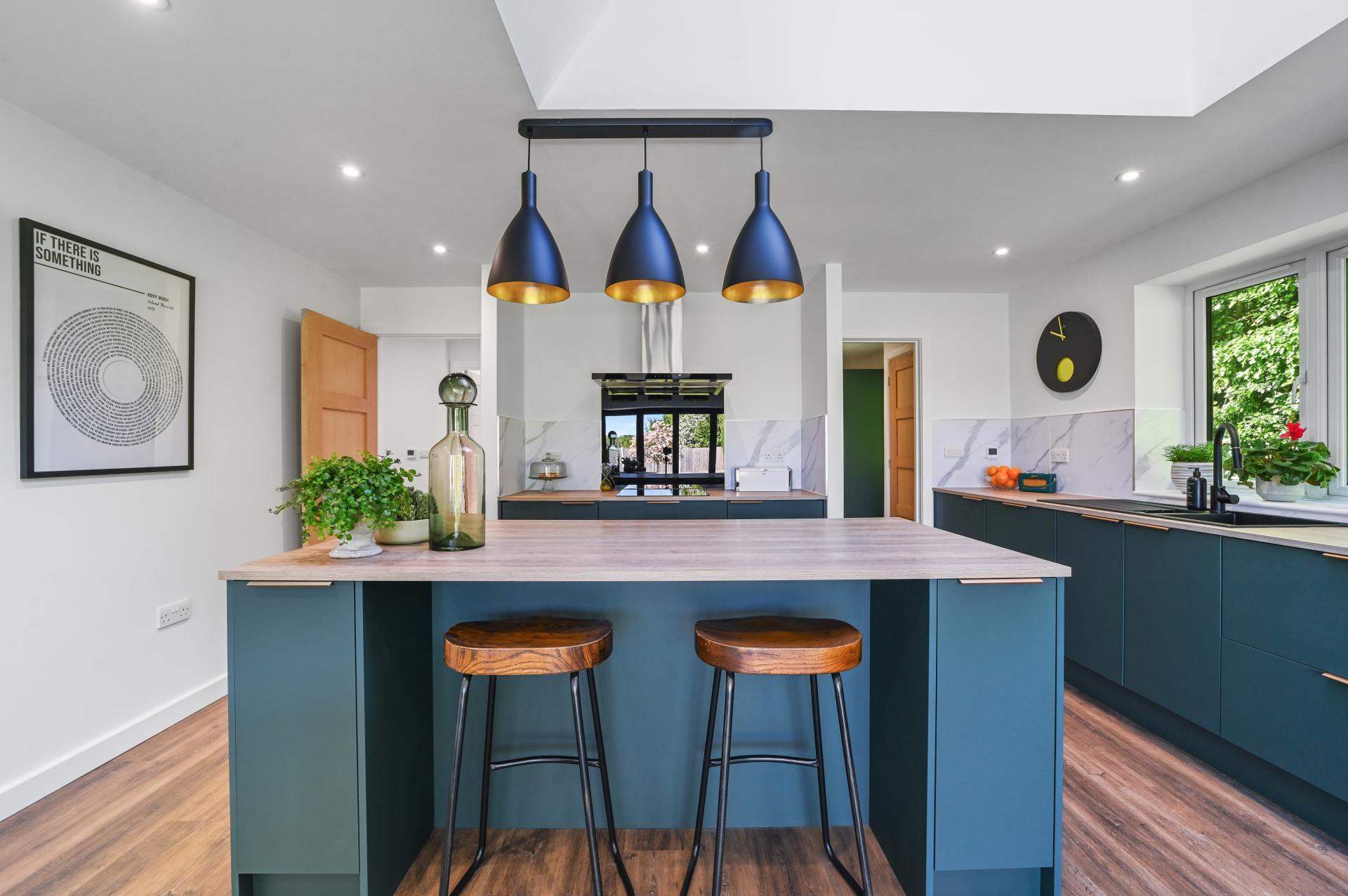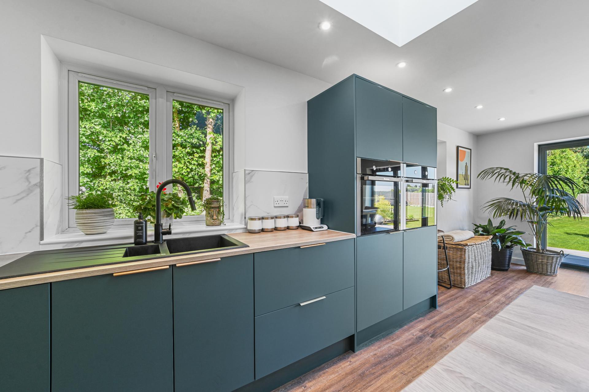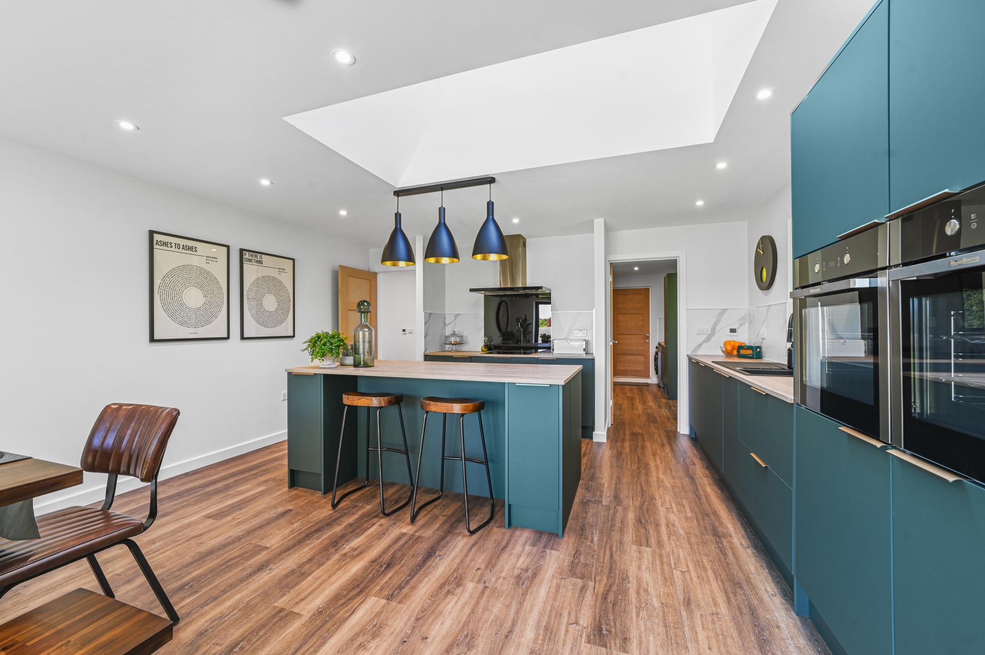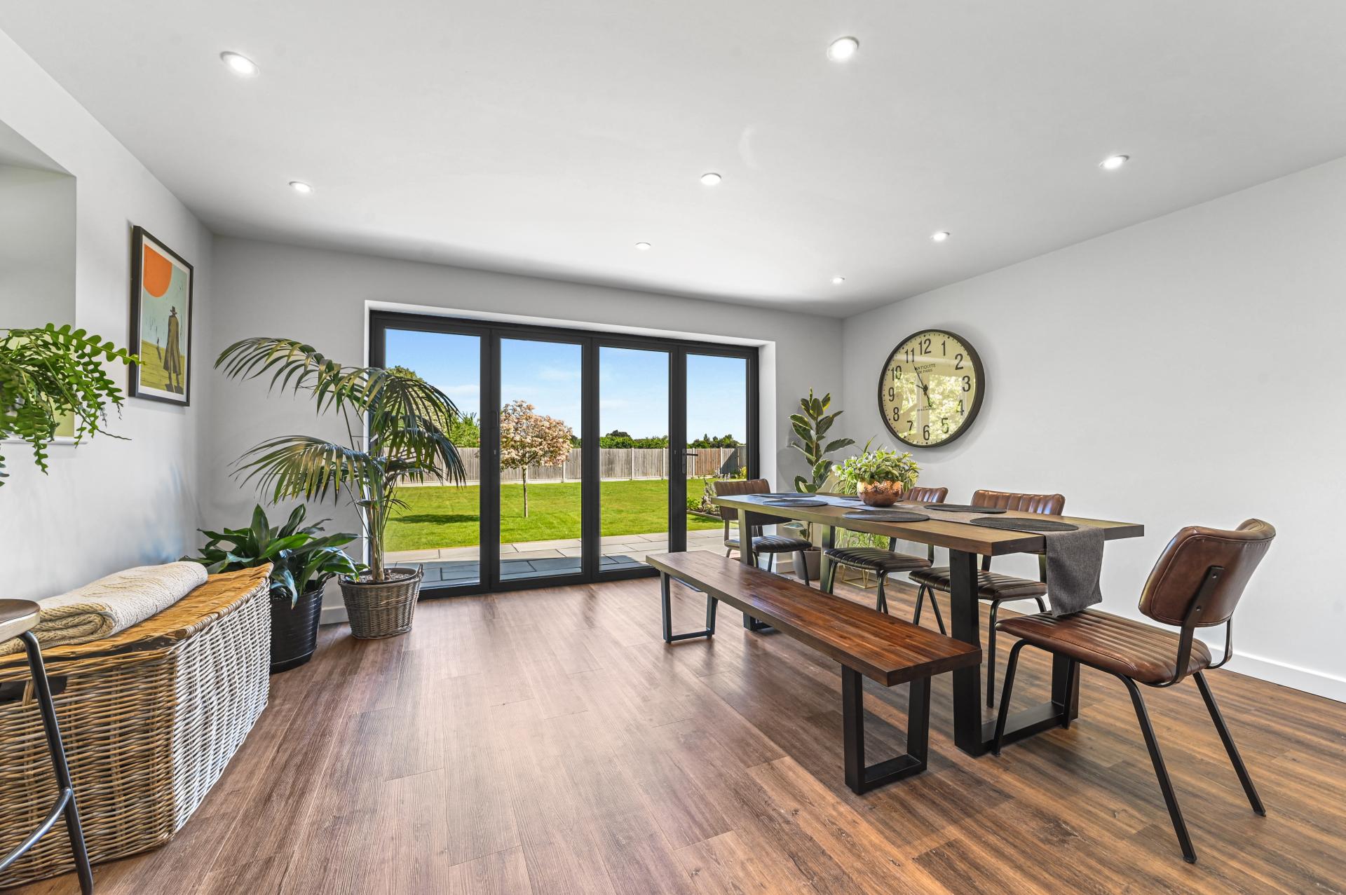 The heart of the home, a generously proportioned kitchen/dining room, seamlessly combines modern gourmet functionality with spacious dining, catering to a truly indulgent culinary experience. The bi-fold doors ensure that the kitchen is light and airy, and opens to a modern patio area, ideal for creating the ideal inside/outside experience.