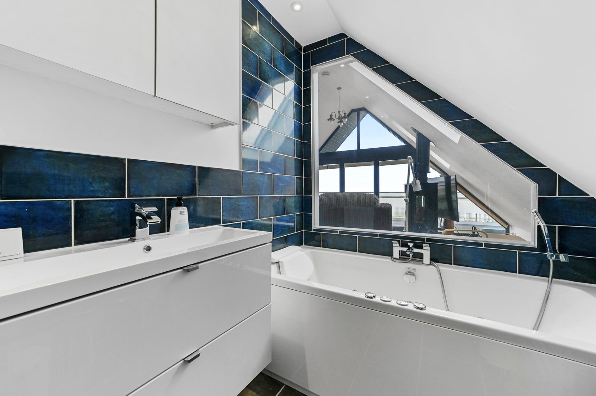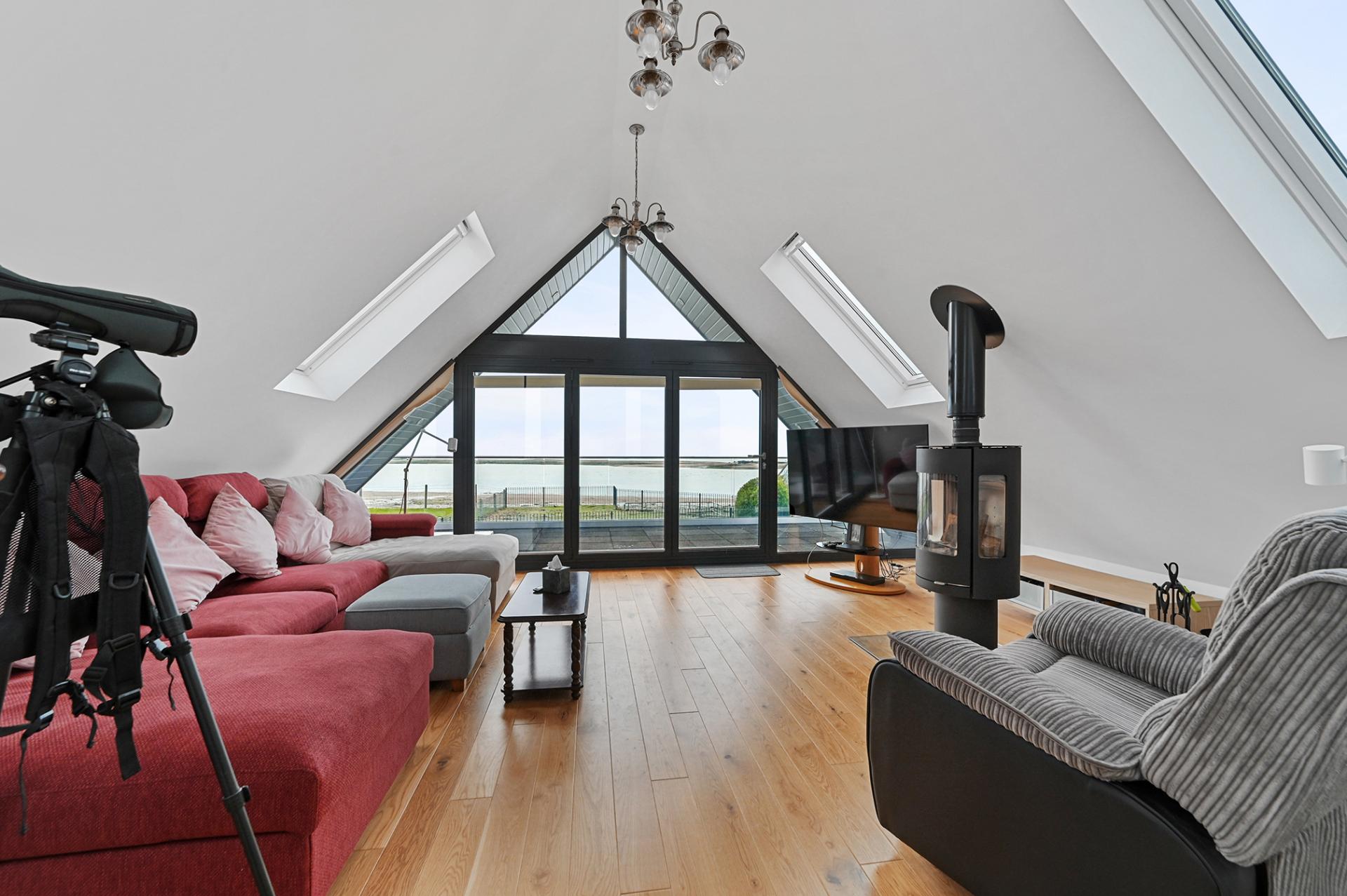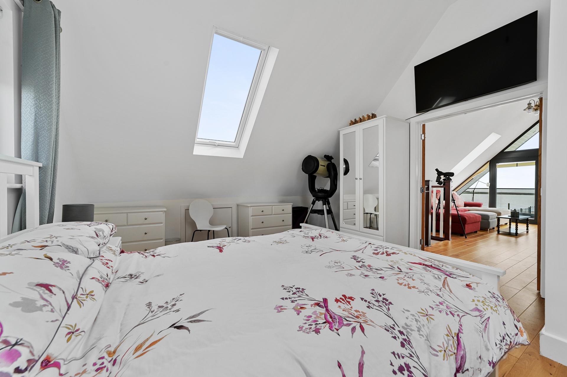 Presented in immaculate condition, this property has been designed to make the most of its prominent position, with a stunning open plan sitting room located on the first floor. Floor to ceiling glass bi-fold doors lead out to a magnificent balcony overlooking the bay and, coupled with four huge roof lights, the design allows light to flood in from every angle all year round. A feature log burner brings warmth to the room on stormy winter days. Large double doors lead to the master suite, affording views of the sea from the bedroom, and the quirky ensuite bathroom has been installed with an internal switchable glass window, again allowing views of the sea from the bath, or privacy when required.