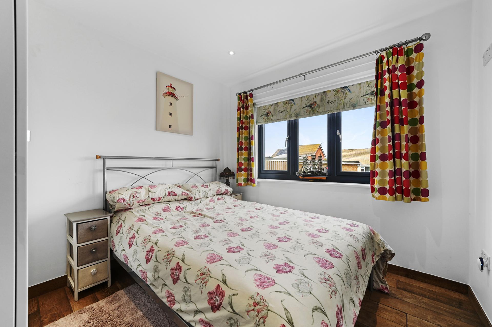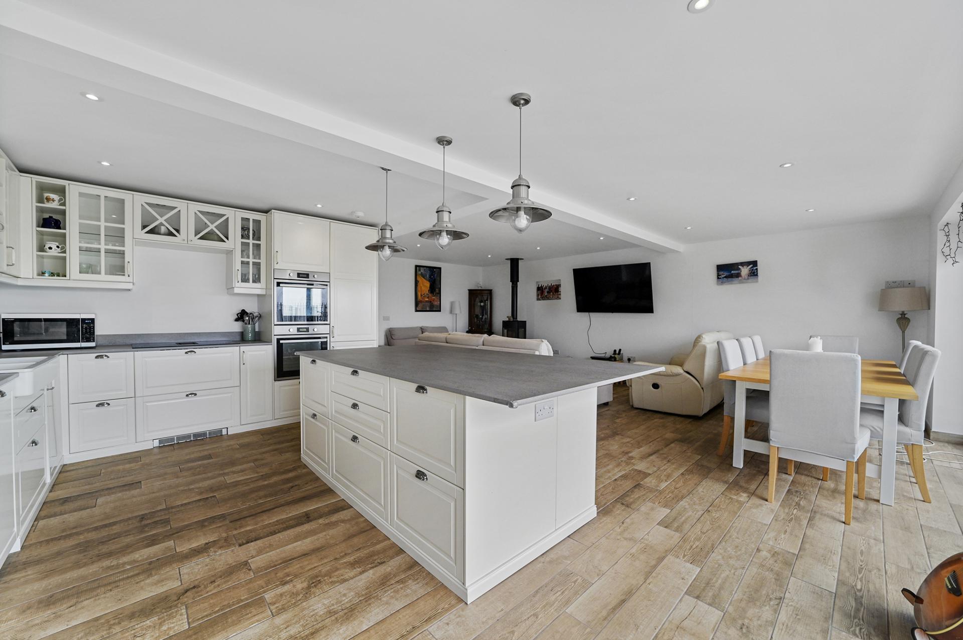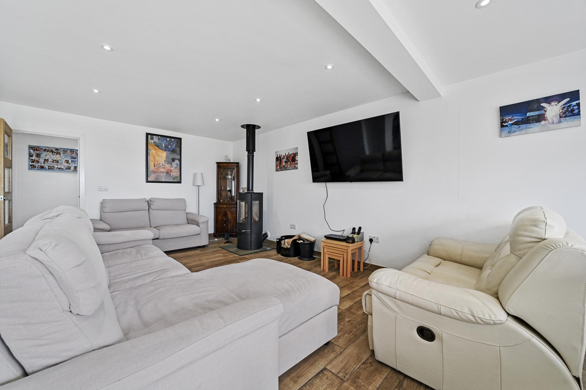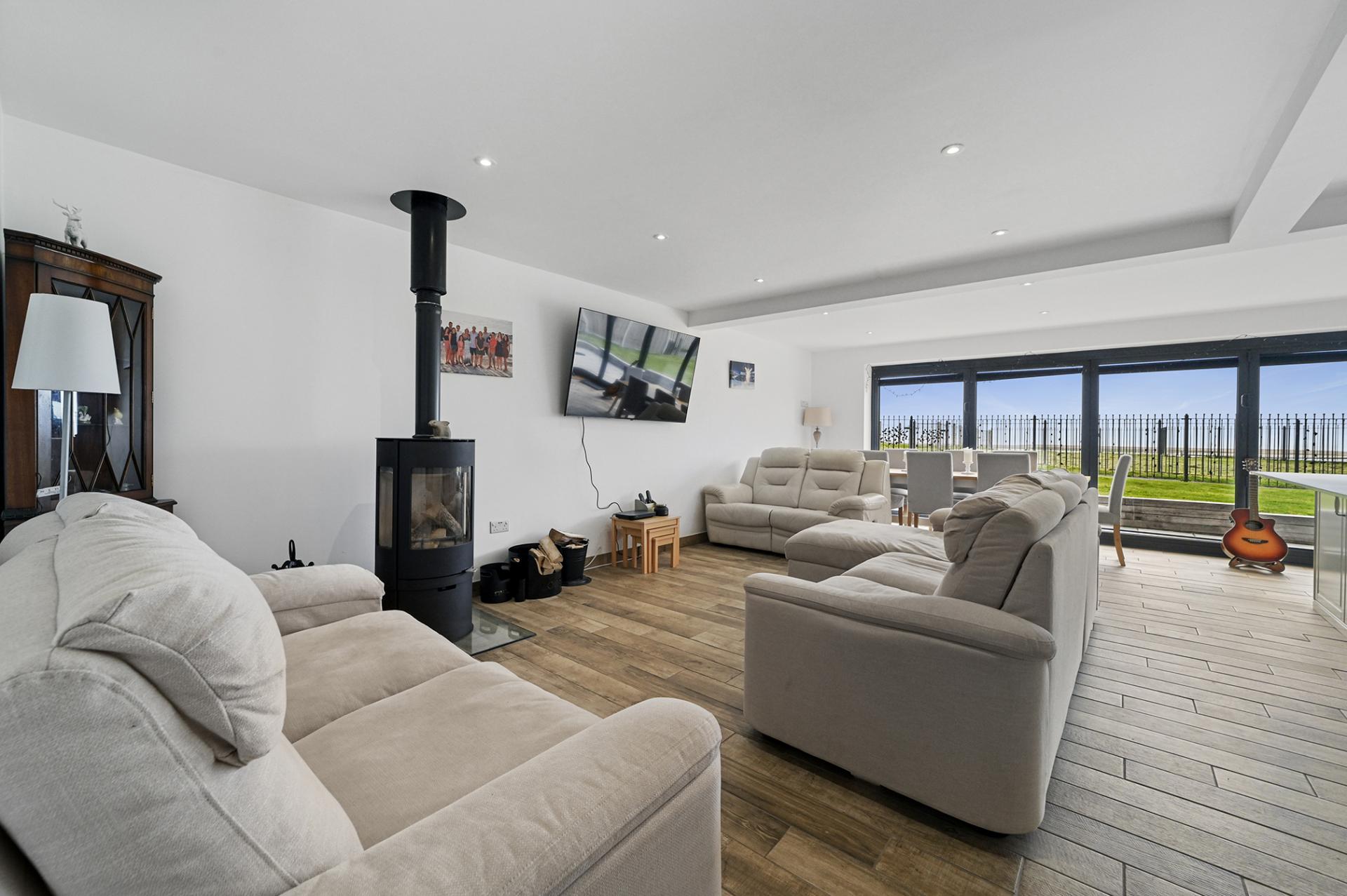 Presented in immaculate condition, this property has been designed to make the most of its prominent position, with a stunning open plan sitting room located on the first floor. Floor to ceiling glass bi-fold doors lead out to a magnificent balcony overlooking the bay and, coupled with four huge roof lights, the design allows light to flood in from every angle all year round. A feature log burner brings warmth to the room on stormy winter days. Large double doors lead to the master suite, affording views of the sea from the bedroom, and the quirky ensuite bathroom has been installed with an internal switchable glass window, again allowing views of the sea from the bath, or privacy when required.