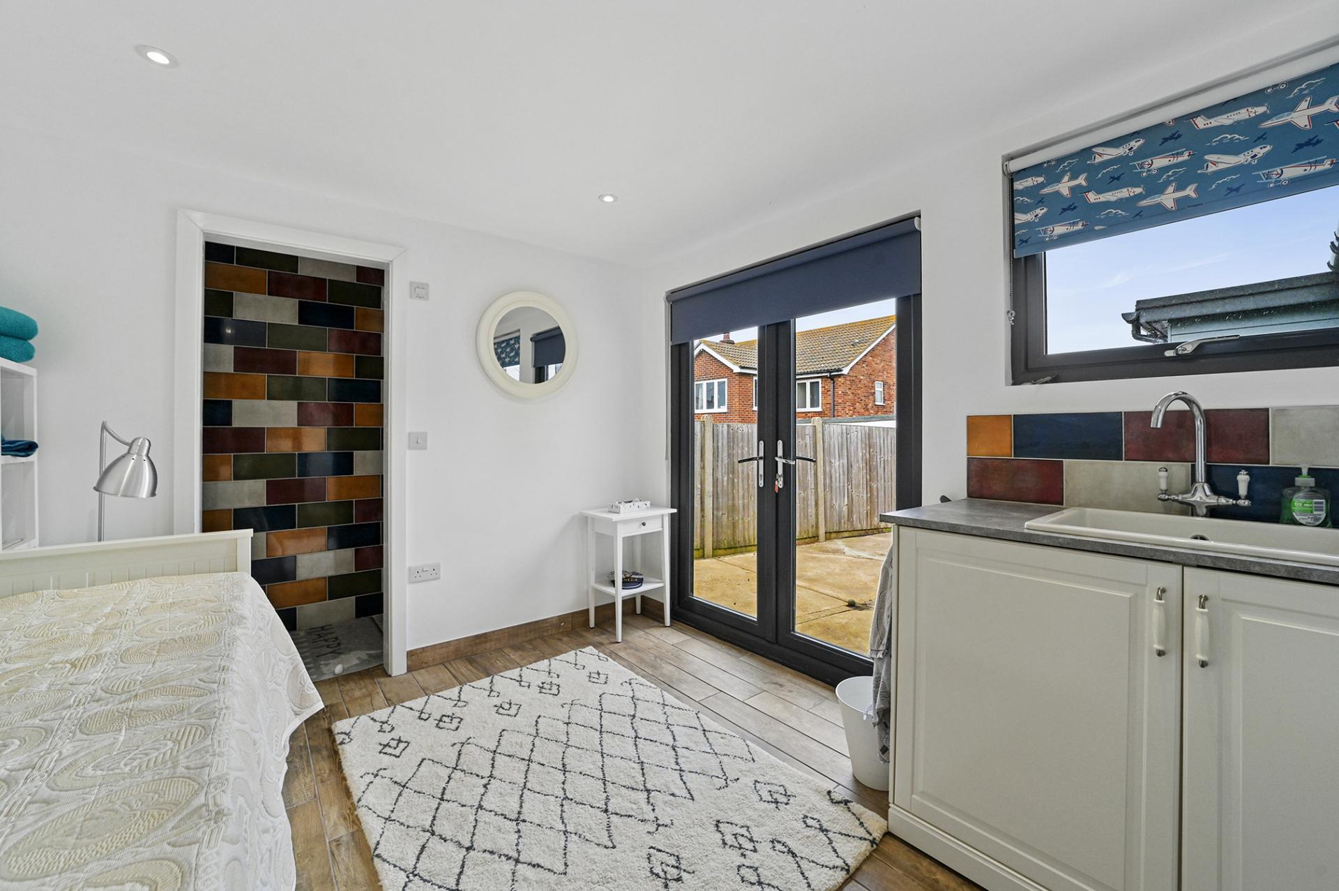 Externally, the property benefits from a block paved front driveway with parking for a number of vehicles, including a single garage. To the rear, the garden is split into two parts by a small footpath with the further most area allowing private access directly onto the beach.