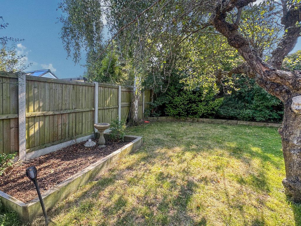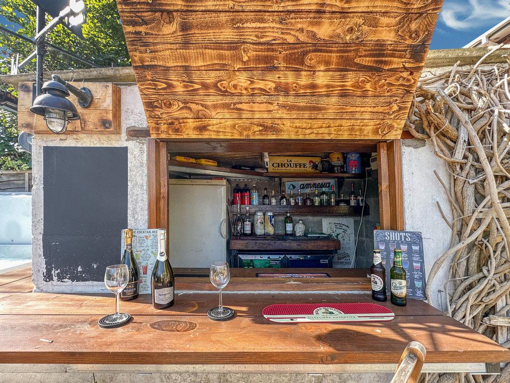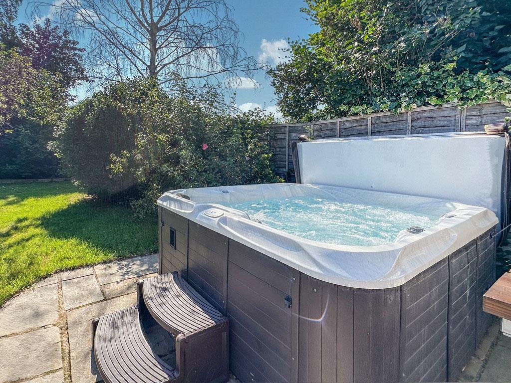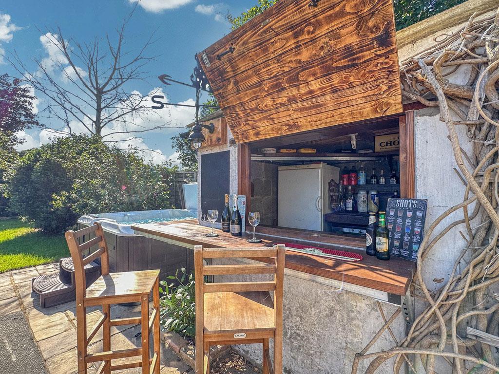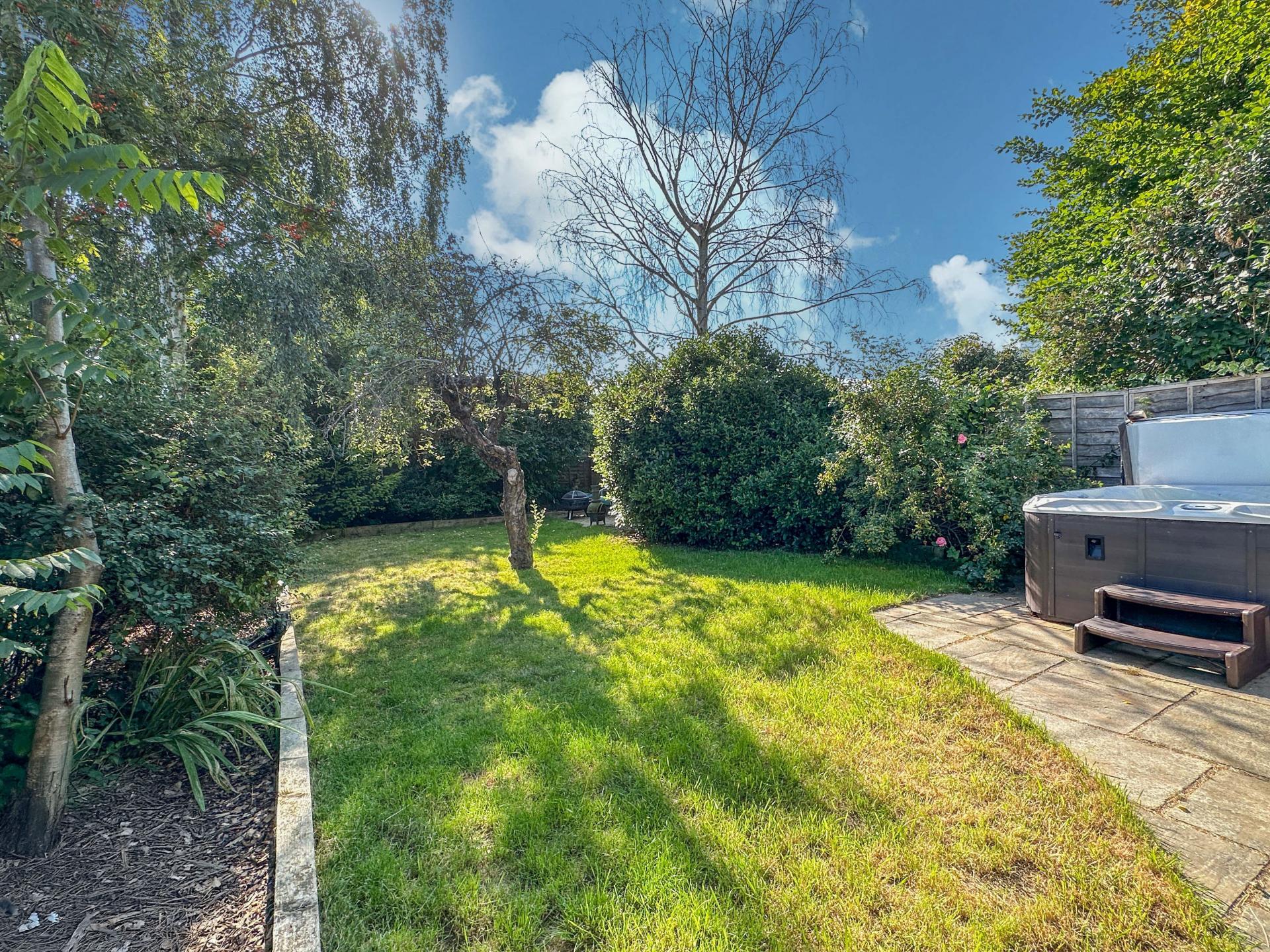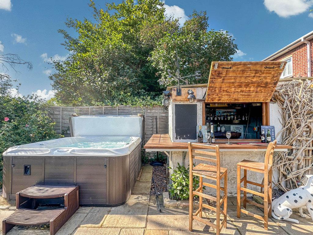 A unique feature of the garden is the custom bar area, ideal for social gatherings and enjoying summer evenings with friends and family. Adjacent to the bar is a dedicated hot tub area, adding a touch of luxury for unwinding after a long day. The garden's layout allows ample space for outdoor furniture, perfect for dining and lounging.