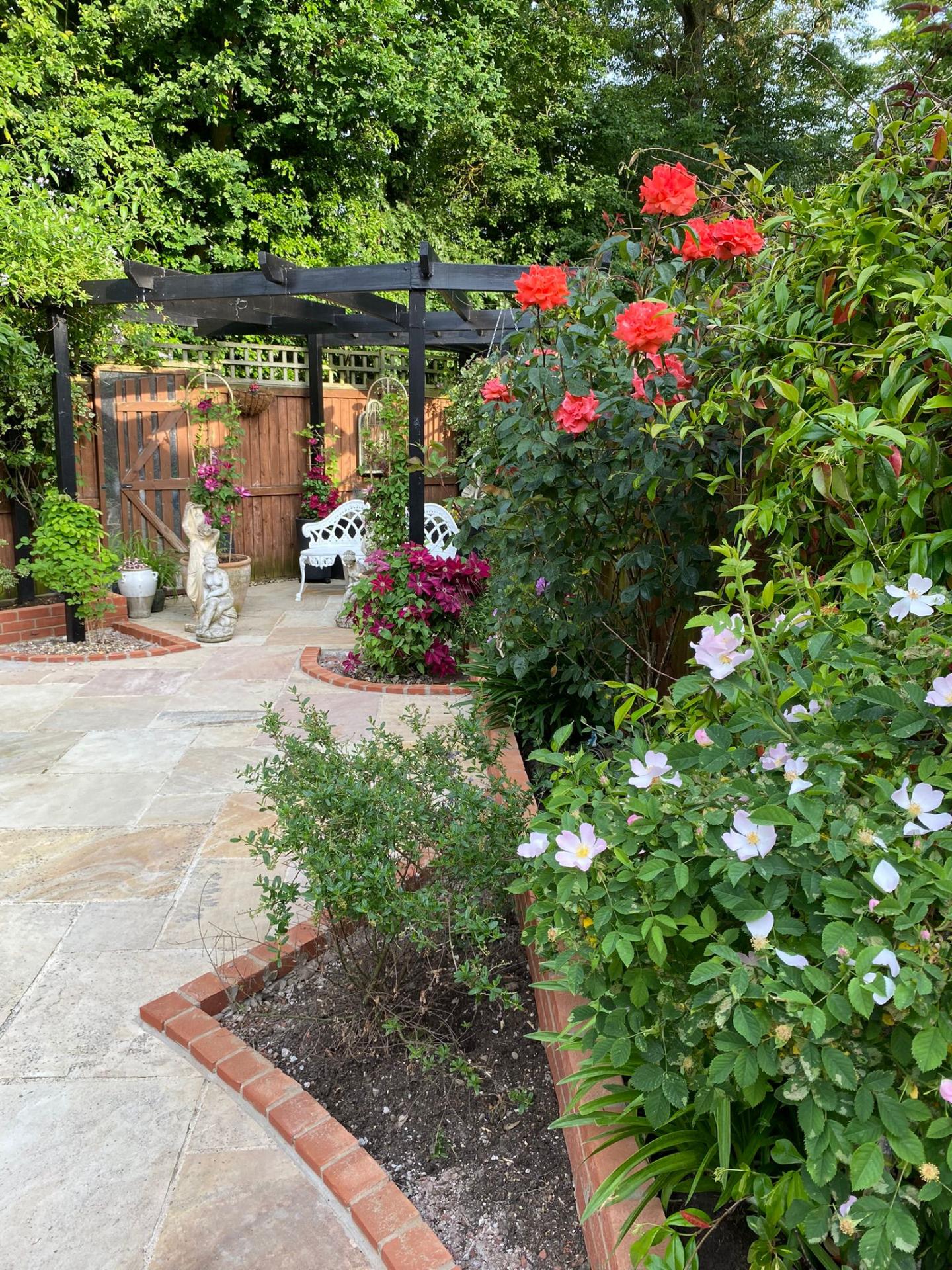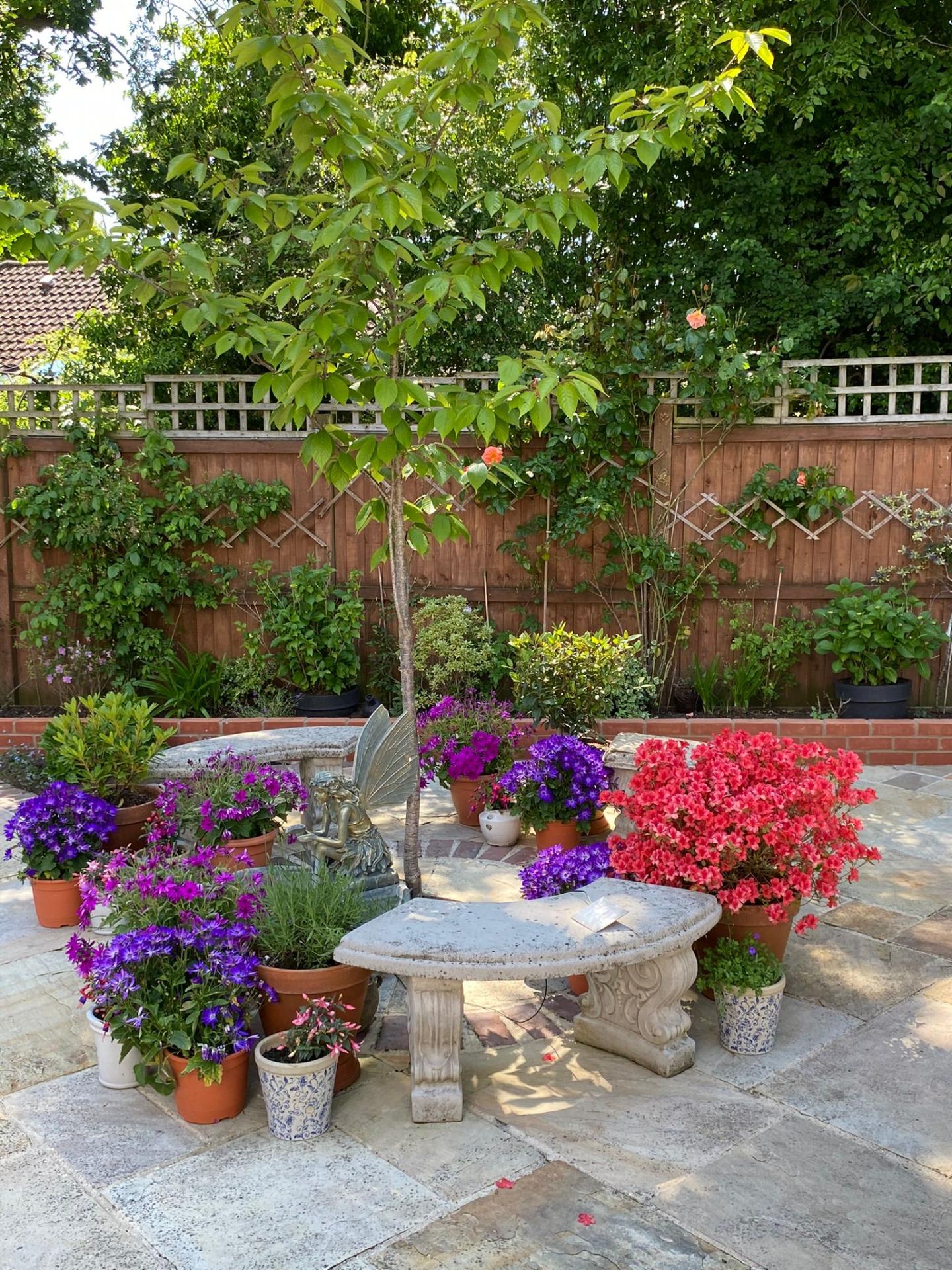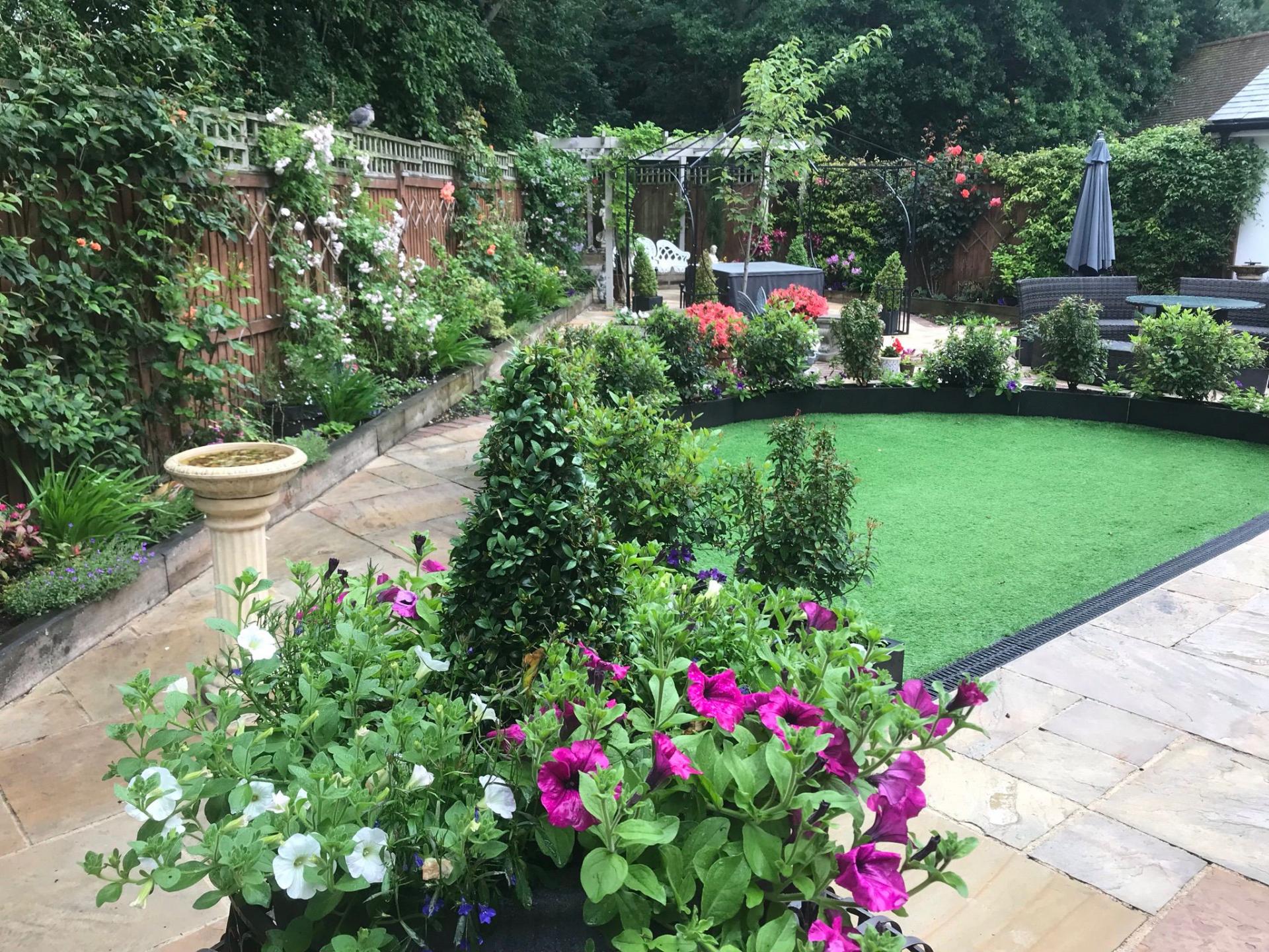 The rear garden is fully enclosed, ensuring privacy, and features an artificial lawn, a variety of small trees, plants, and shrubs, as well as a patio area.