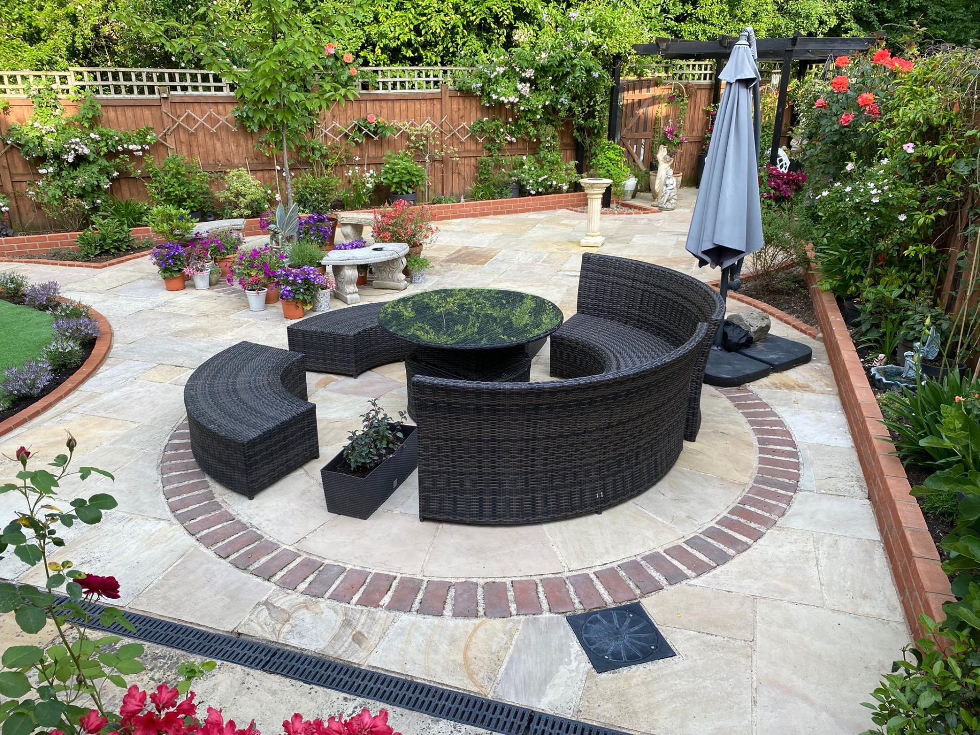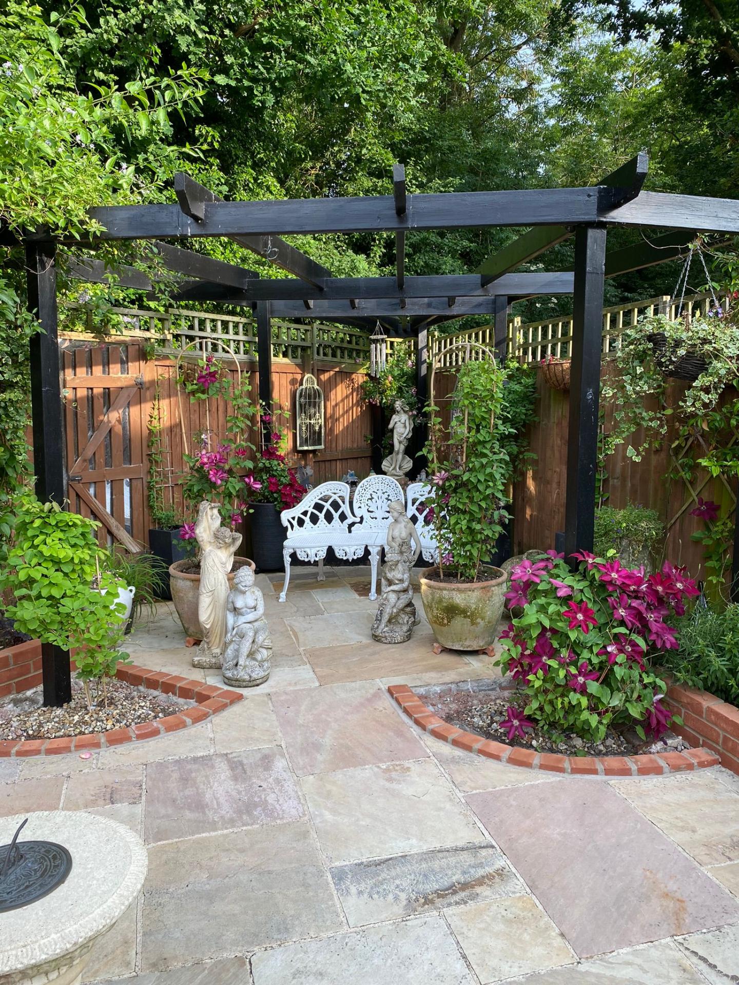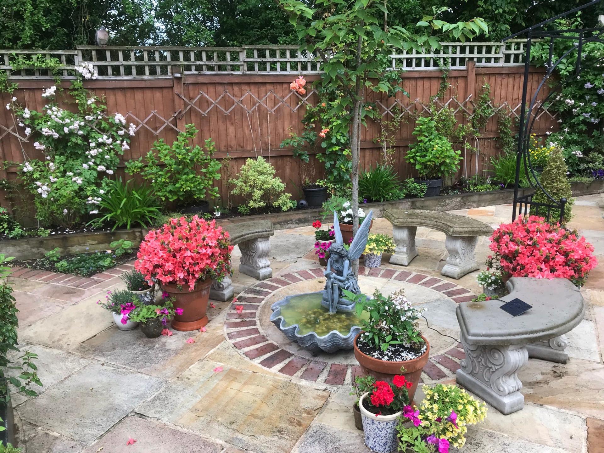 The rear garden is fully enclosed, ensuring privacy, and features an artificial lawn, a variety of small trees, plants, and shrubs, as well as a patio area.