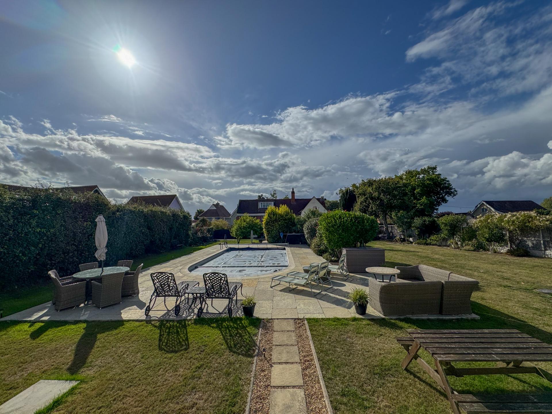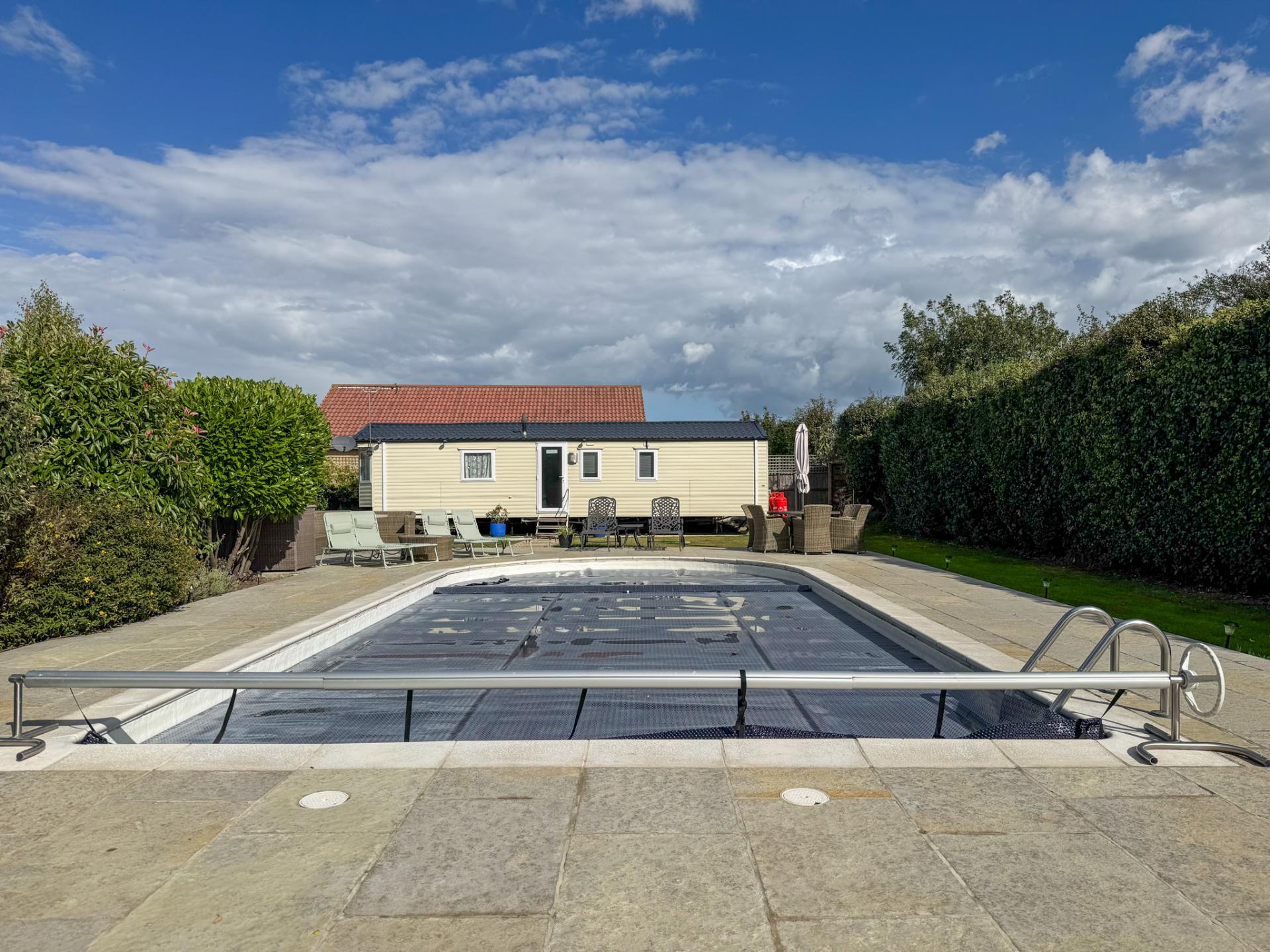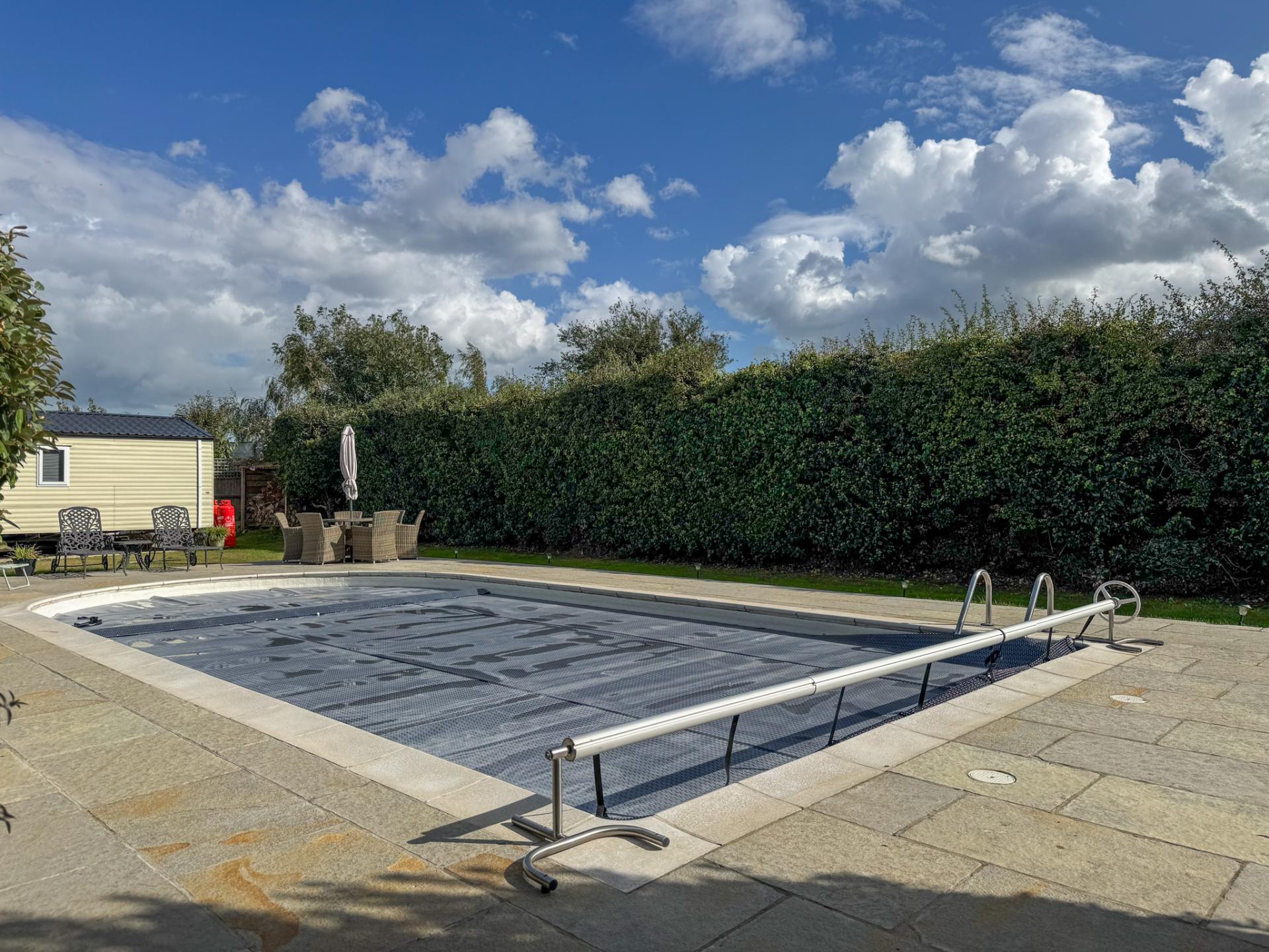 The heated swimming pool includes a pump room with a filtration system and heating, which can be powered by an air source heat pump or the fitted boiler.