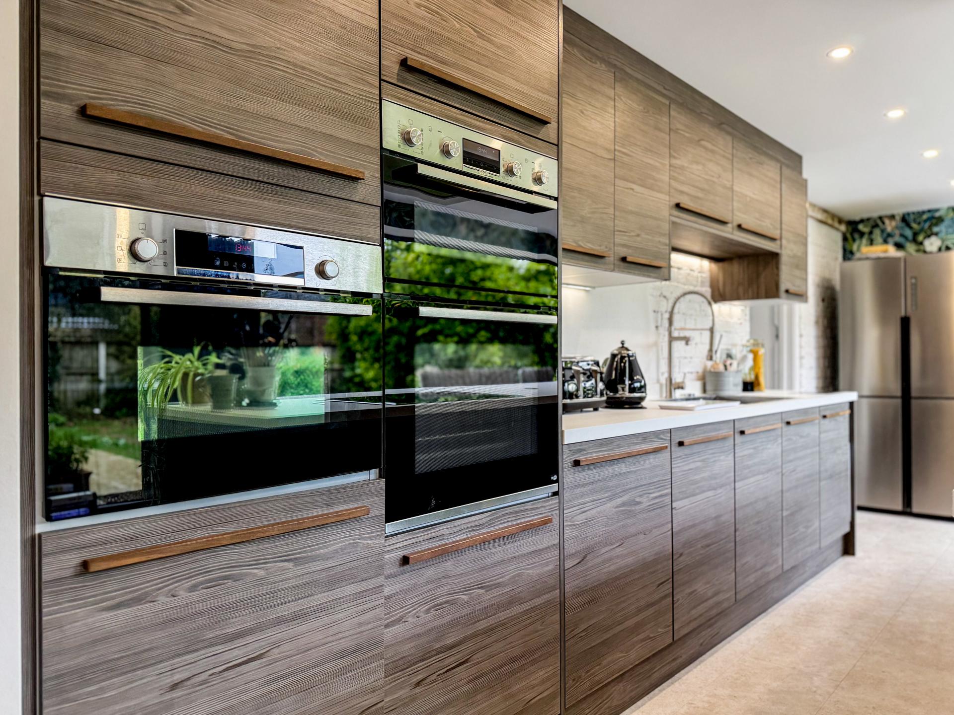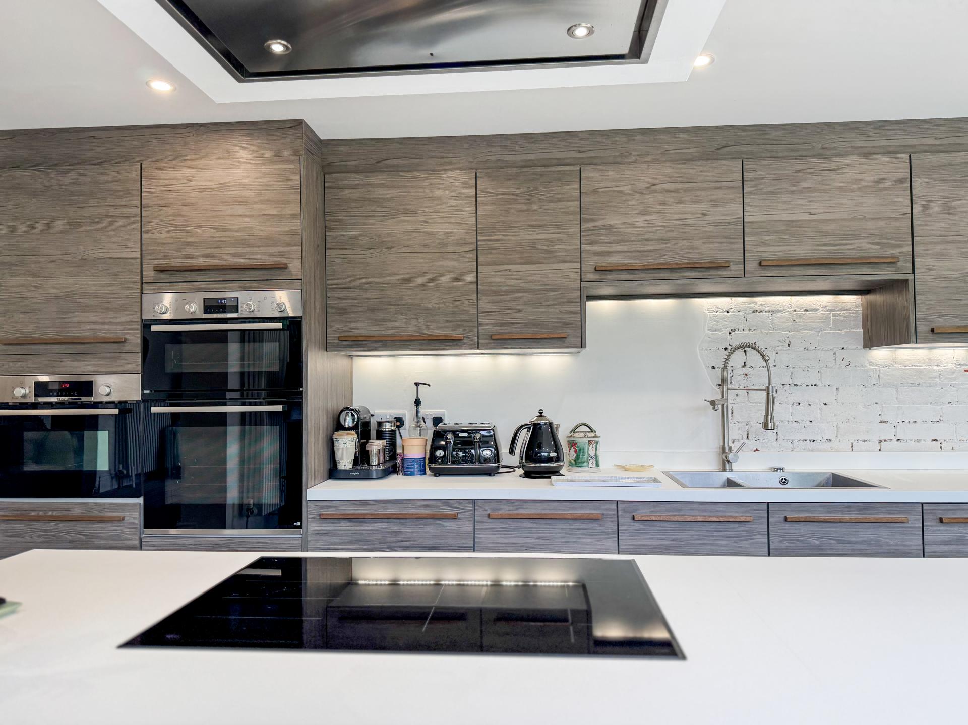 The modern, high-specification kitchen, complete with a large breakfast bar and bi-fold doors opening onto the garden, creates an ideal indoor/outdoor vibe. The utility room provides additional storage space and access to the outside.