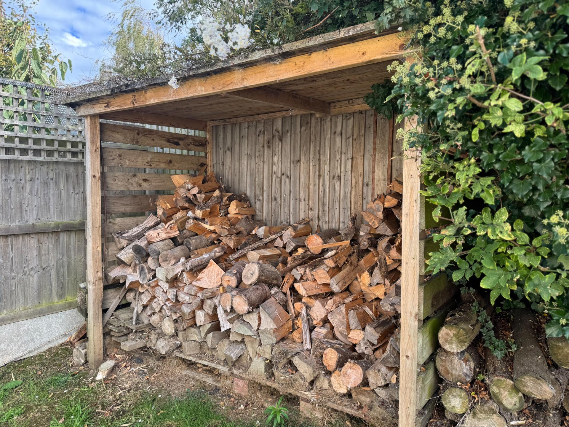 The generous enclosed and private rear garden features diverse spaces, including a lawn, patio, various trees, shrubs, plants, and a storage shed.