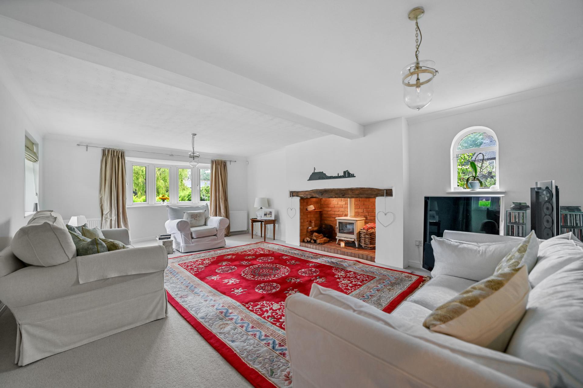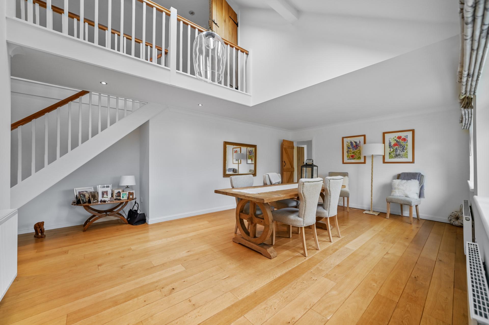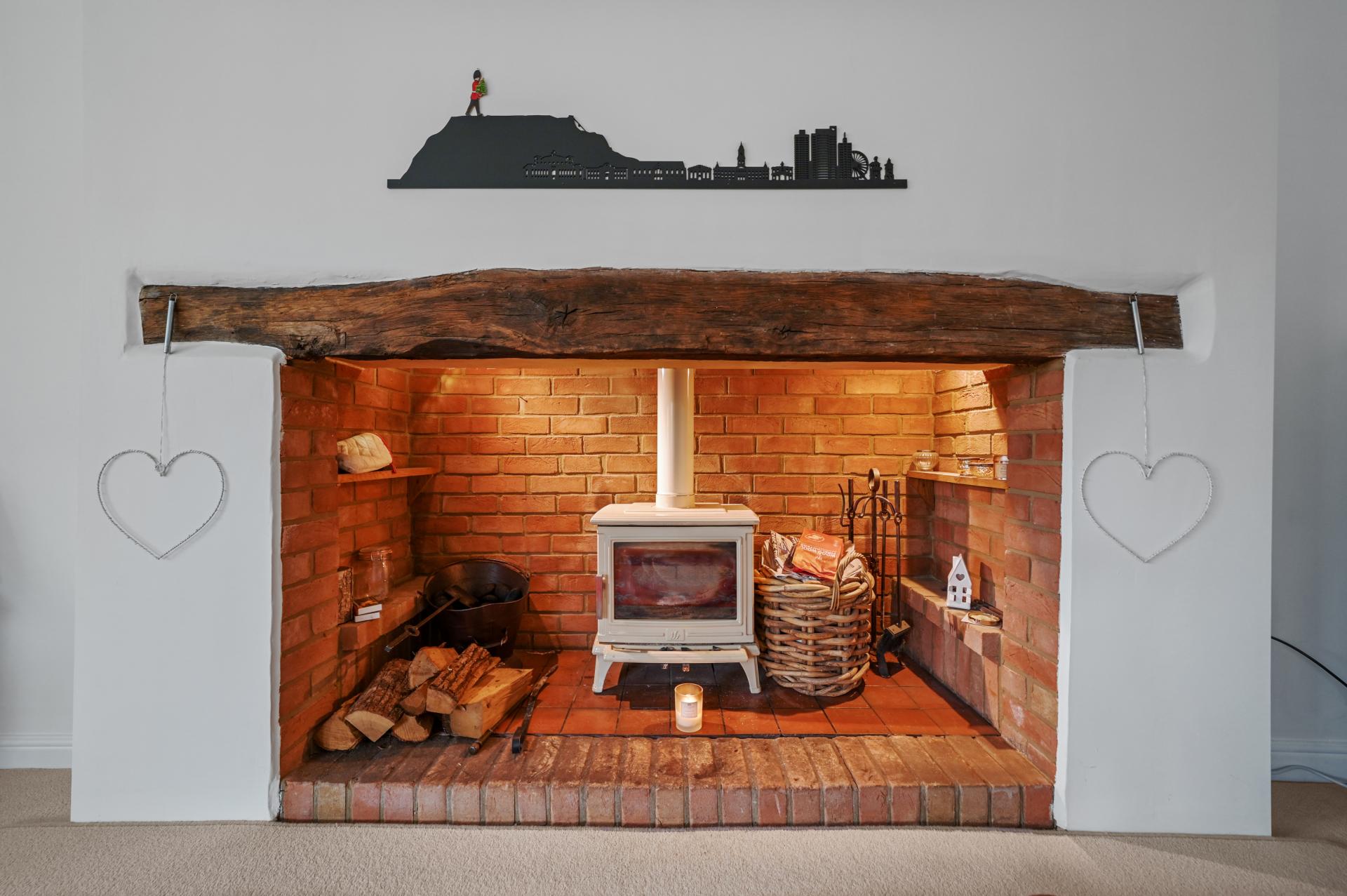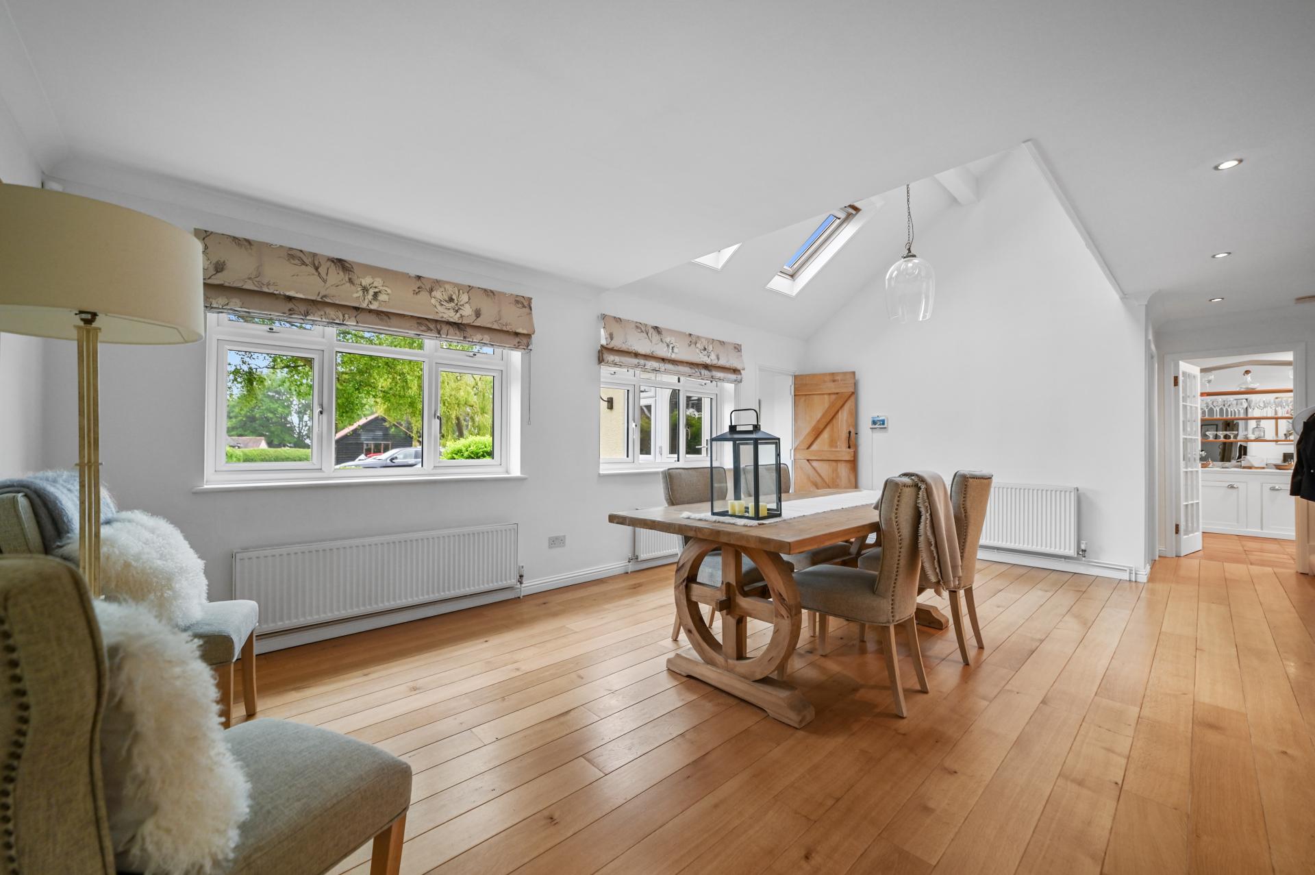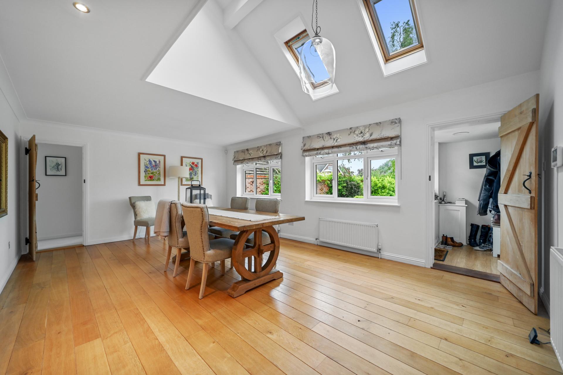 The Dining Room, characterized by a vaulted ceiling and flooded with natural light from multiple windows and Velux skylights, offers an exceptional setting for gatherings. Adjacent is the Sitting Room, a cozy retreat with a central brick fireplace housing a multi-fuel burning stove.