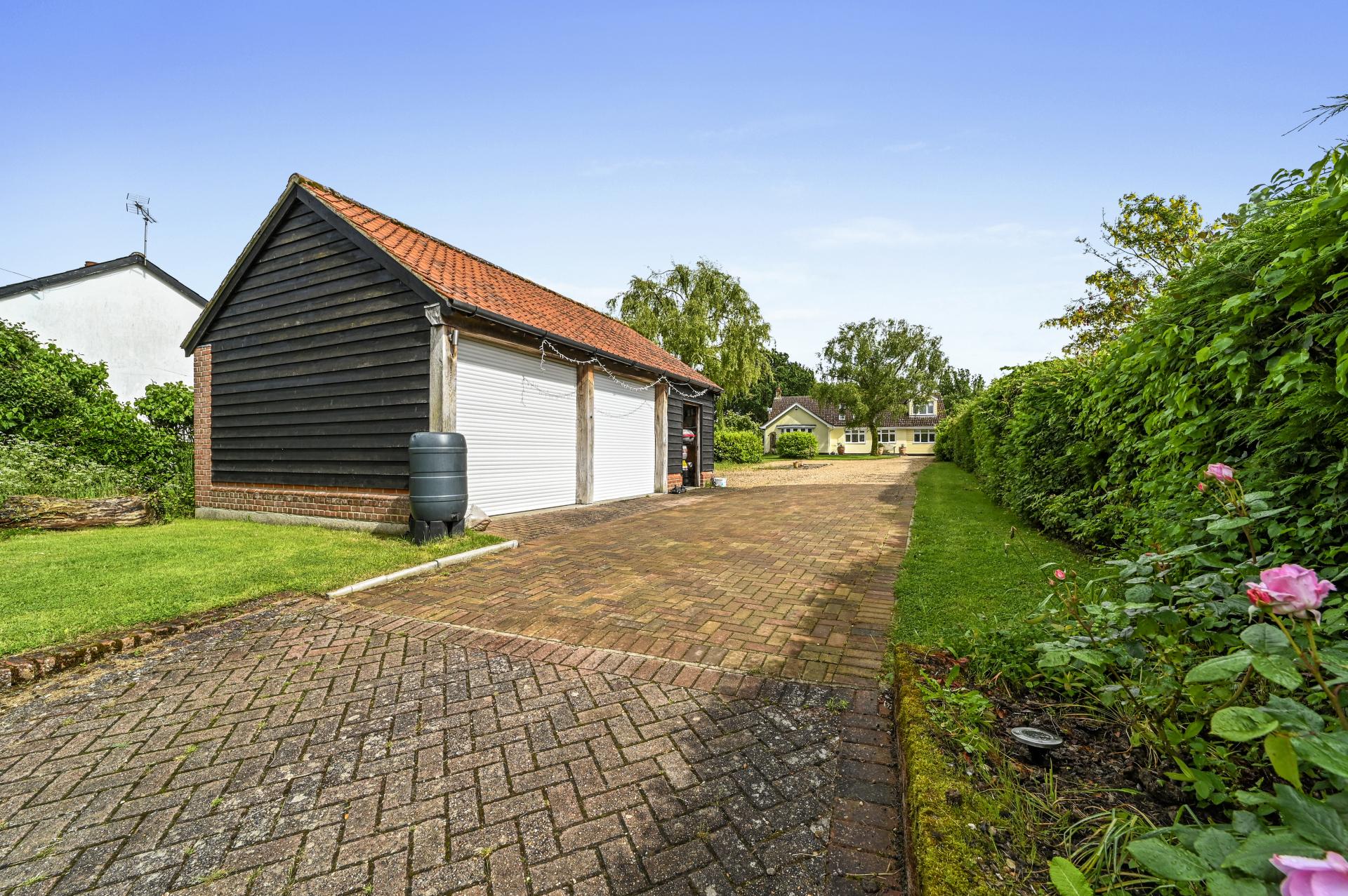 A long, shingle driveway of approximately 180 feet leads you to the property, opening up to a spacious area that provides ample off-street parking for approximately 7/8 cars and access to the detached double garage with electric roller doors.