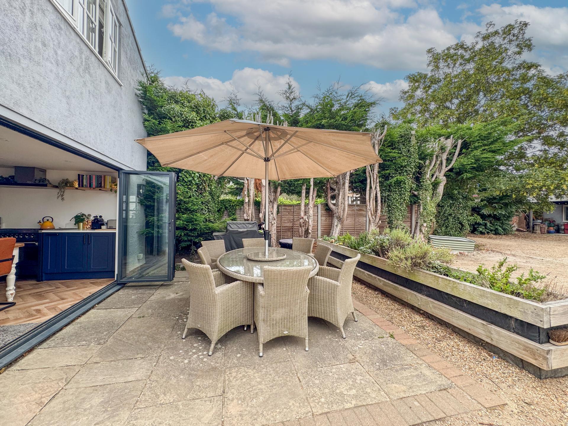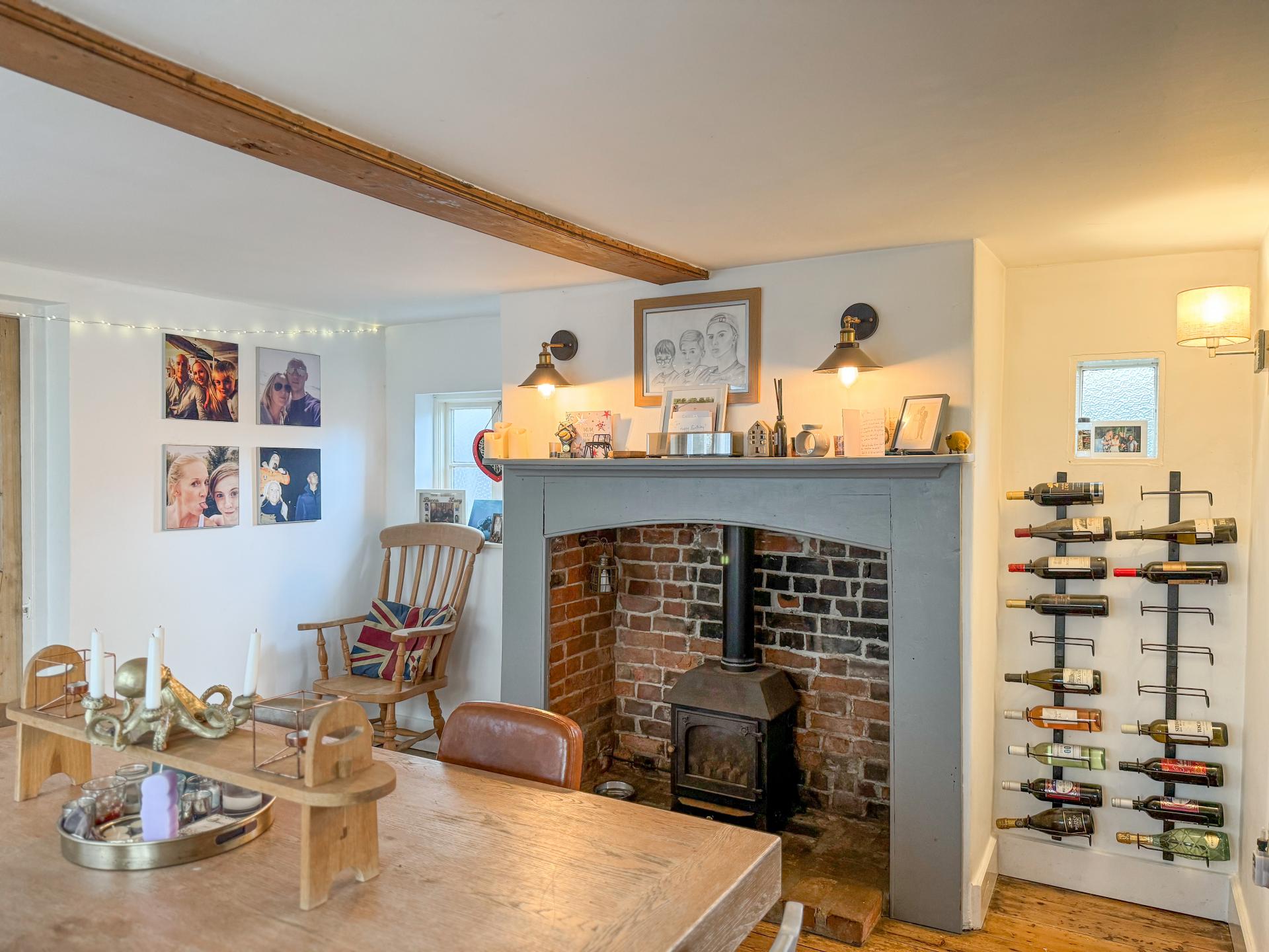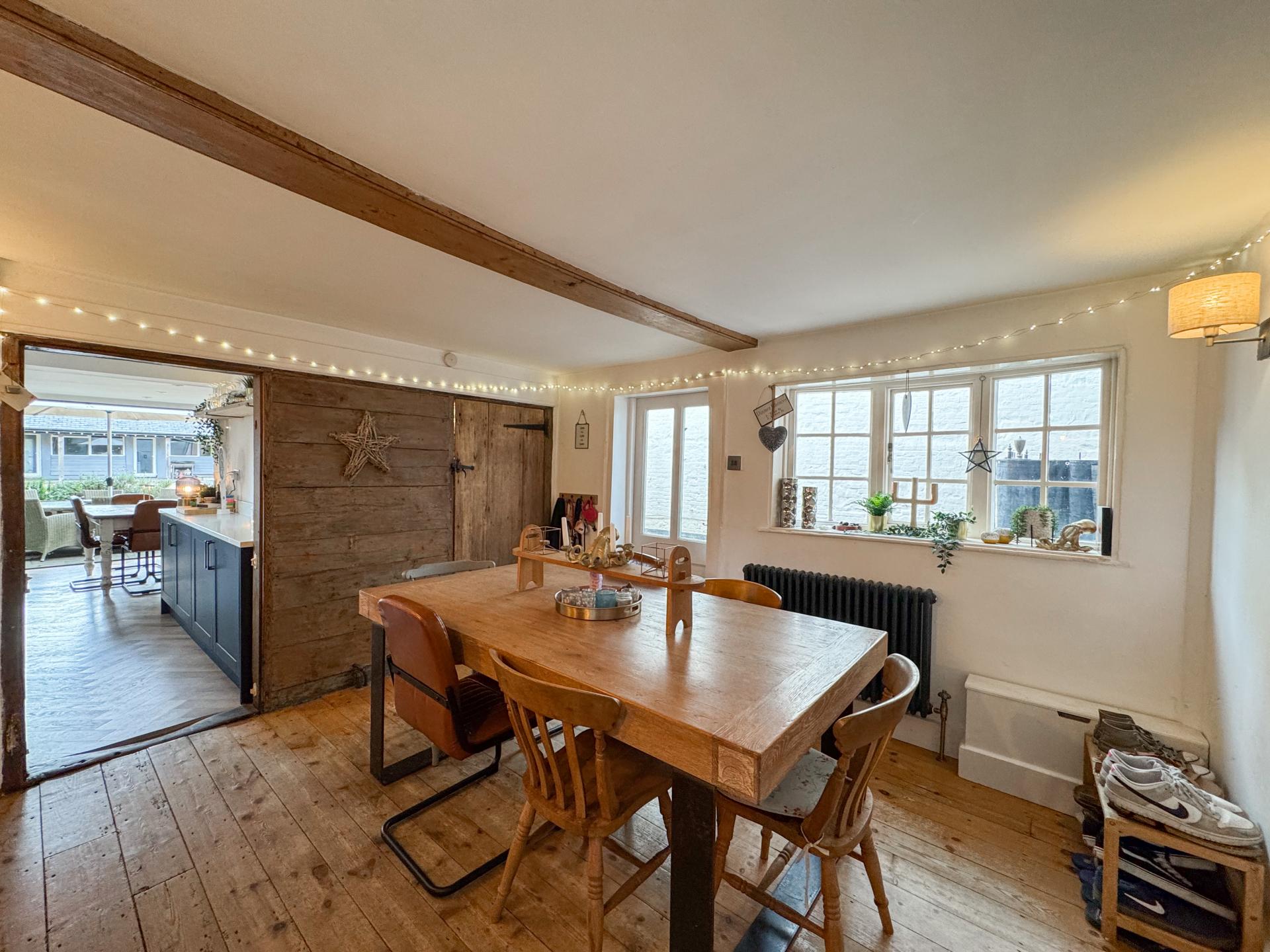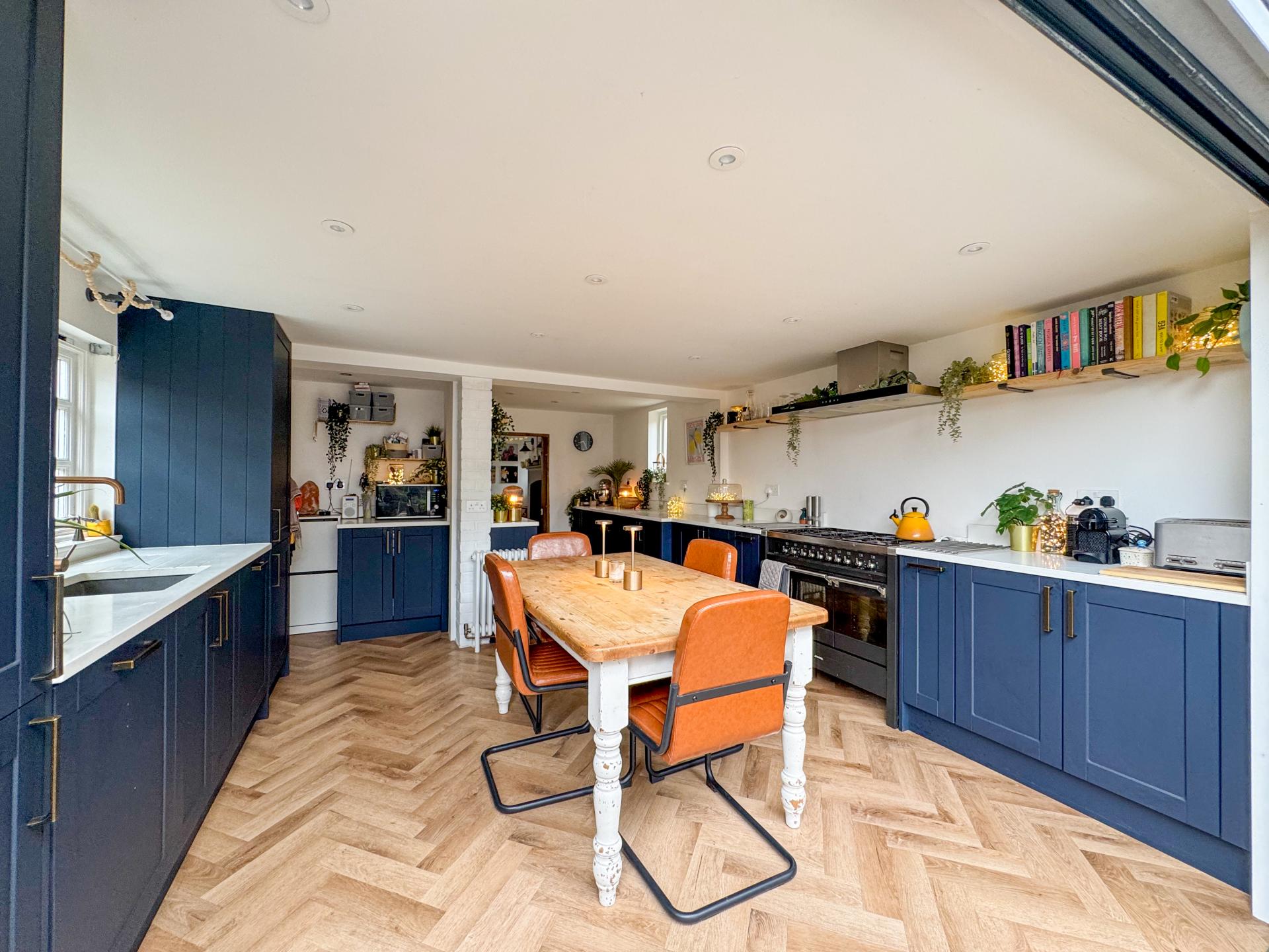 The dining room, equipped with a fireplace and gas powered multifuel effect stove, leads into the generously appointed and recently refurbished kitchen, complemented by a dining space that effortlessly caters to entertaining. With bifold doors opening into the garden, you can enjoy the perfect indoor/outdoor experience. Beyond these living areas, a utility room and discreetly placed cloakroom add convenience.