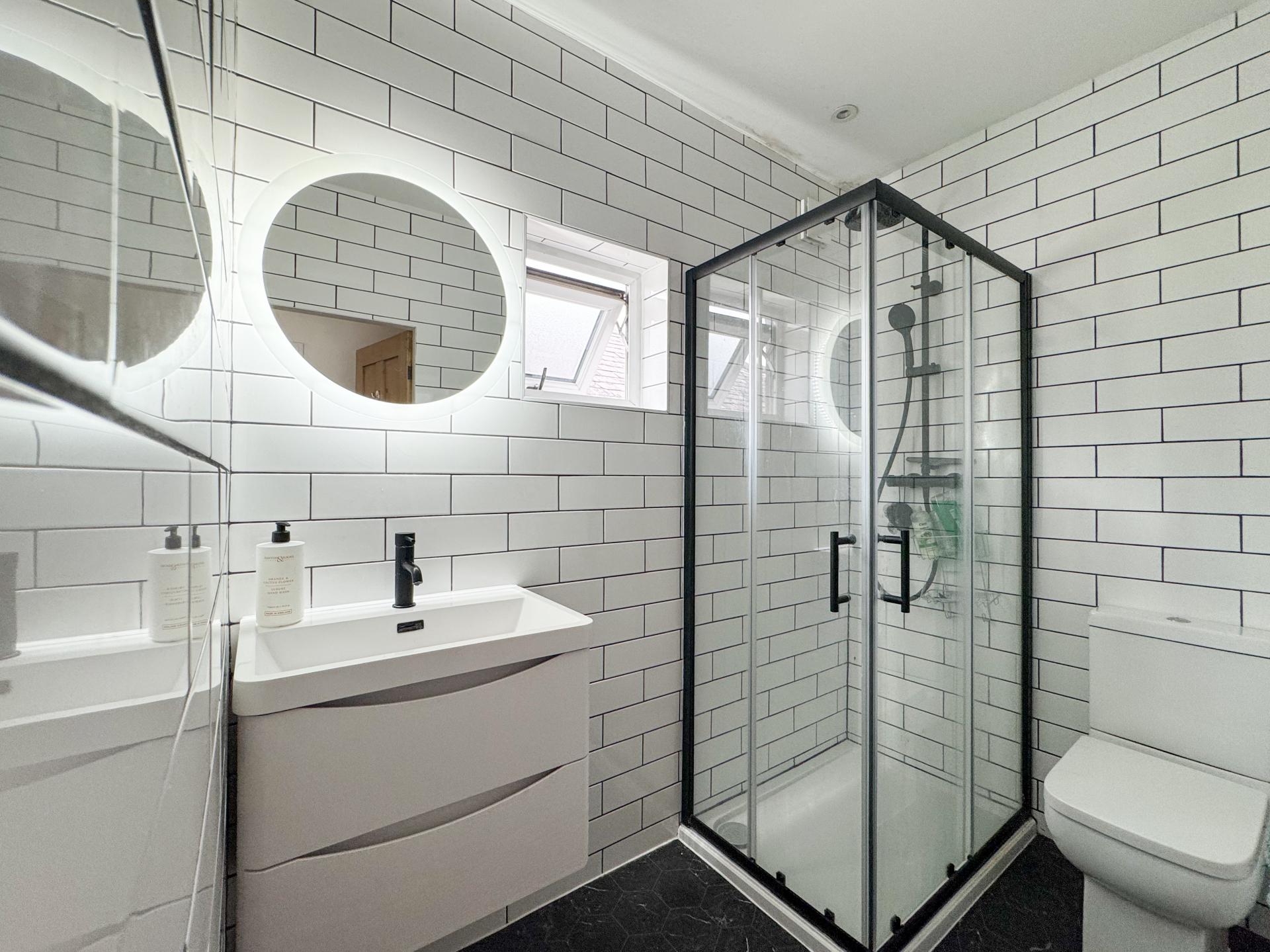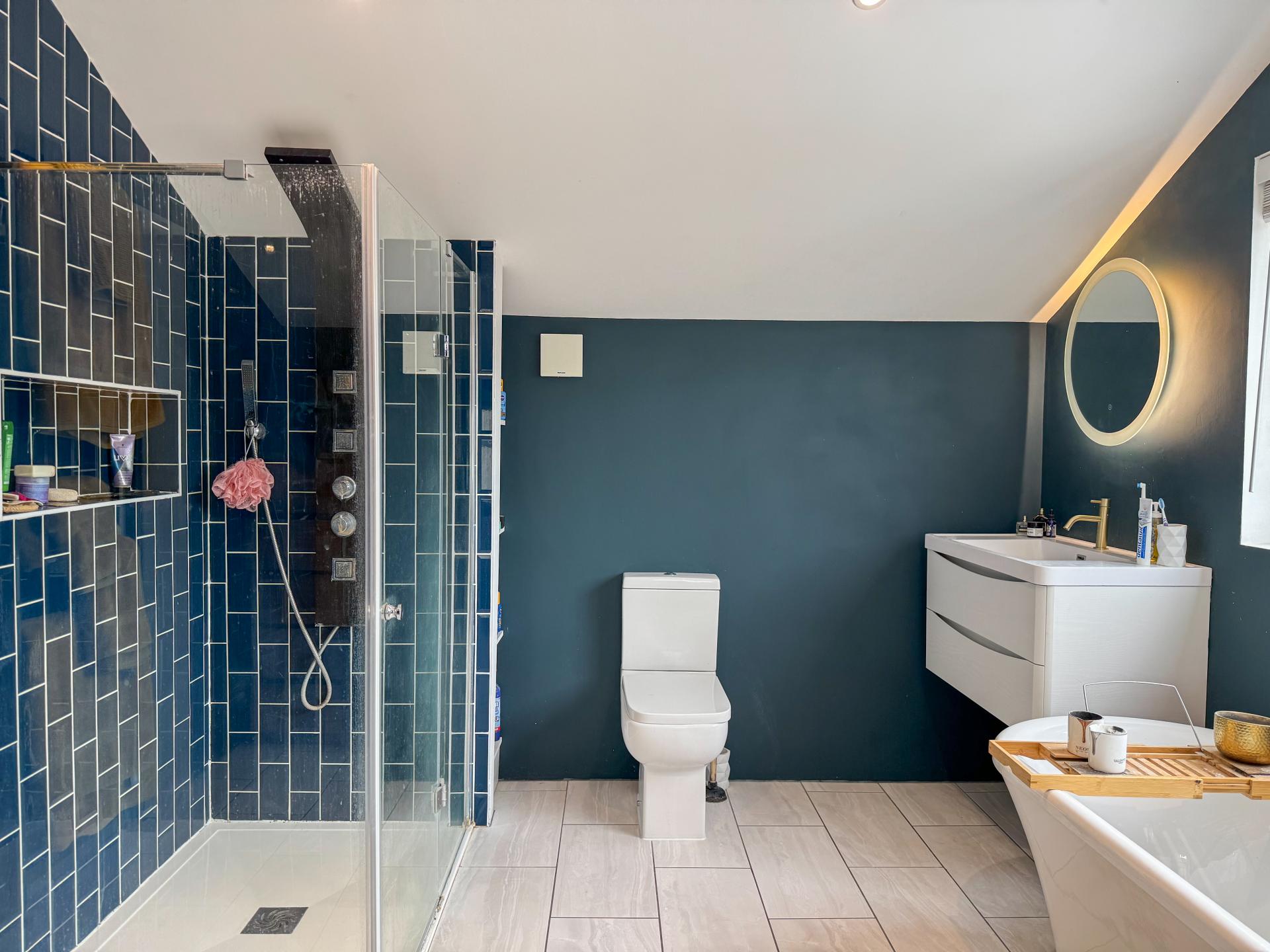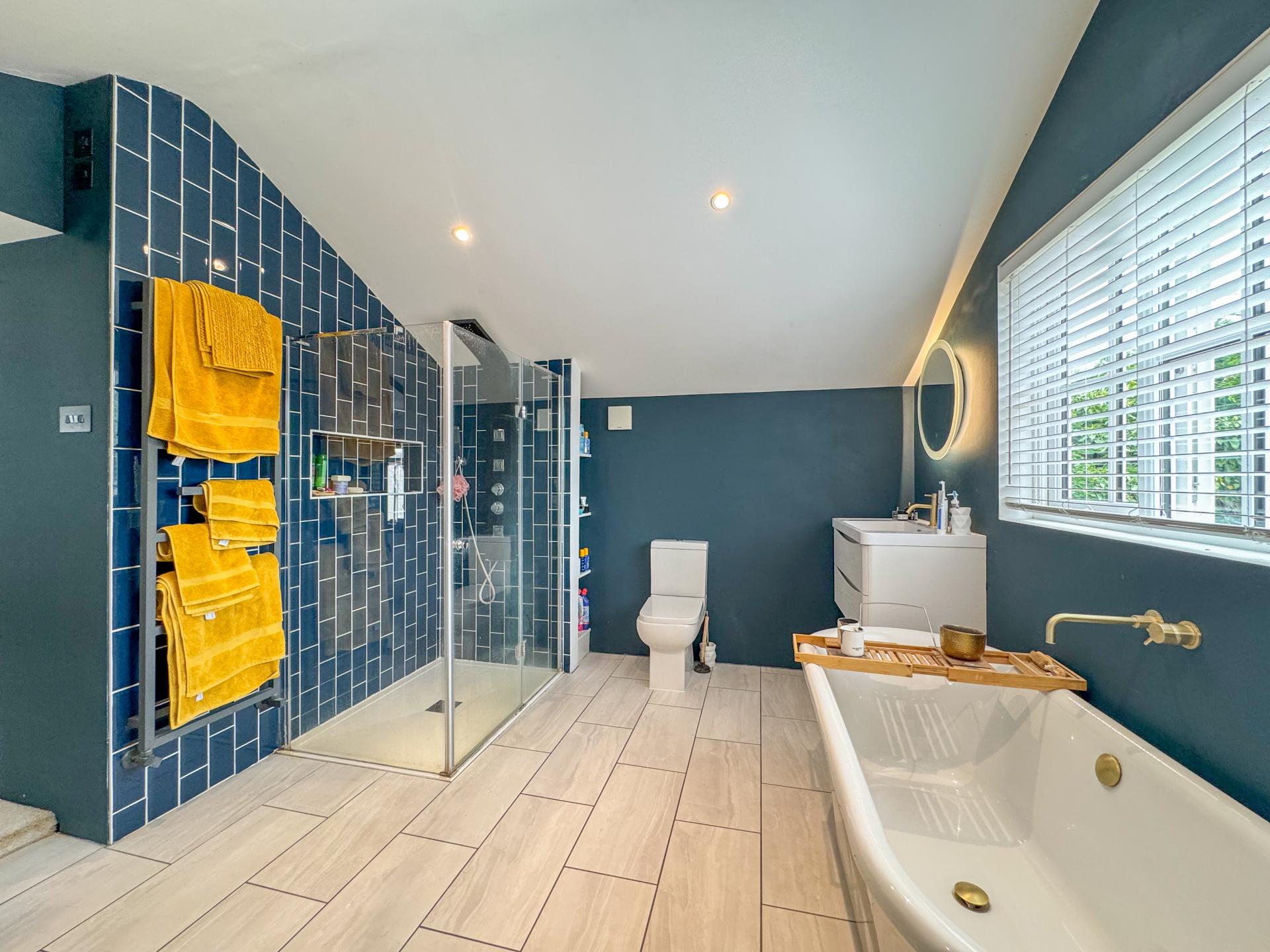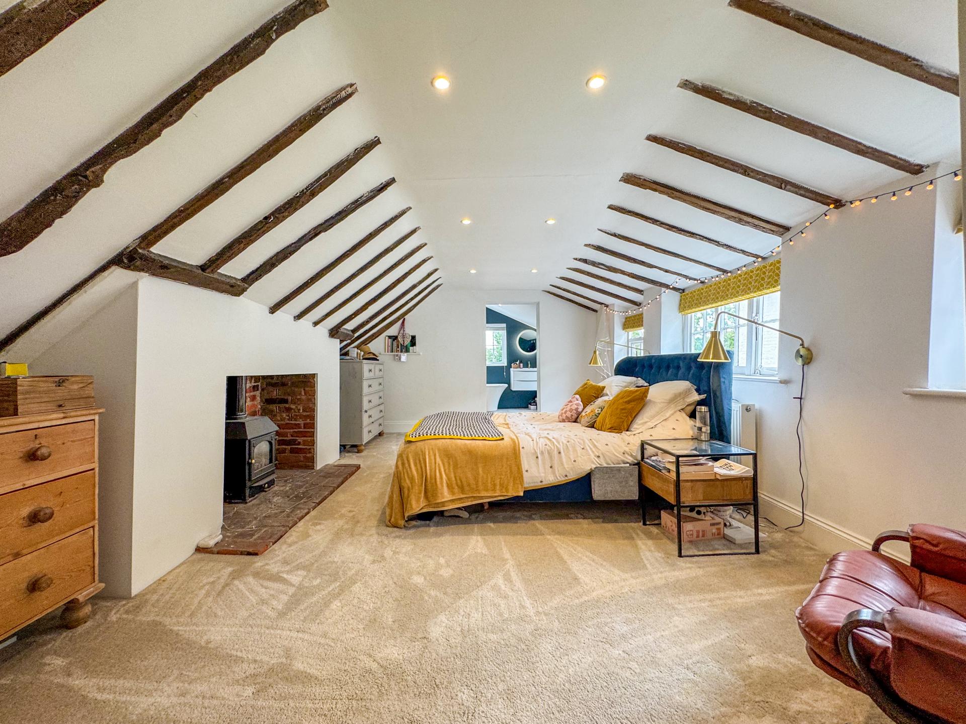 Ascending to the upper floor leads you to four bedrooms and a family bathroom. The principal bedroom, with its pitched ceiling, exposed beams, and brick-built fireplace with a gas powered multifuel effect stove, is cosy and secluded. The en-suite bathroom features a separate bath and a large walk-in shower.