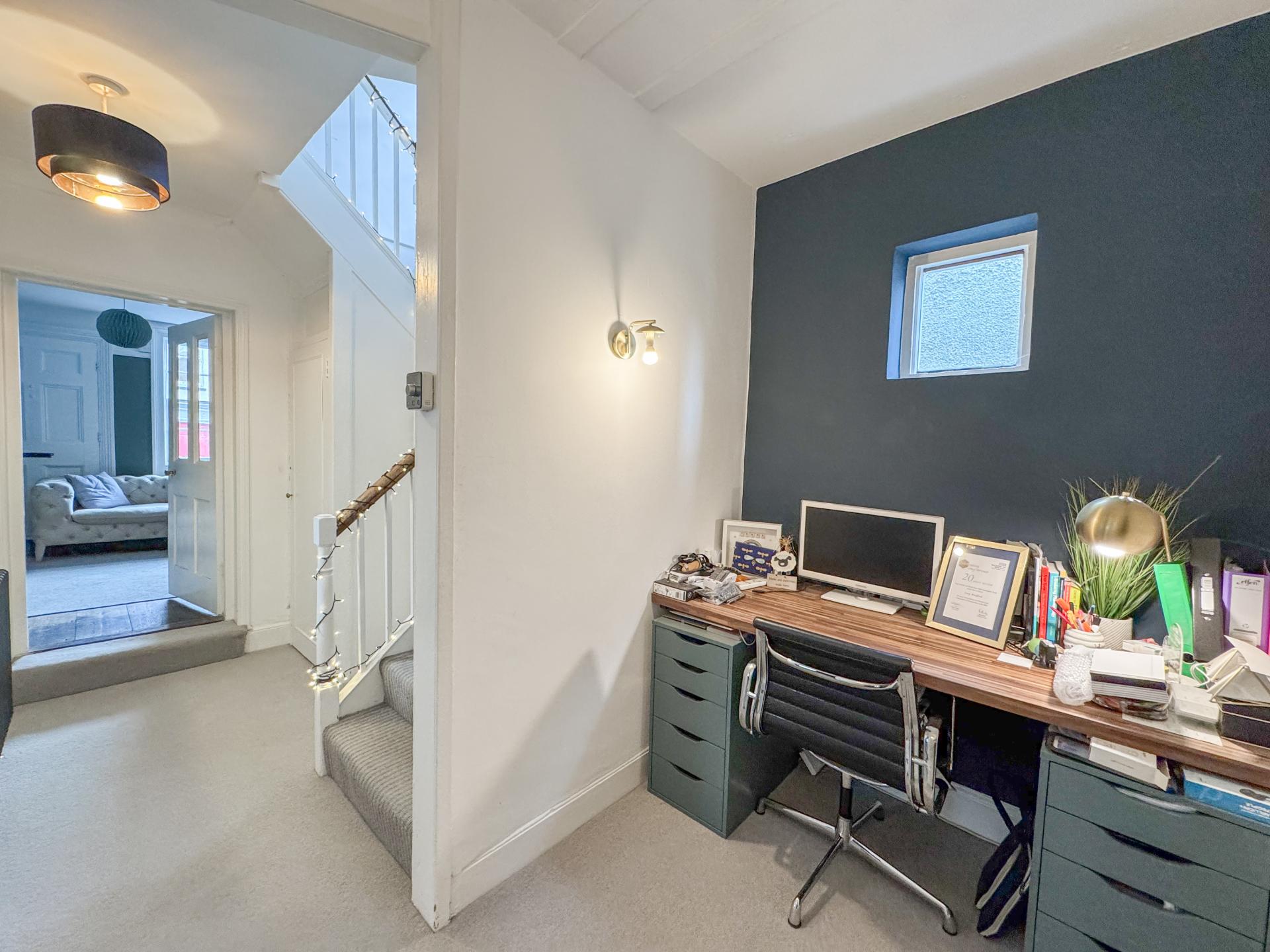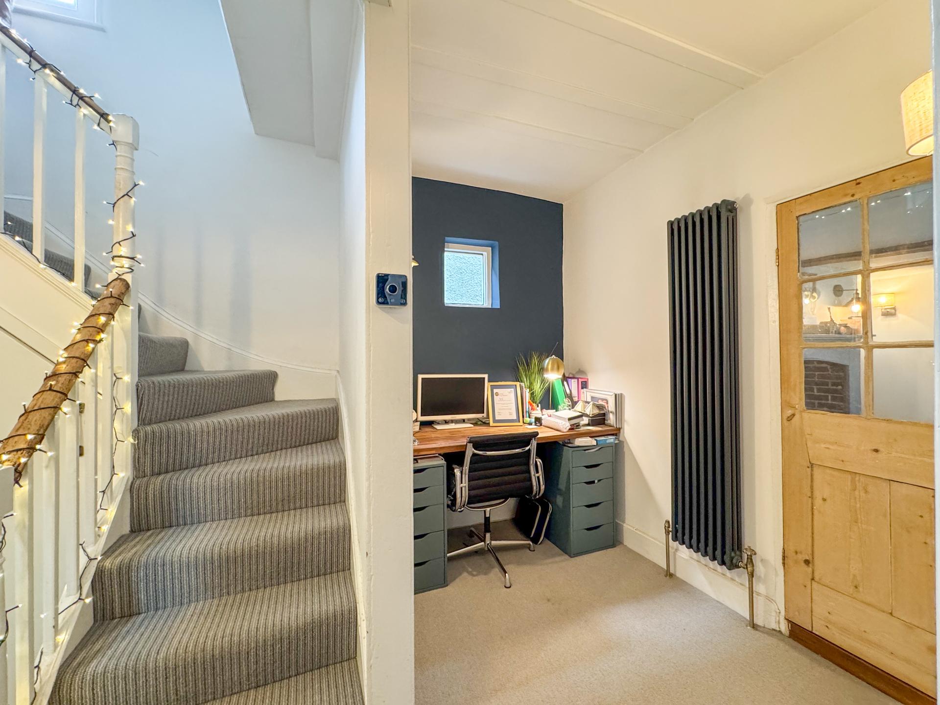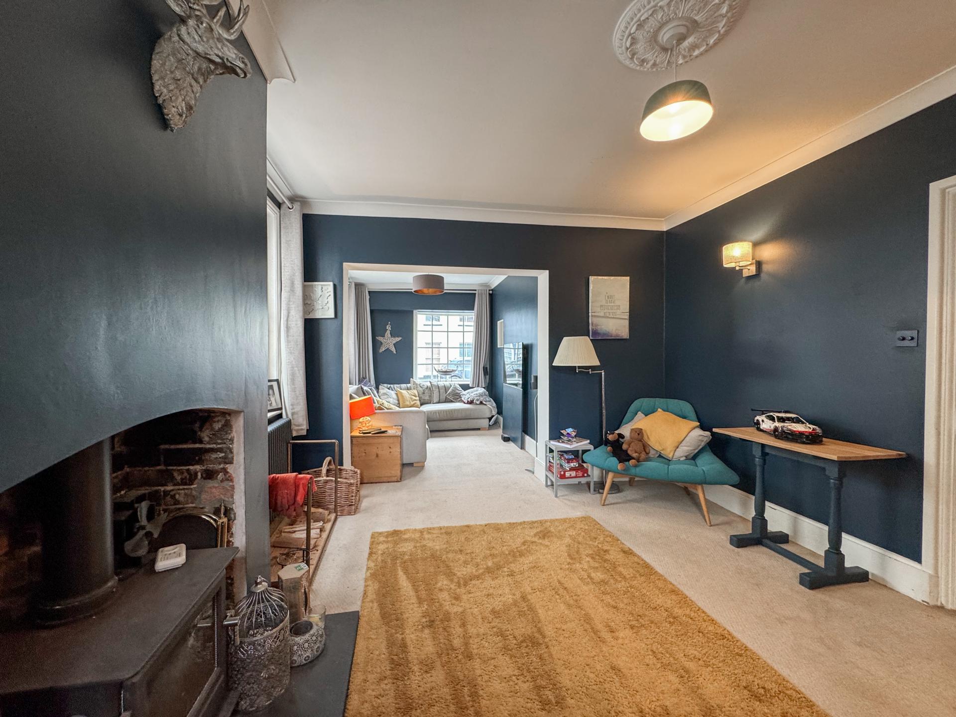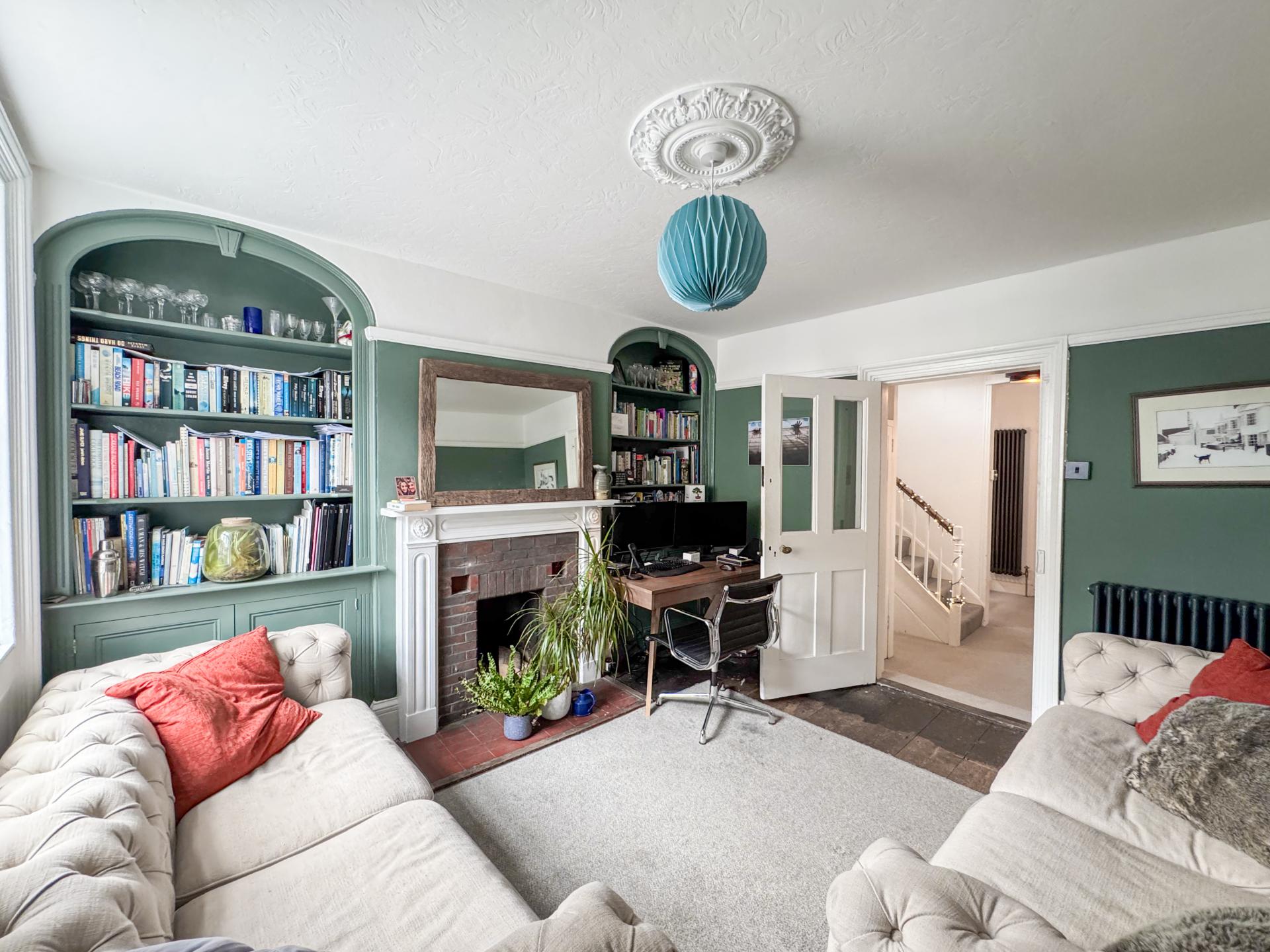 STEP INSIDE As you step through the entrance, you're greeted by a graceful reception room featuring a brick-built open fireplace and inbuilt bookshelves and cupboards. The room is cosy and filled with light. Adjacent lies a snug offering a comfortable retreat for intimate gatherings. This opens into the expansive lounge with a fireplace and wood-burning stove, promising comfort and style, and seamlessly flows into a private study area, perfect for working from home or studying.
