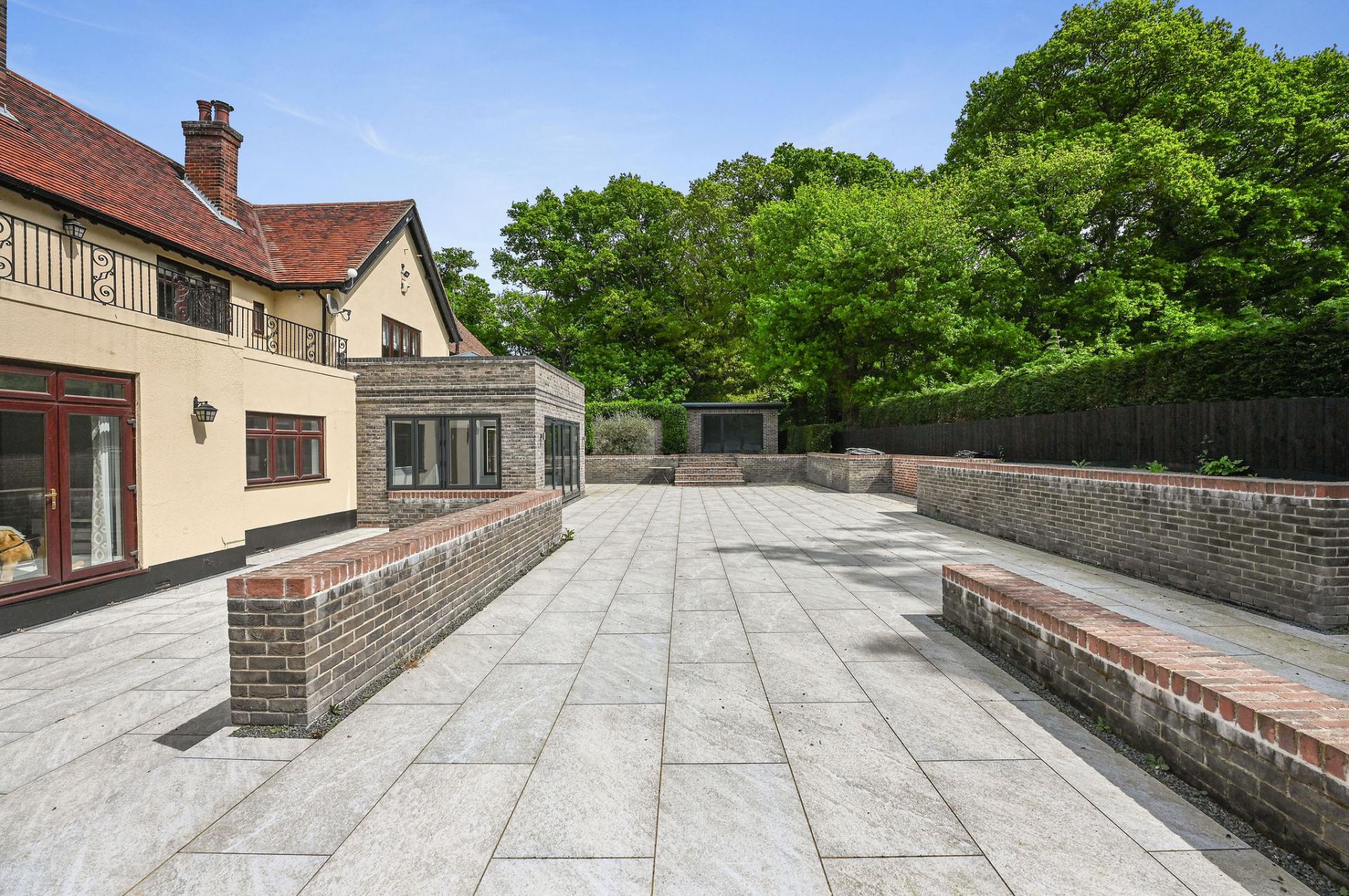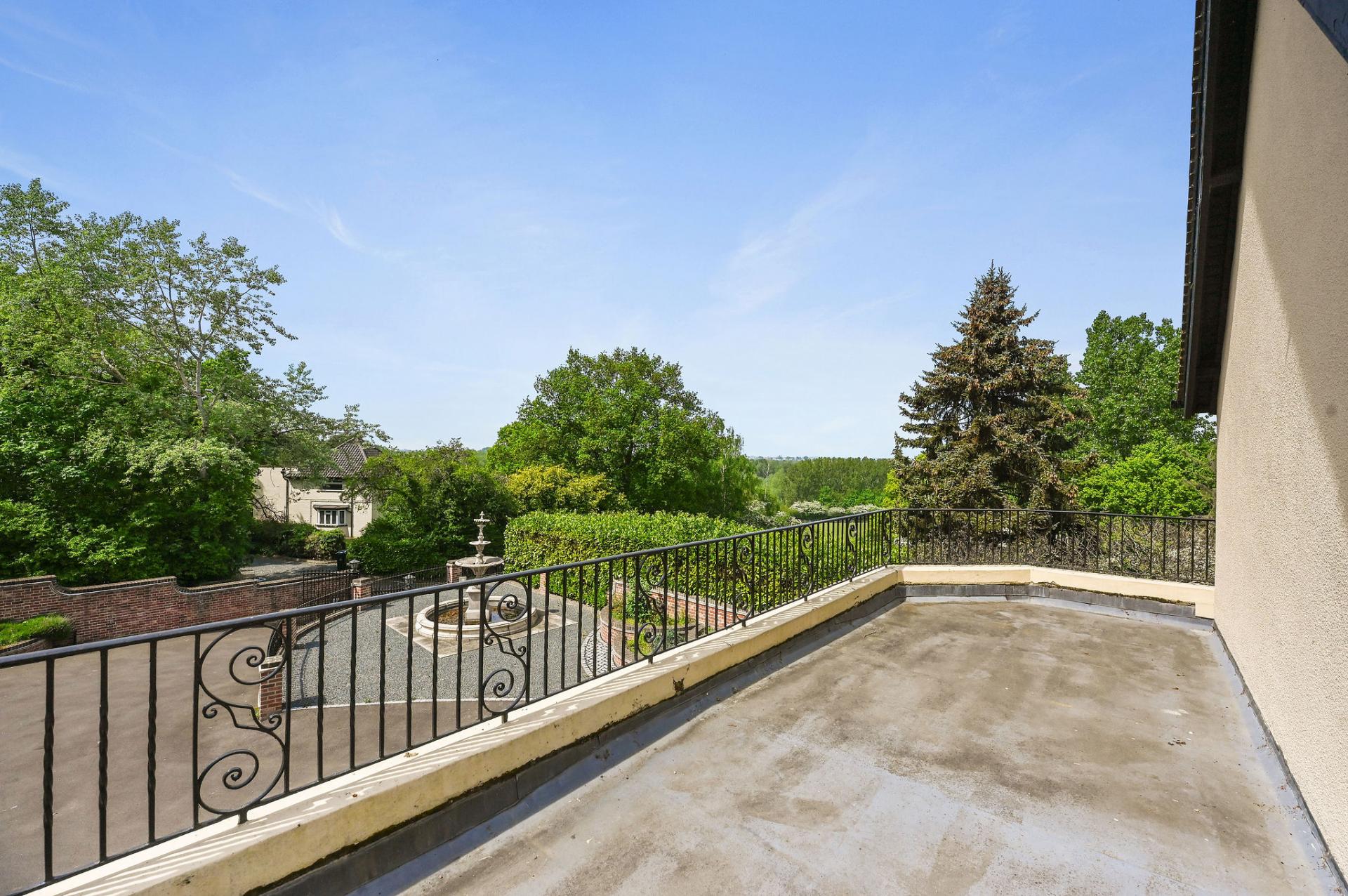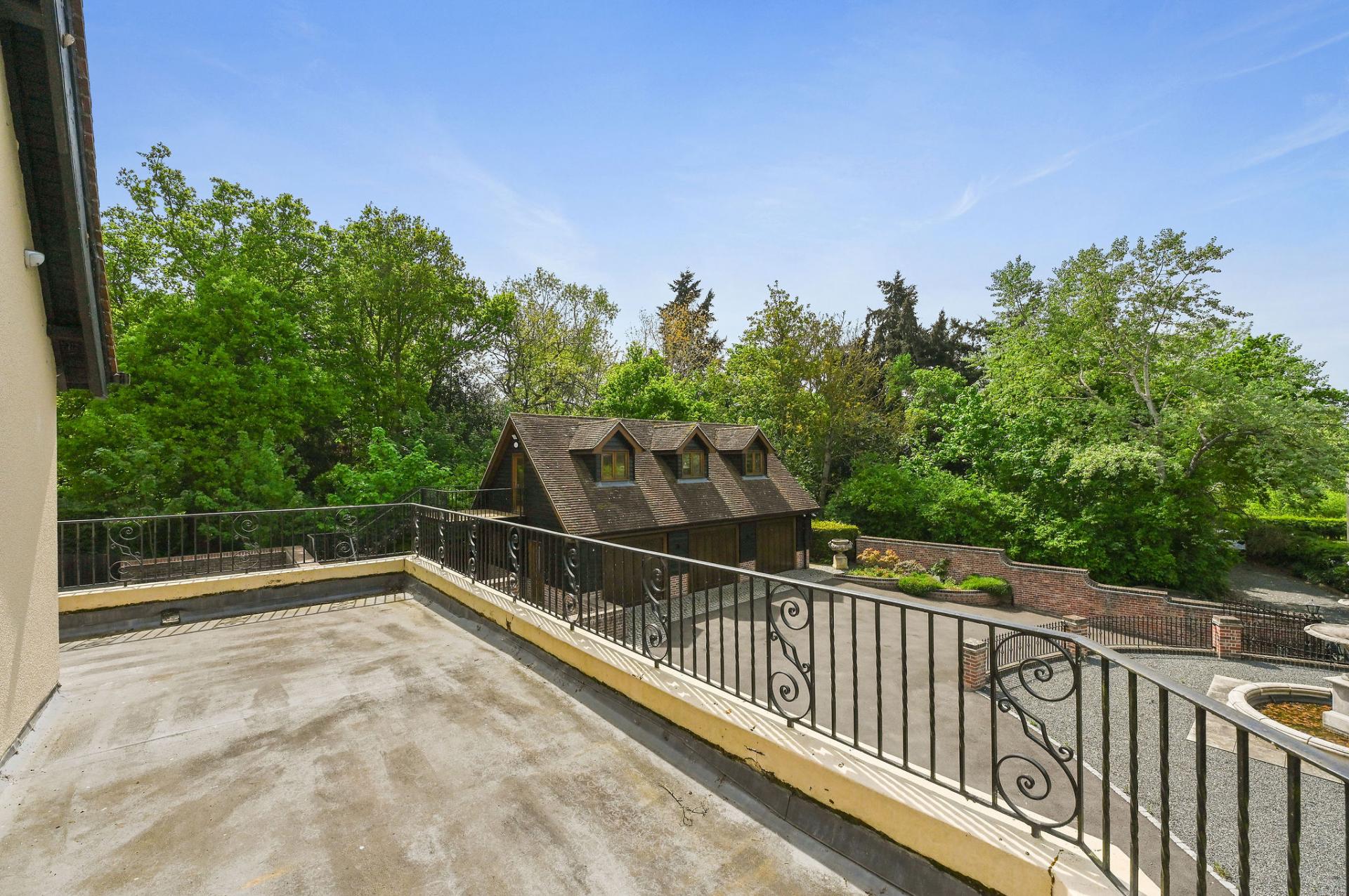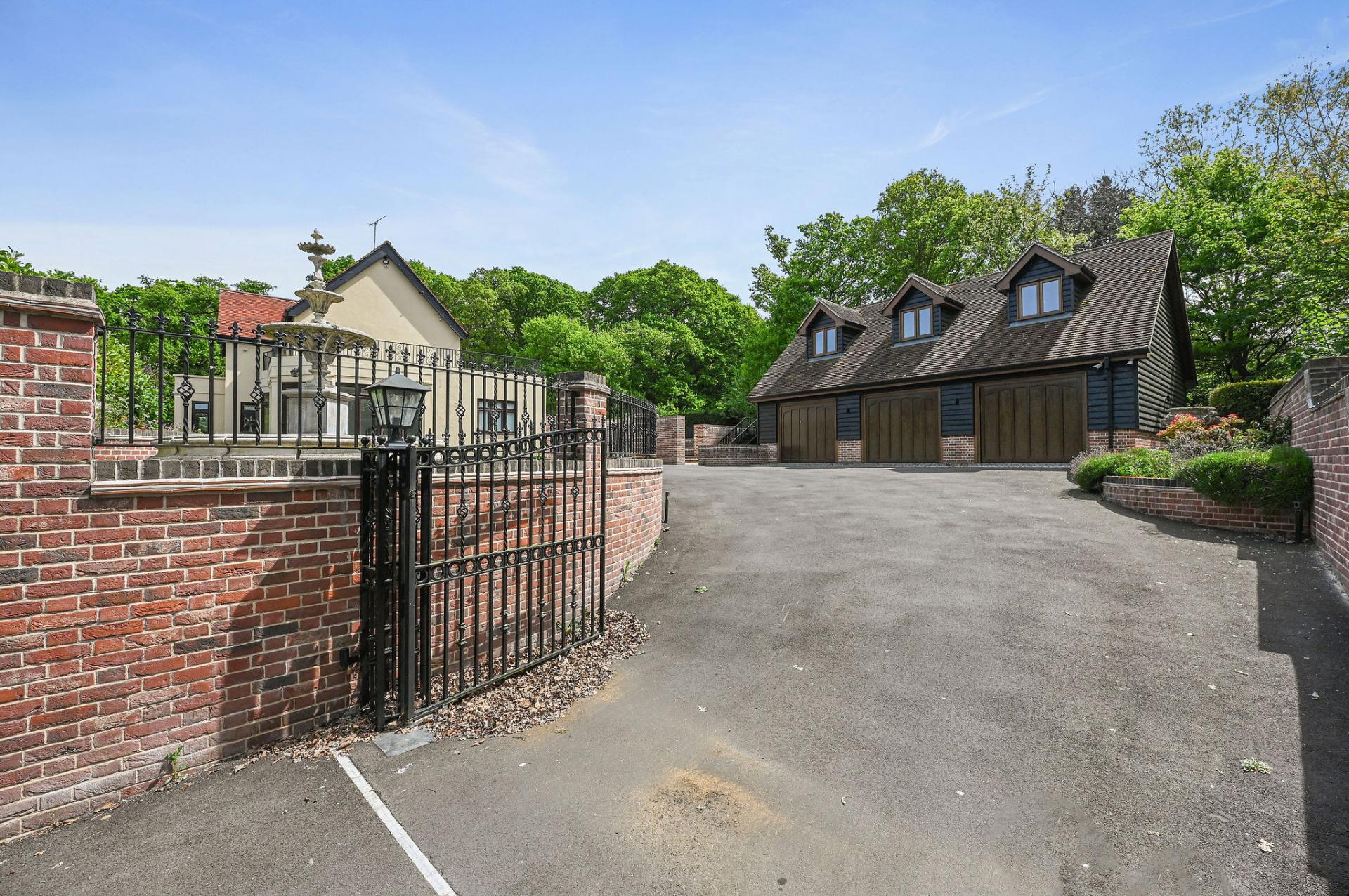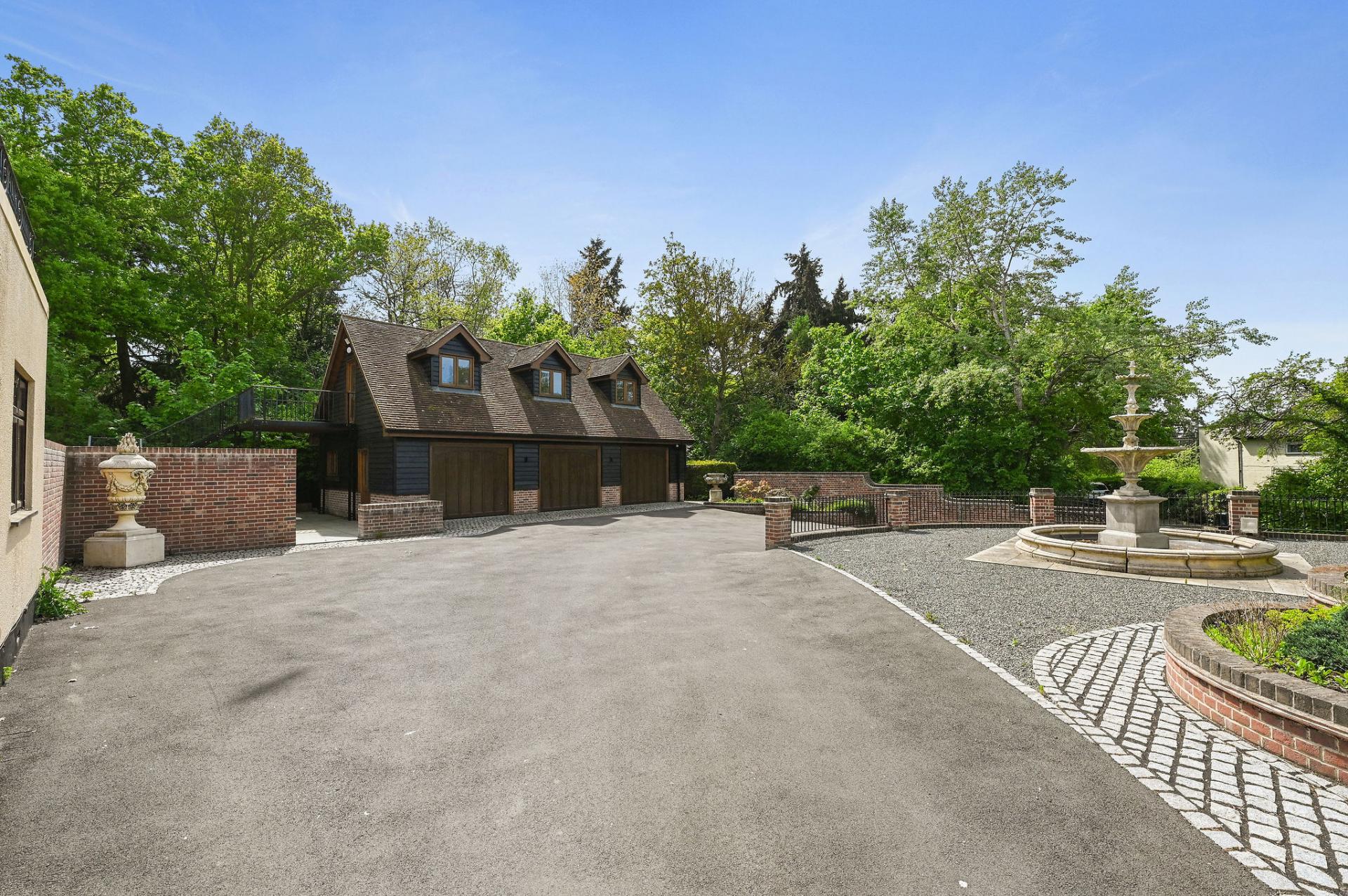 OUTSIDE The gardens and grounds offer a breath taking extension of the home, enveloping it in natural beauty and tranquillity. A grand terrace provides a perfect setting for al fresco dining and leisurely outdoor gatherings, while the meticulously landscaped lawns and mature trees enhance the estate's serene ambiance. The grounds are adorned with a charming stone fountain, which serves as a focal point, adding a touch of elegance to the outdoor space. The property features a versatile outbuilding perfect for a home office, gym, or extra living space. The expansive triple garage provides ample room for vehicles and storage, complemented by convenient off-road parking for guests. Above the garage is an unfinished annexe, ready to be finished to your own specification