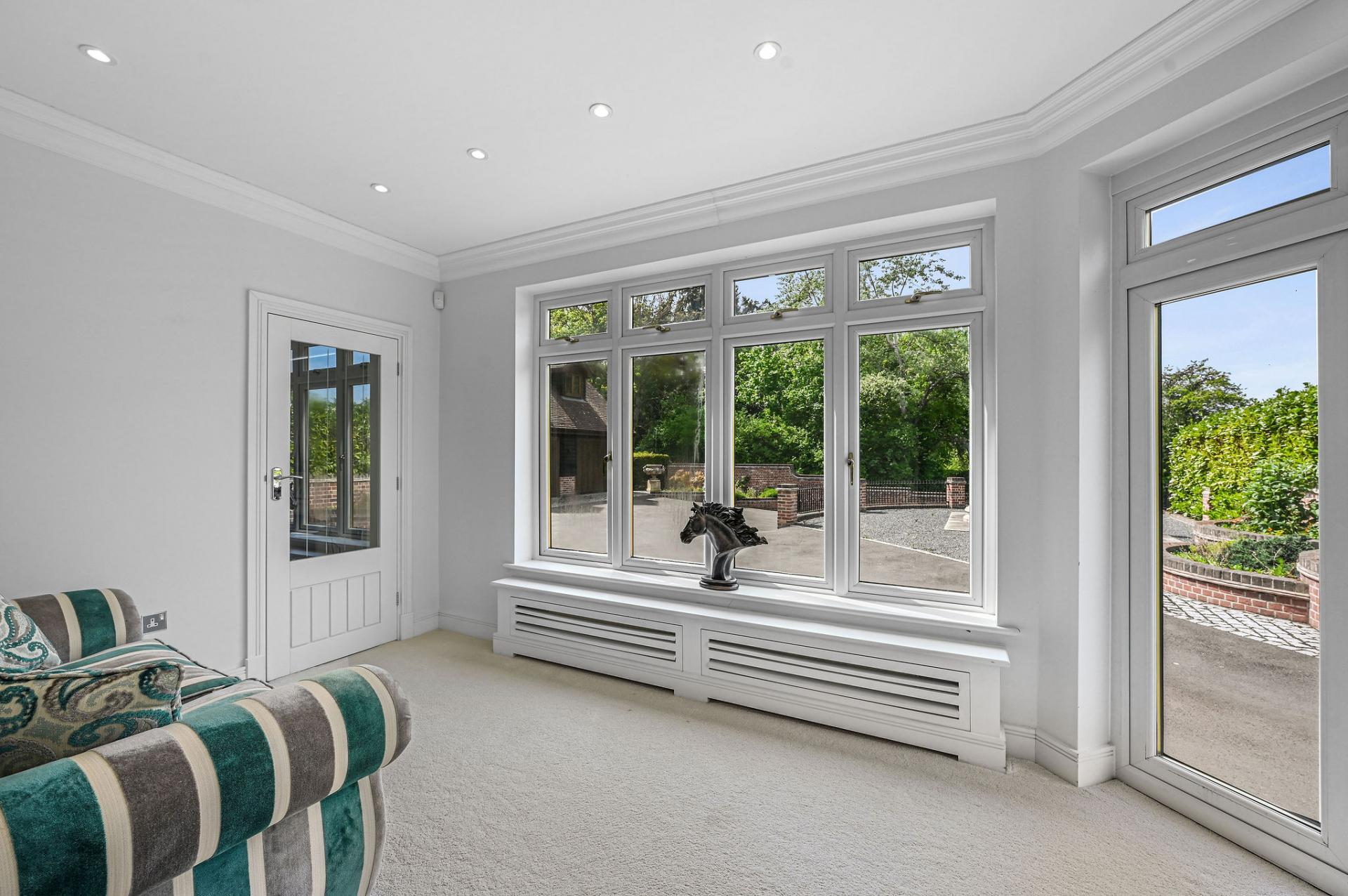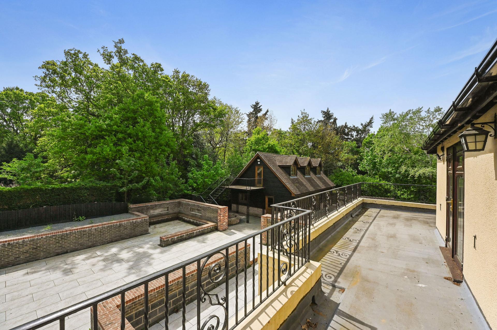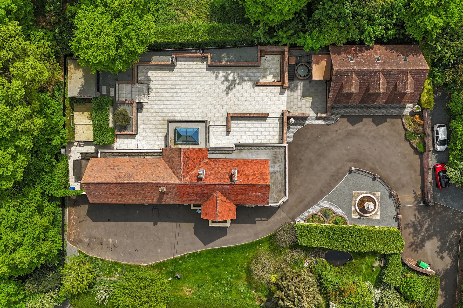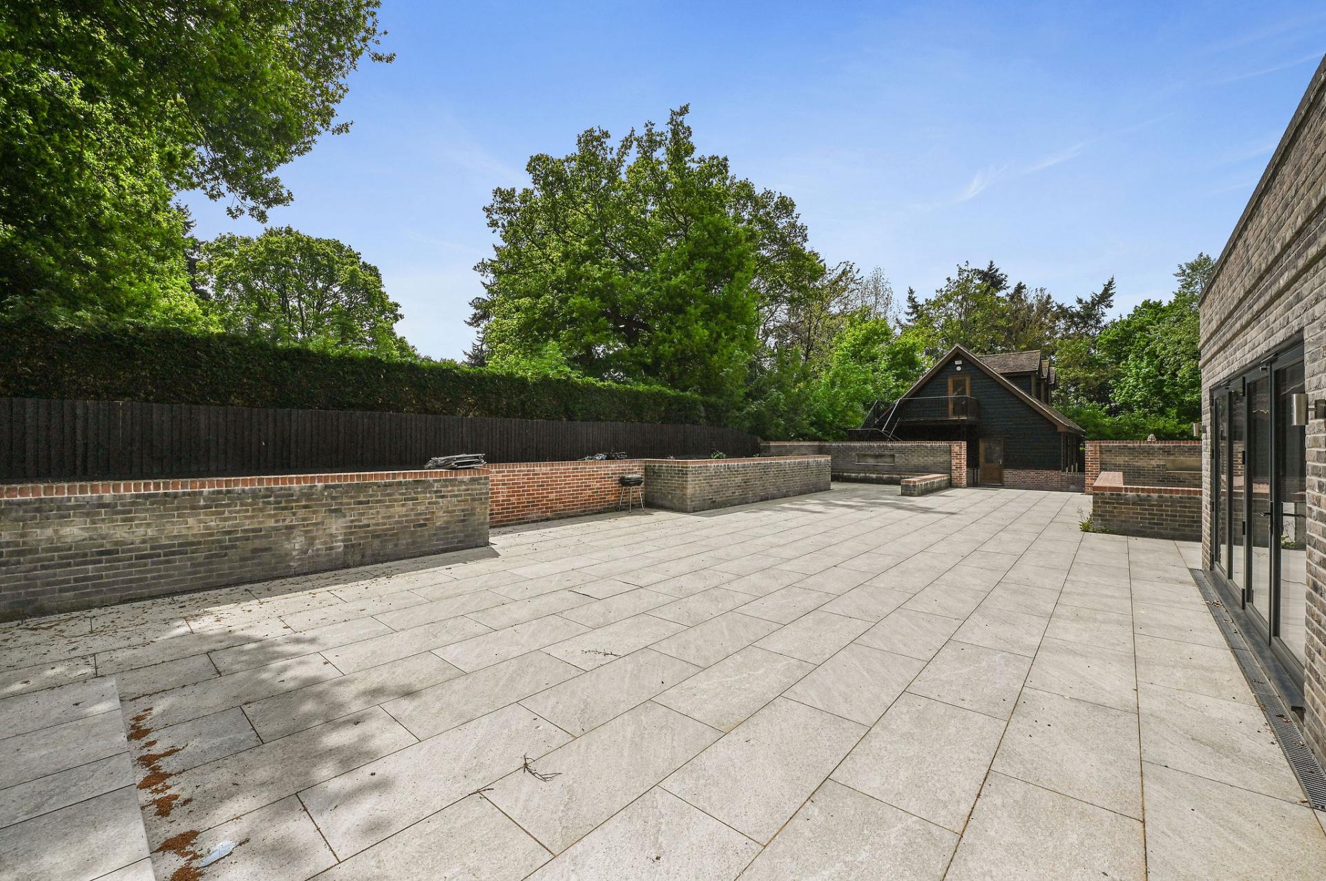 OUTSIDE The gardens and grounds offer a breath taking extension of the home, enveloping it in natural beauty and tranquillity. A grand terrace provides a perfect setting for al fresco dining and leisurely outdoor gatherings, while the meticulously landscaped lawns and mature trees enhance the estate's serene ambiance. The grounds are adorned with a charming stone fountain, which serves as a focal point, adding a touch of elegance to the outdoor space. The property features a versatile outbuilding perfect for a home office, gym, or extra living space. The expansive triple garage provides ample room for vehicles and storage, complemented by convenient off-road parking for guests. Above the garage is an unfinished annexe, ready to be finished to your own specification
