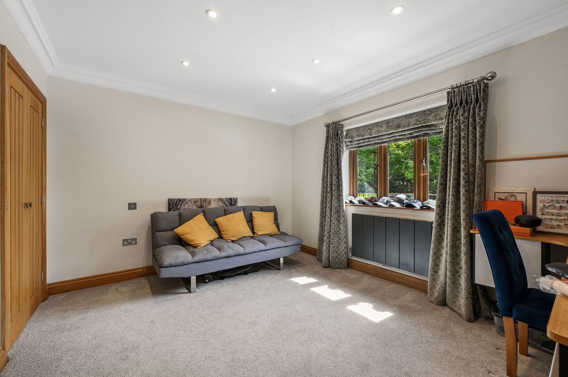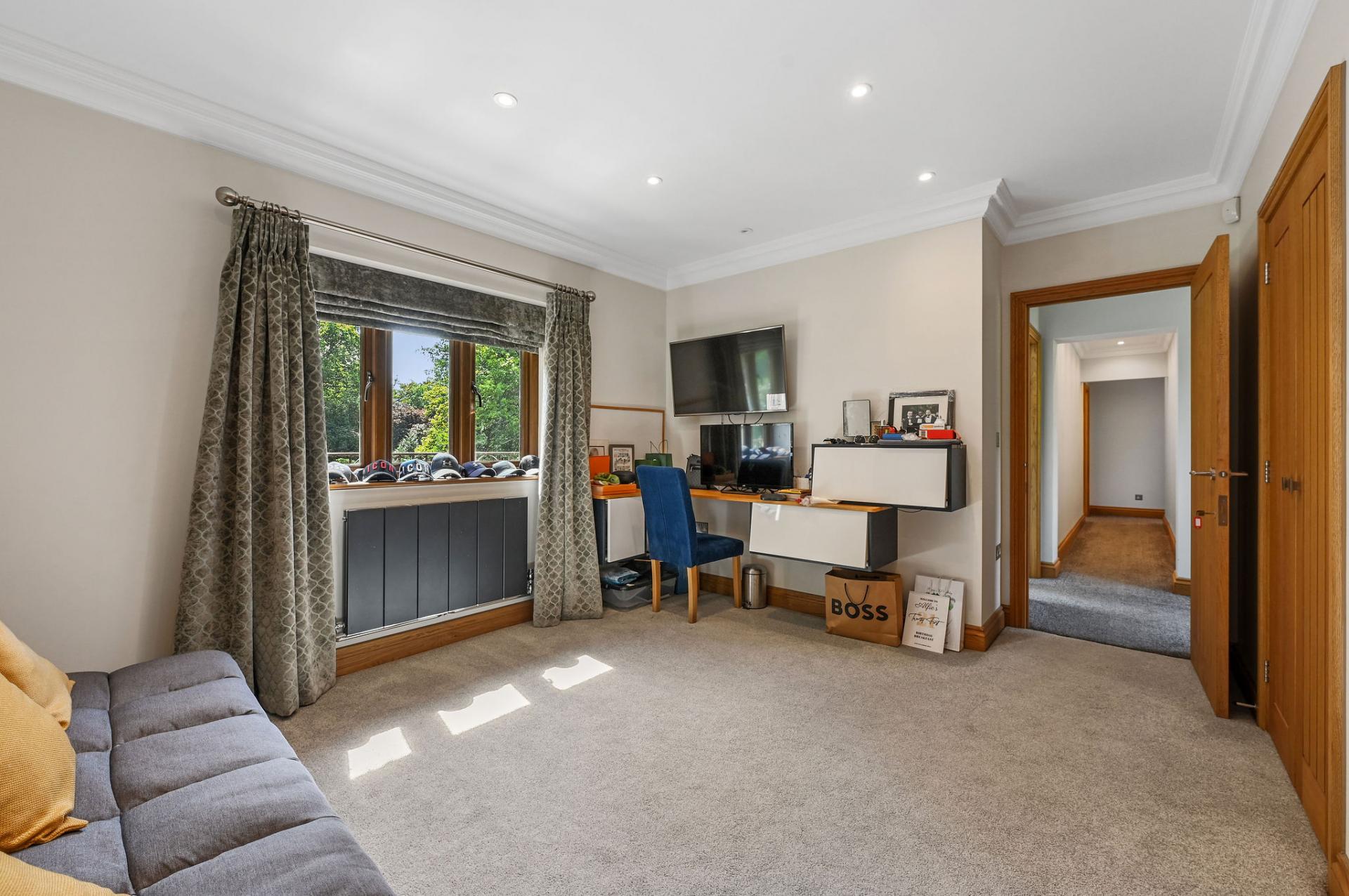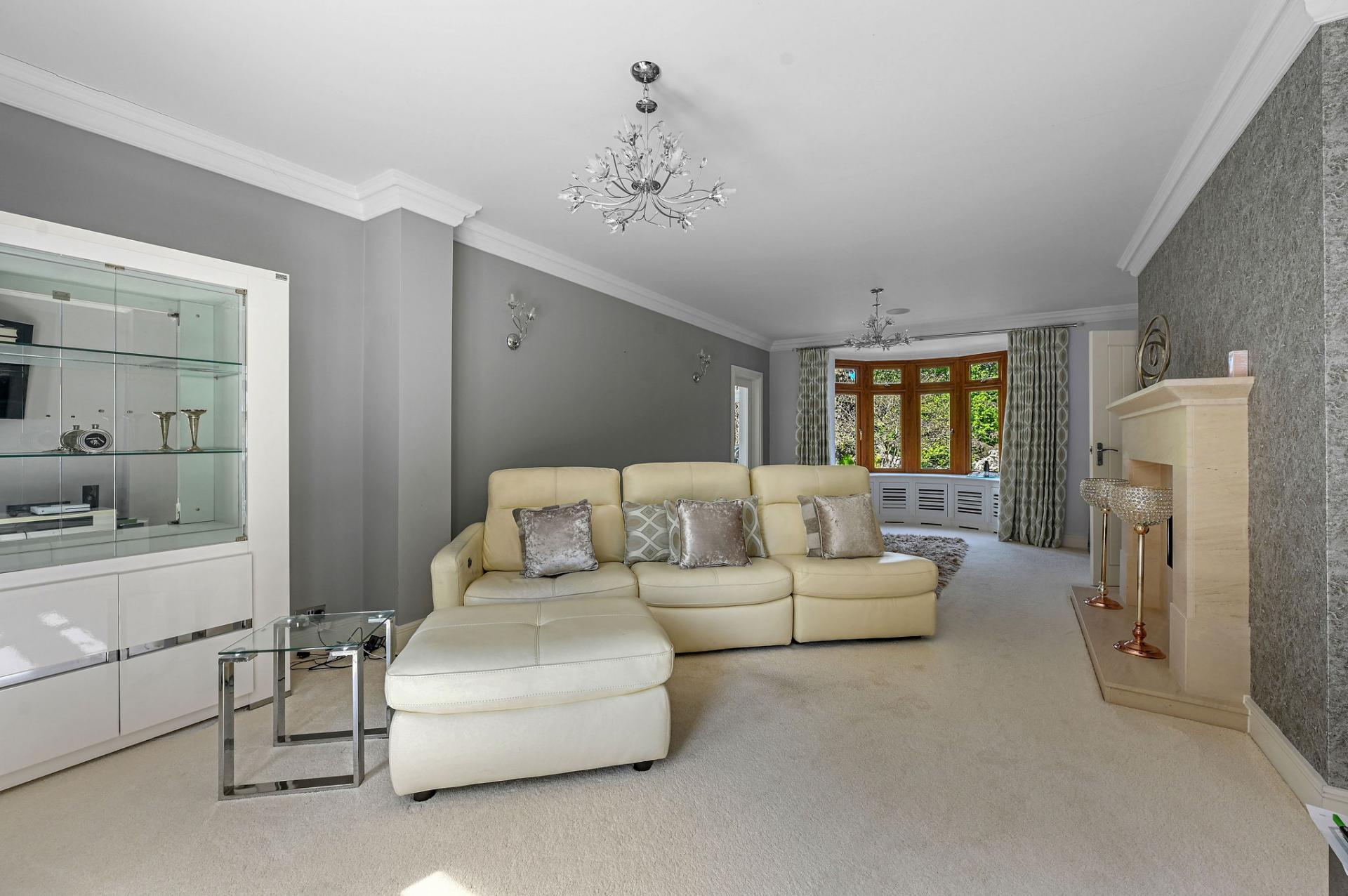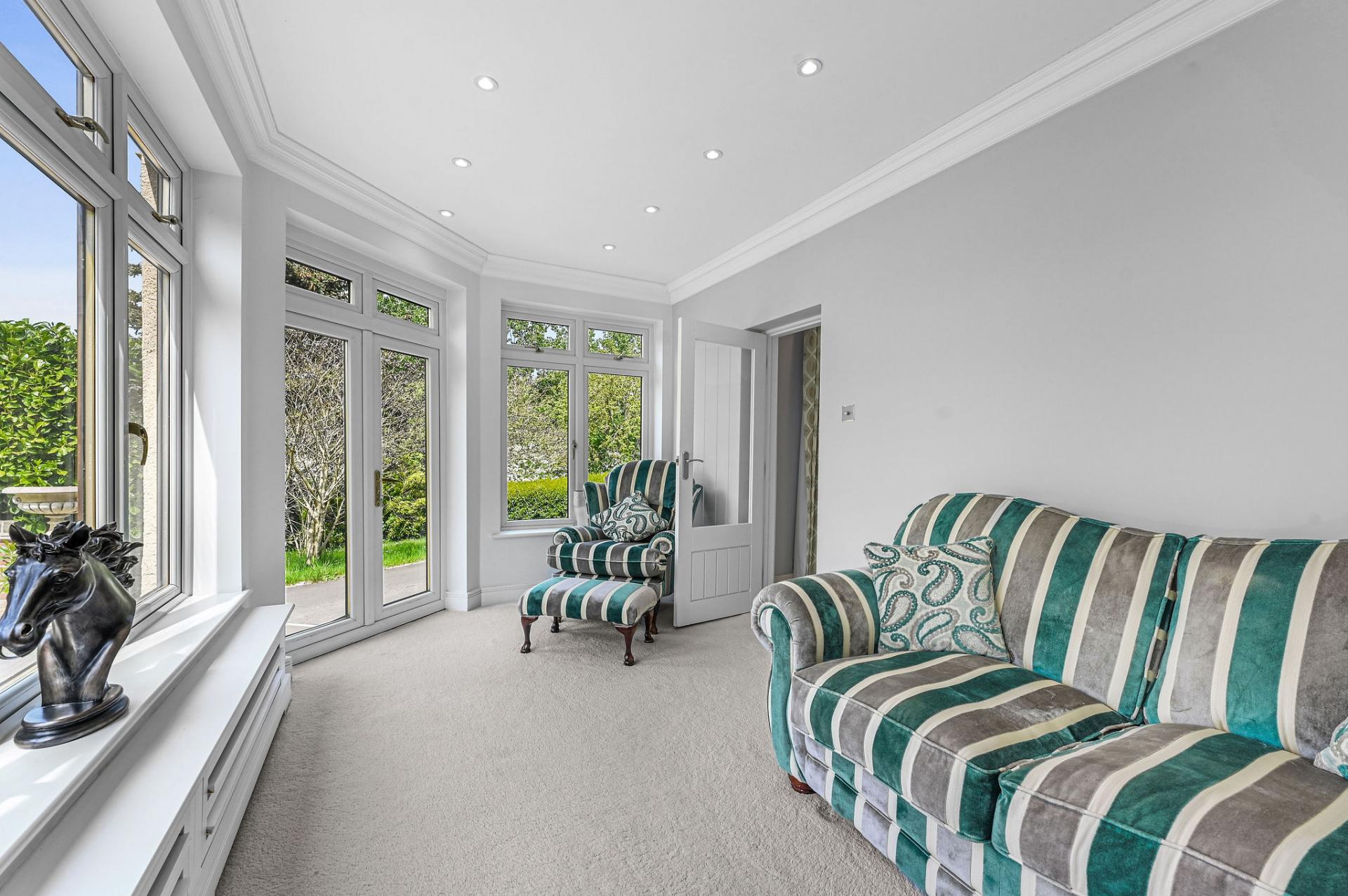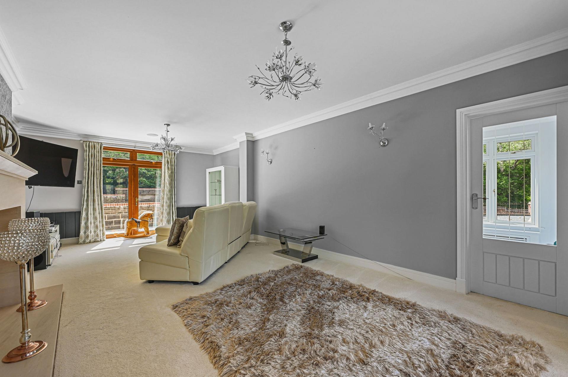 OUTSIDE The gardens and grounds offer a breath taking extension of the home, enveloping it in natural beauty and tranquillity. A grand terrace provides a perfect setting for al fresco dining and leisurely outdoor gatherings, while the meticulously landscaped lawns and mature trees enhance the estate's serene ambiance. The grounds are adorned with a charming stone fountain, which serves as a focal point, adding a touch of elegance to the outdoor space. The property features a versatile outbuilding perfect for a home office, gym, or extra living space. The expansive triple garage provides ample room for vehicles and storage, complemented by convenient off-road parking for guests. Above the garage is an unfinished annexe, ready to be finished to your own specification