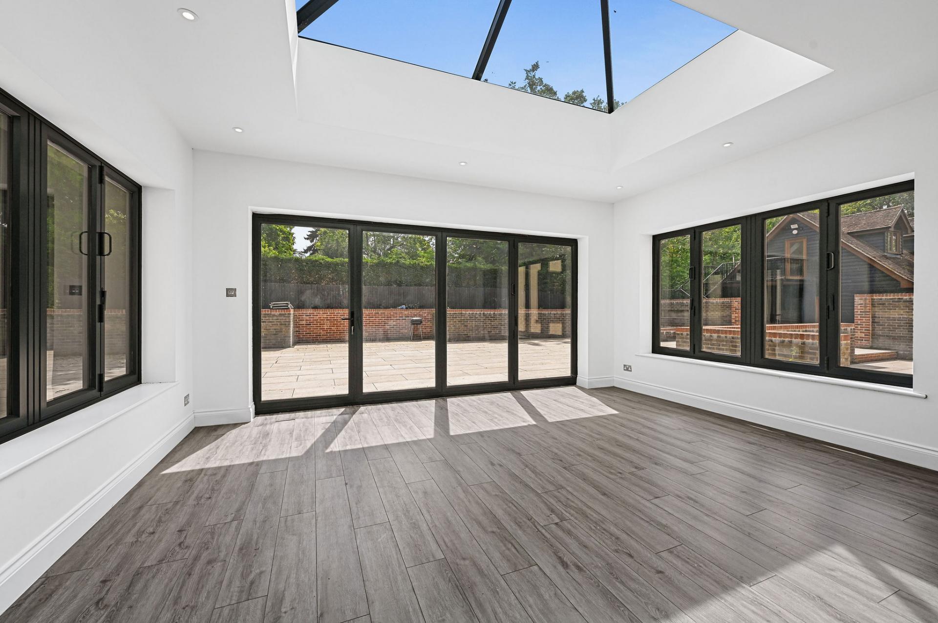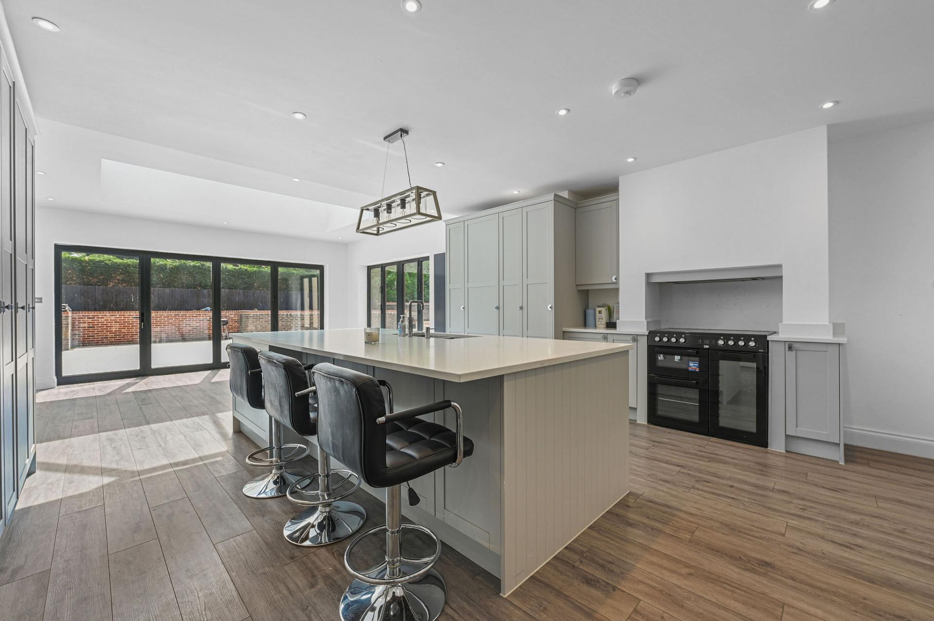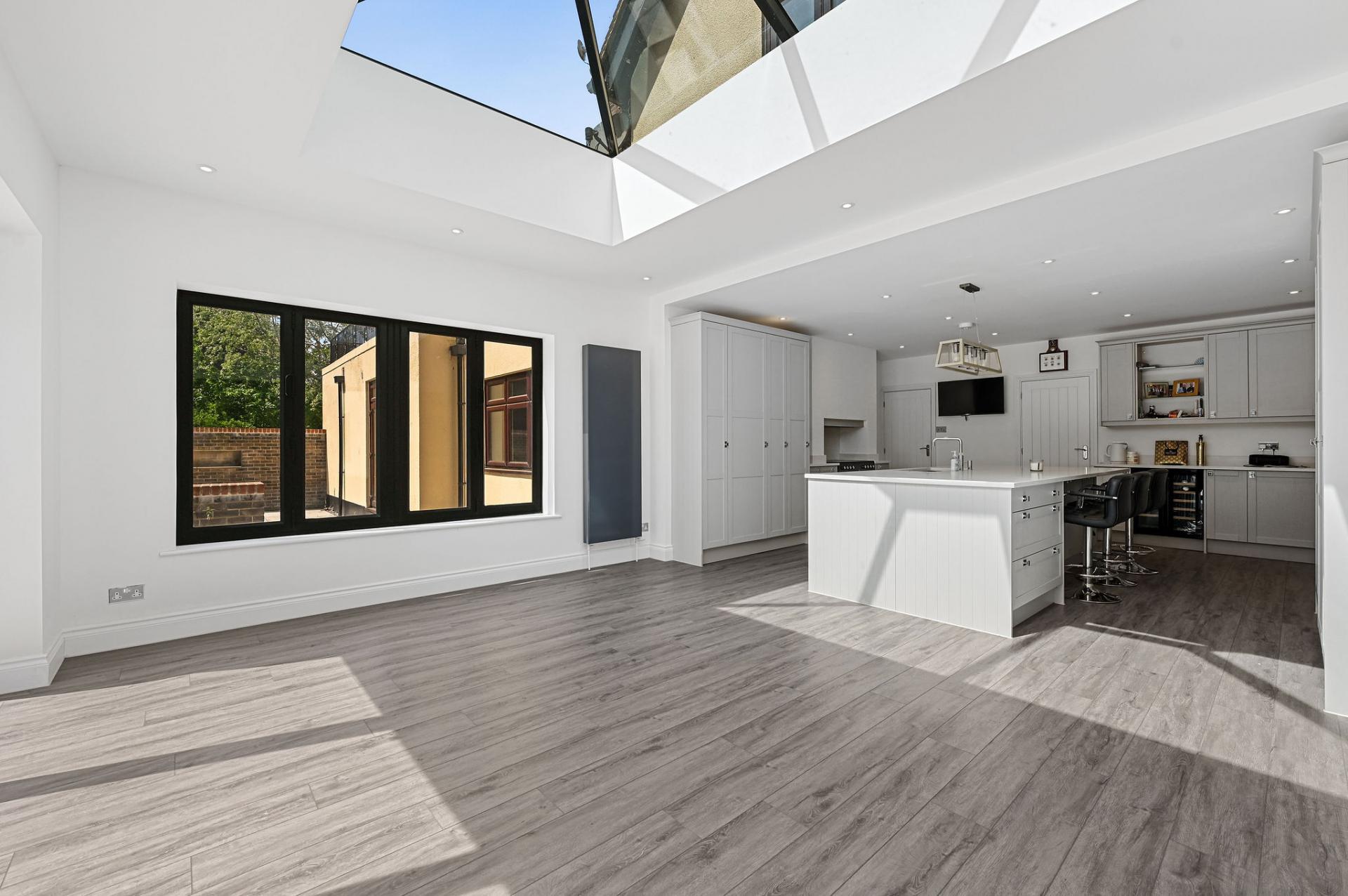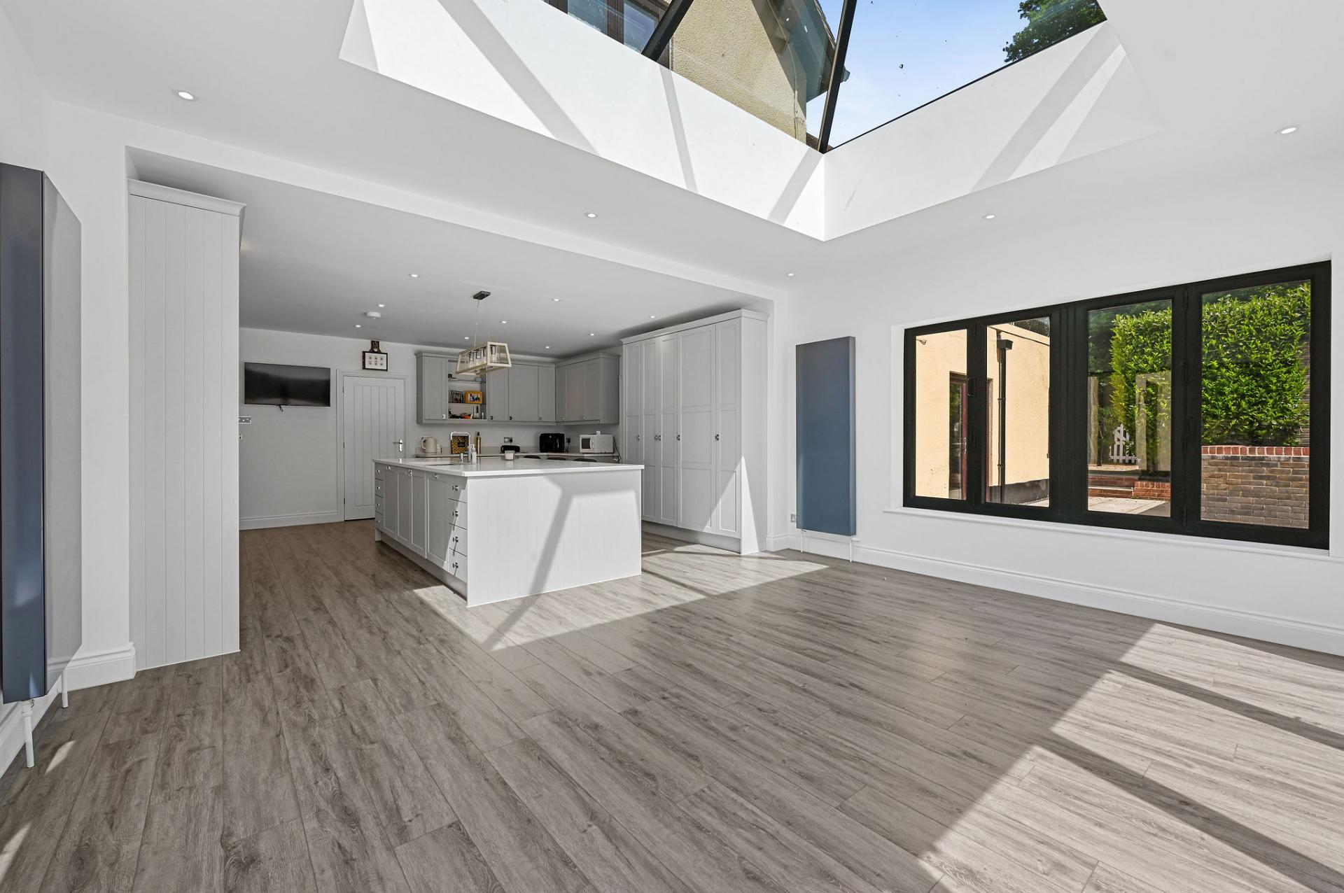 STEP INSIDE The ground floor is a perfect blend of elegance and functionality. As you enter through the inviting porch, you step into a stylish entrance hall with sophisticated panel detailing. The expansive kitchen/diner is a centerpiece, featuring sleek cabinetry, a central island, and a flood of natural light from the large skylights and sliding doors that open onto the terrace. Adjacent is a spacious reception room ideal for social gatherings, along with a cosy sitting room and study, offering versatile spaces for work and relaxation. The sunlit dining room is perfect for formal meals, enhancing the ground floor's charm and practicality.