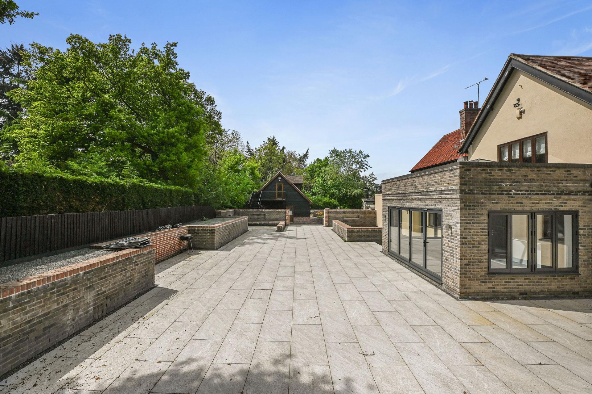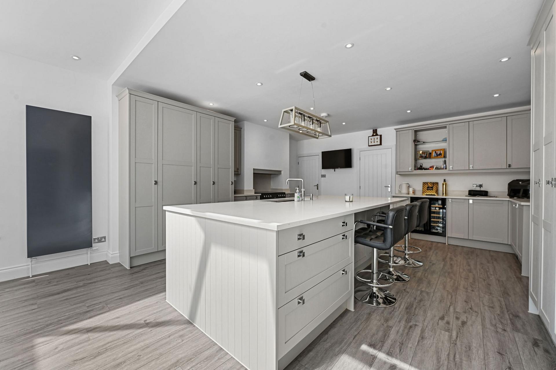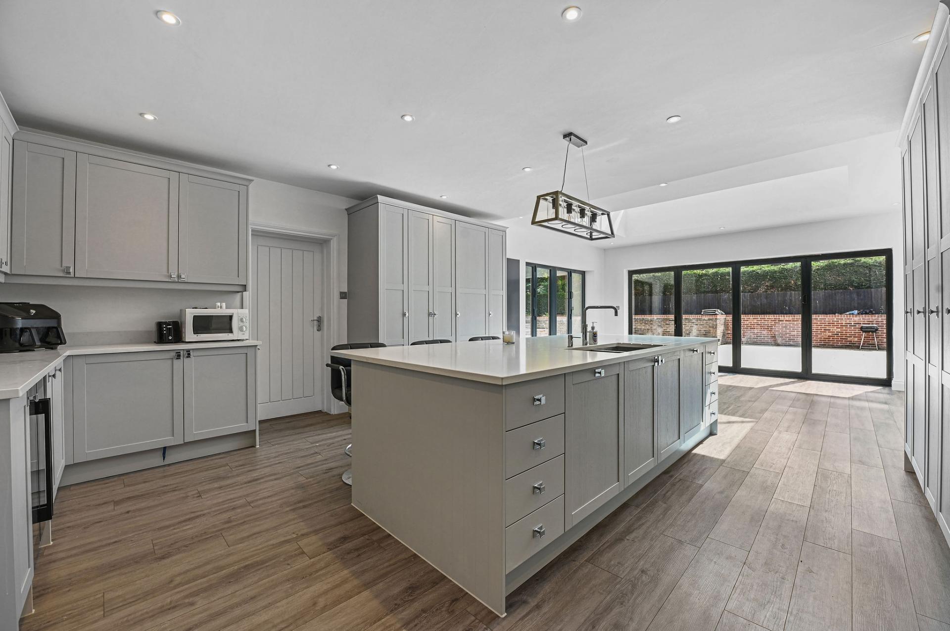 STEP INSIDE The ground floor is a perfect blend of elegance and functionality. As you enter through the inviting porch, you step into a stylish entrance hall with sophisticated panel detailing. The expansive kitchen/diner is a centerpiece, featuring sleek cabinetry, a central island, and a flood of natural light from the large skylights and sliding doors that open onto the terrace. Adjacent is a spacious reception room ideal for social gatherings, along with a cosy sitting room and study, offering versatile spaces for work and relaxation. The sunlit dining room is perfect for formal meals, enhancing the ground floor's charm and practicality.