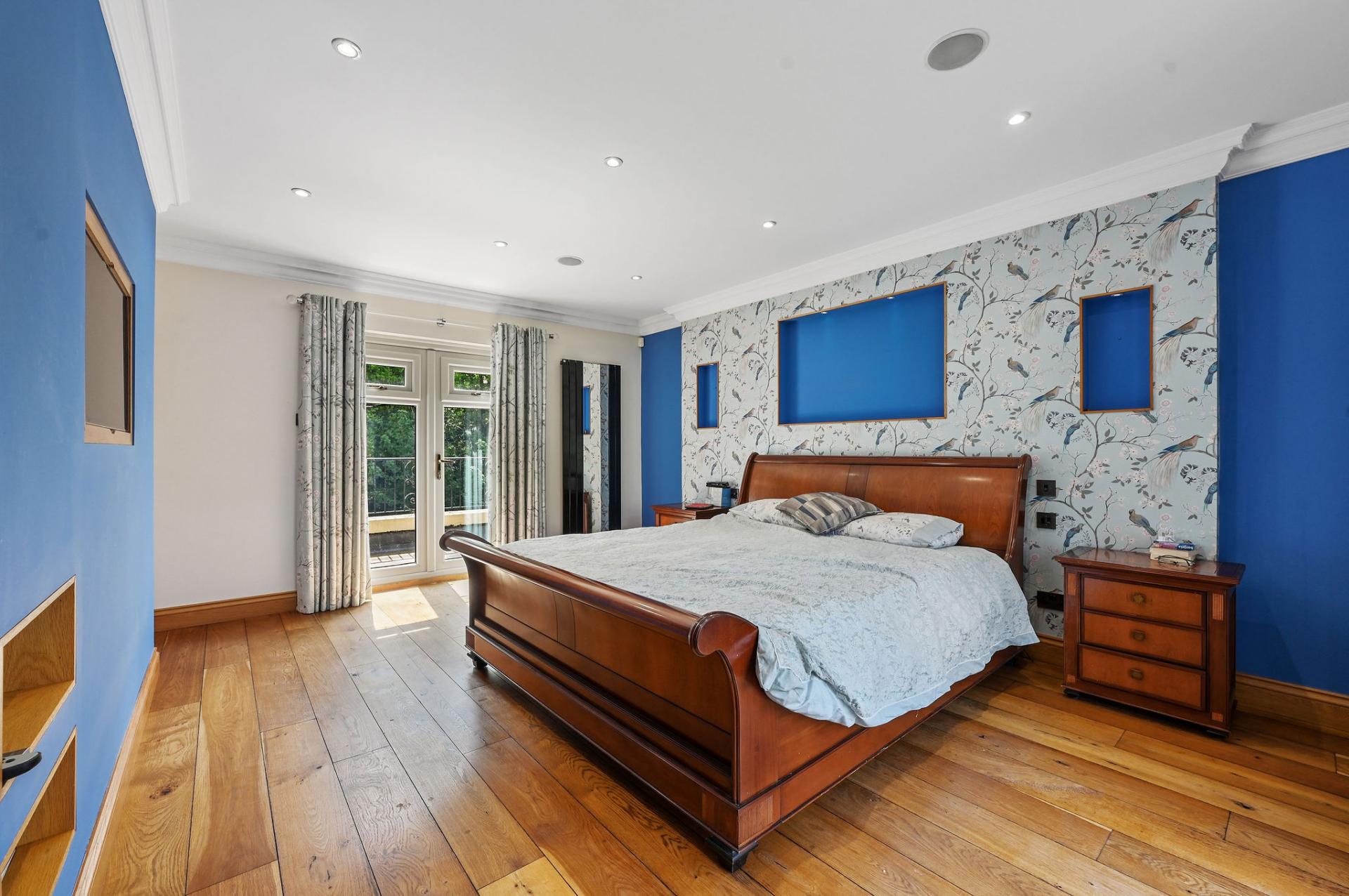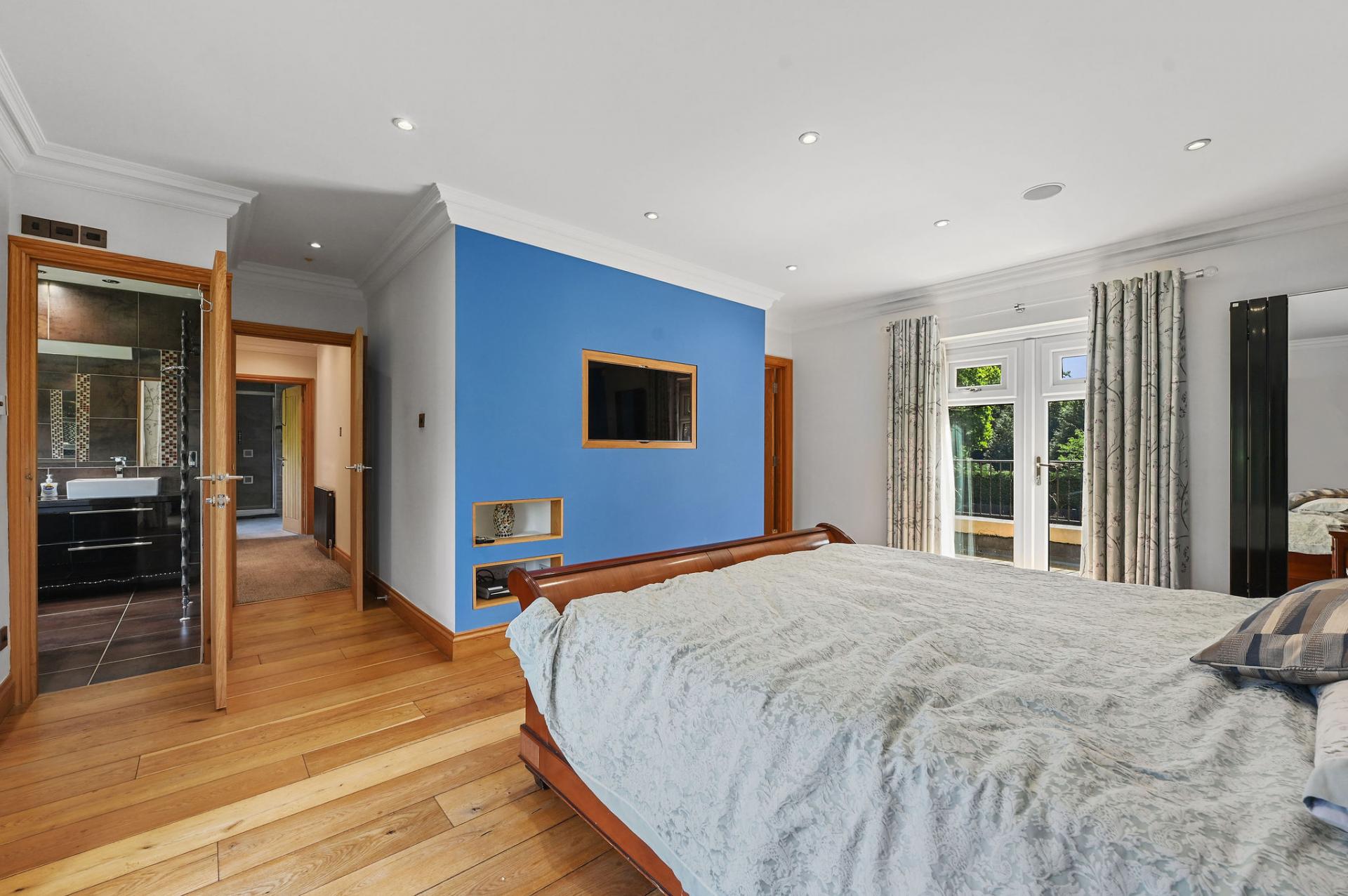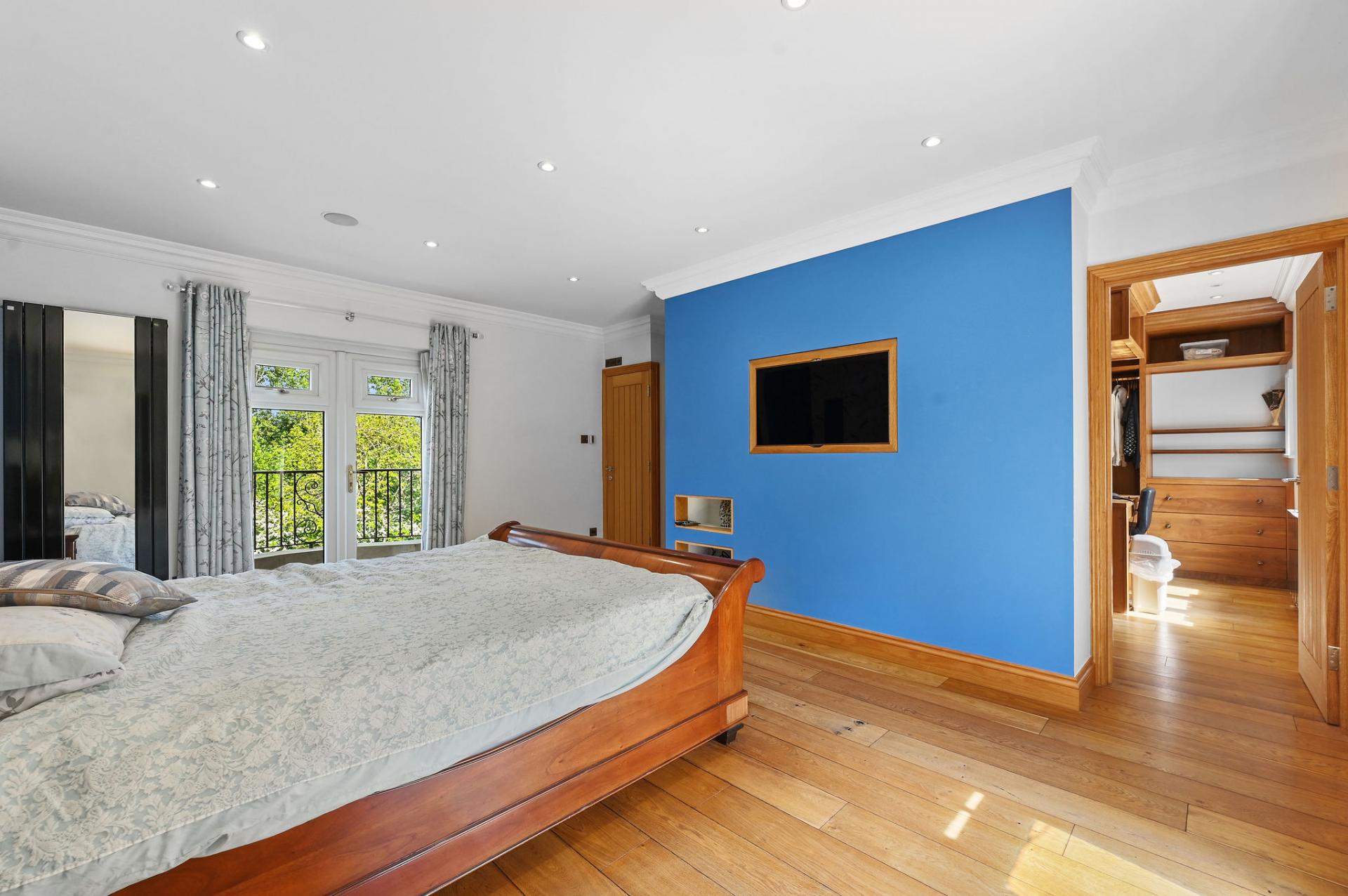 The first floor offers a luxurious and tranquil retreat with its four beautifully appointed bedrooms. The master suite is particularly impressive, featuring a spacious bedroom with access to a private balcony, an elegant en-suite bathroom, and a generous walk-in wardrobe with bespoke wooden fittings. The additional bedrooms are equally inviting, with another bedroom having access to a balcony. Complementing these are sleek, modern shower rooms, showcasing high-quality fixtures and a refined marble finish. This floor perfectly combines comfort and style, making it an ideal space for rest and relaxation.