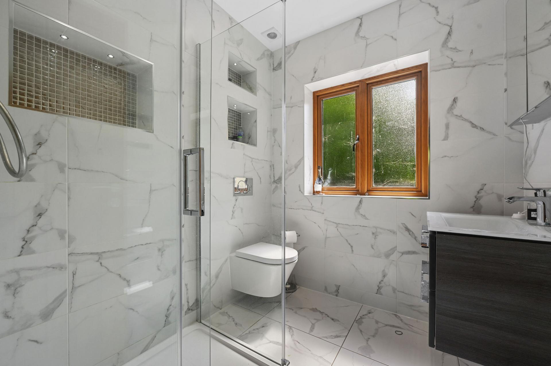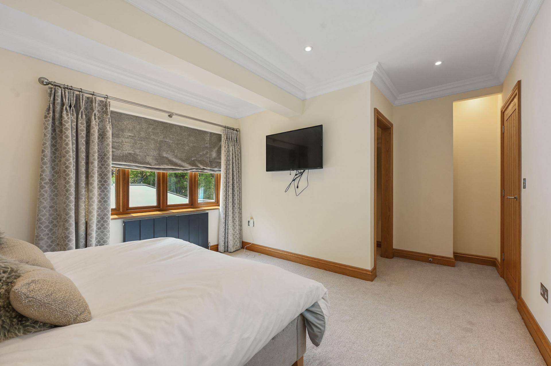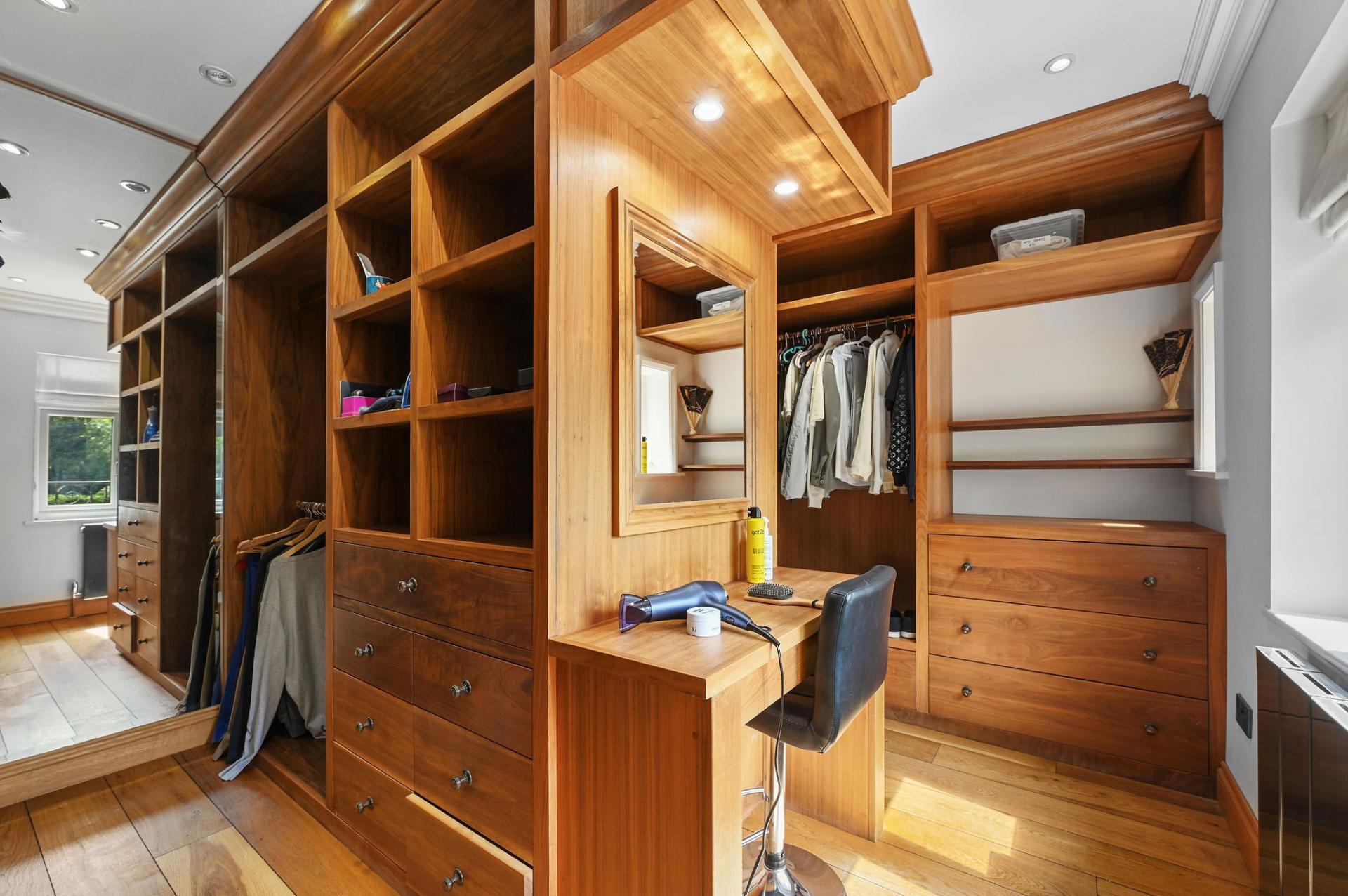 The first floor offers a luxurious and tranquil retreat with its four beautifully appointed bedrooms. The master suite is particularly impressive, featuring a spacious bedroom with access to a private balcony, an elegant en-suite bathroom, and a generous walk-in wardrobe with bespoke wooden fittings. The additional bedrooms are equally inviting, with another bedroom having access to a balcony. Complementing these are sleek, modern shower rooms, showcasing high-quality fixtures and a refined marble finish. This floor perfectly combines comfort and style, making it an ideal space for rest and relaxation.