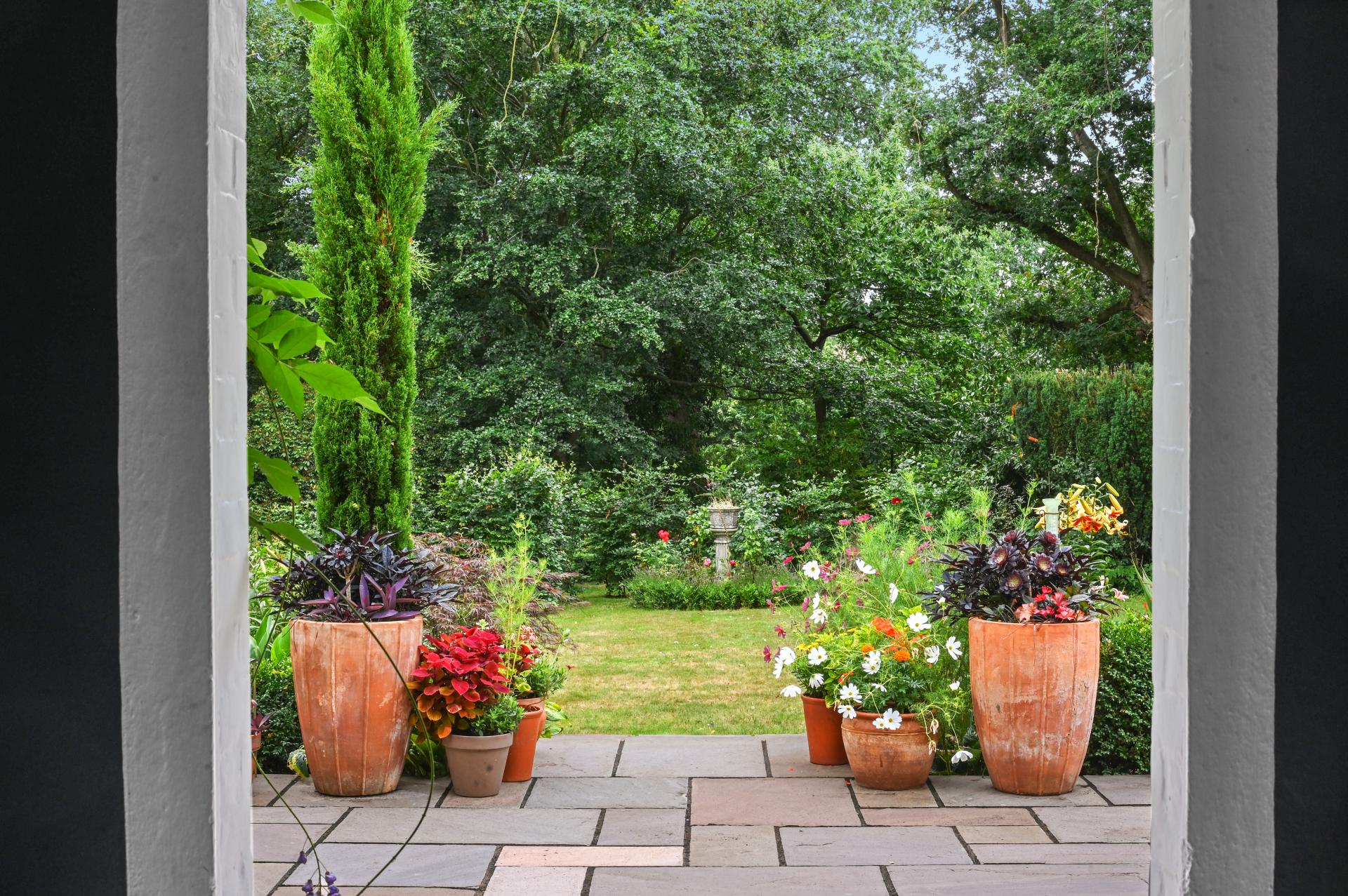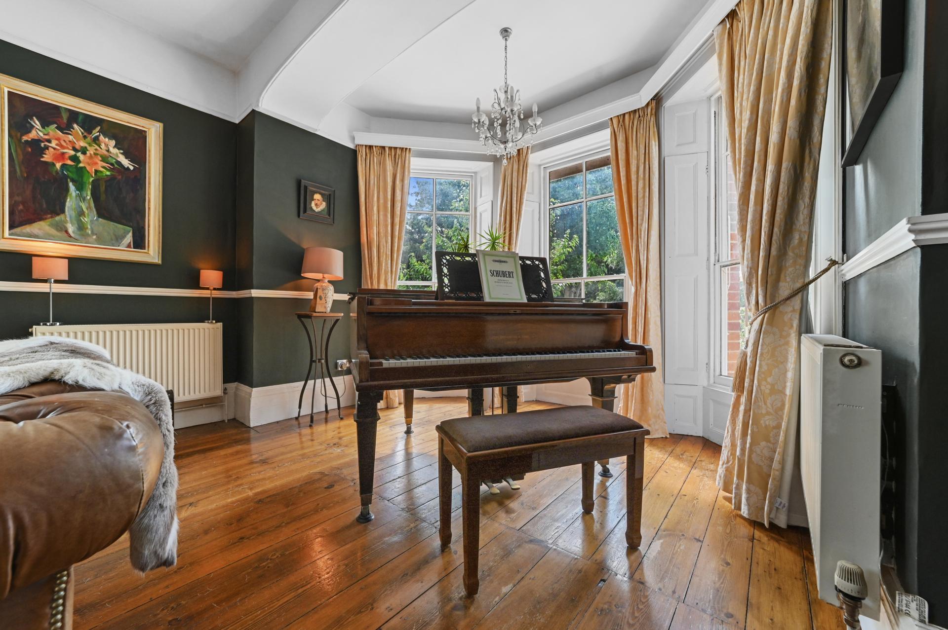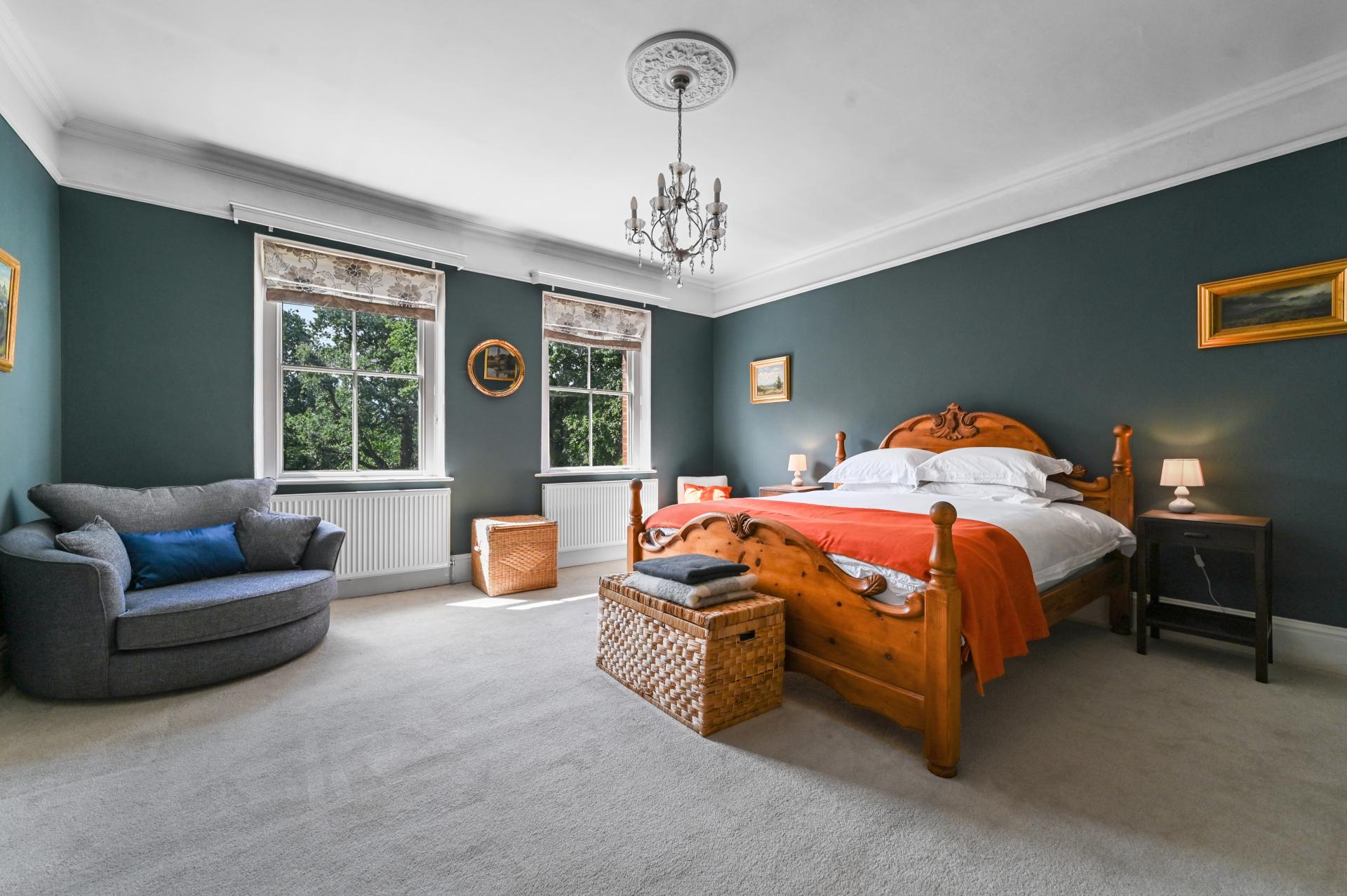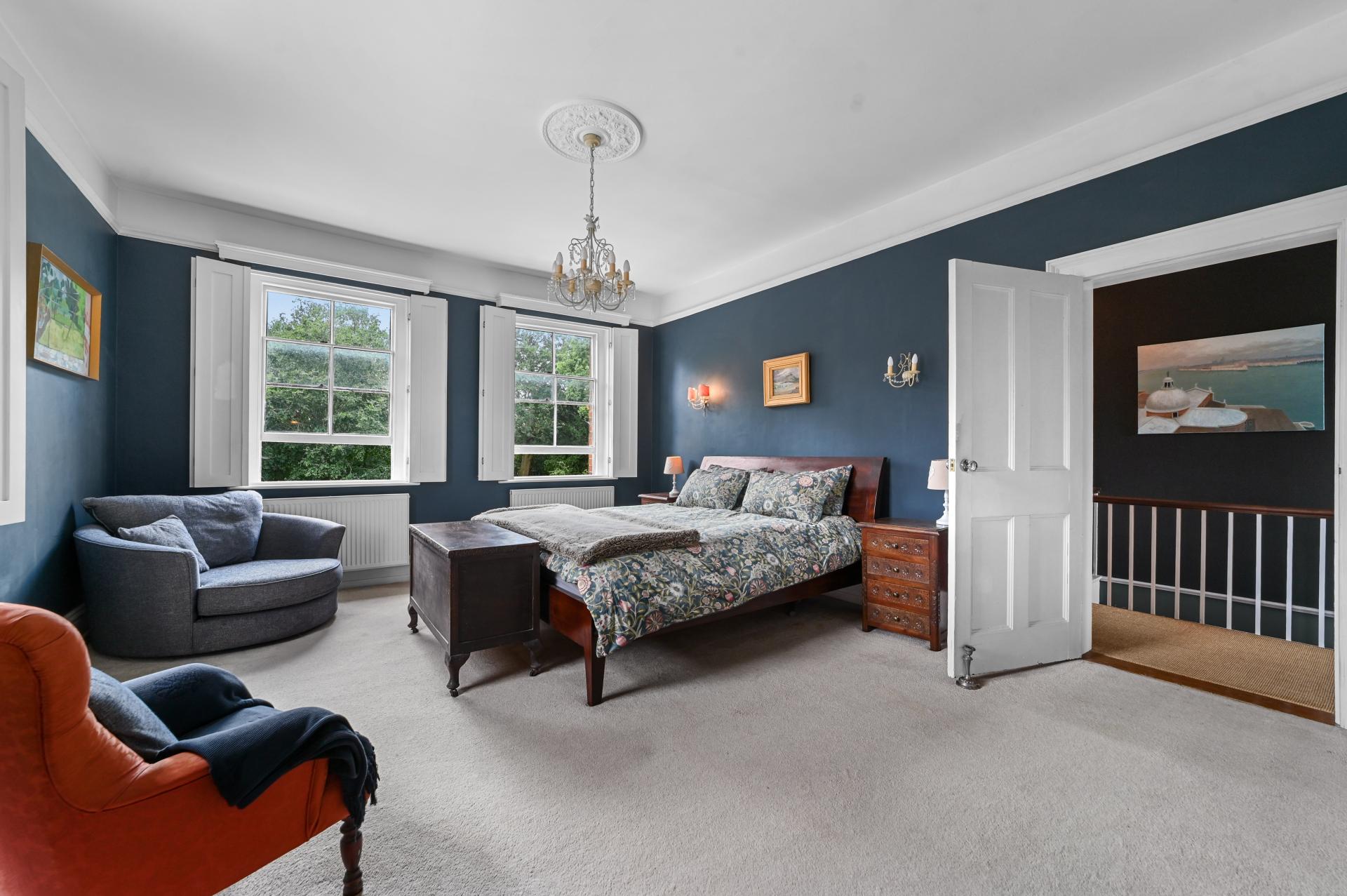 The study, with doors leading to the garden and a fireplace, provides the perfect nook for those seeking a quiet retreat for work or study. The elegant sitting room, featuring bay windows and a fireplace with a stove, opens to a conservatory that allows an abundance of natural light and offers uninterrupted views of the surrounding landscape.