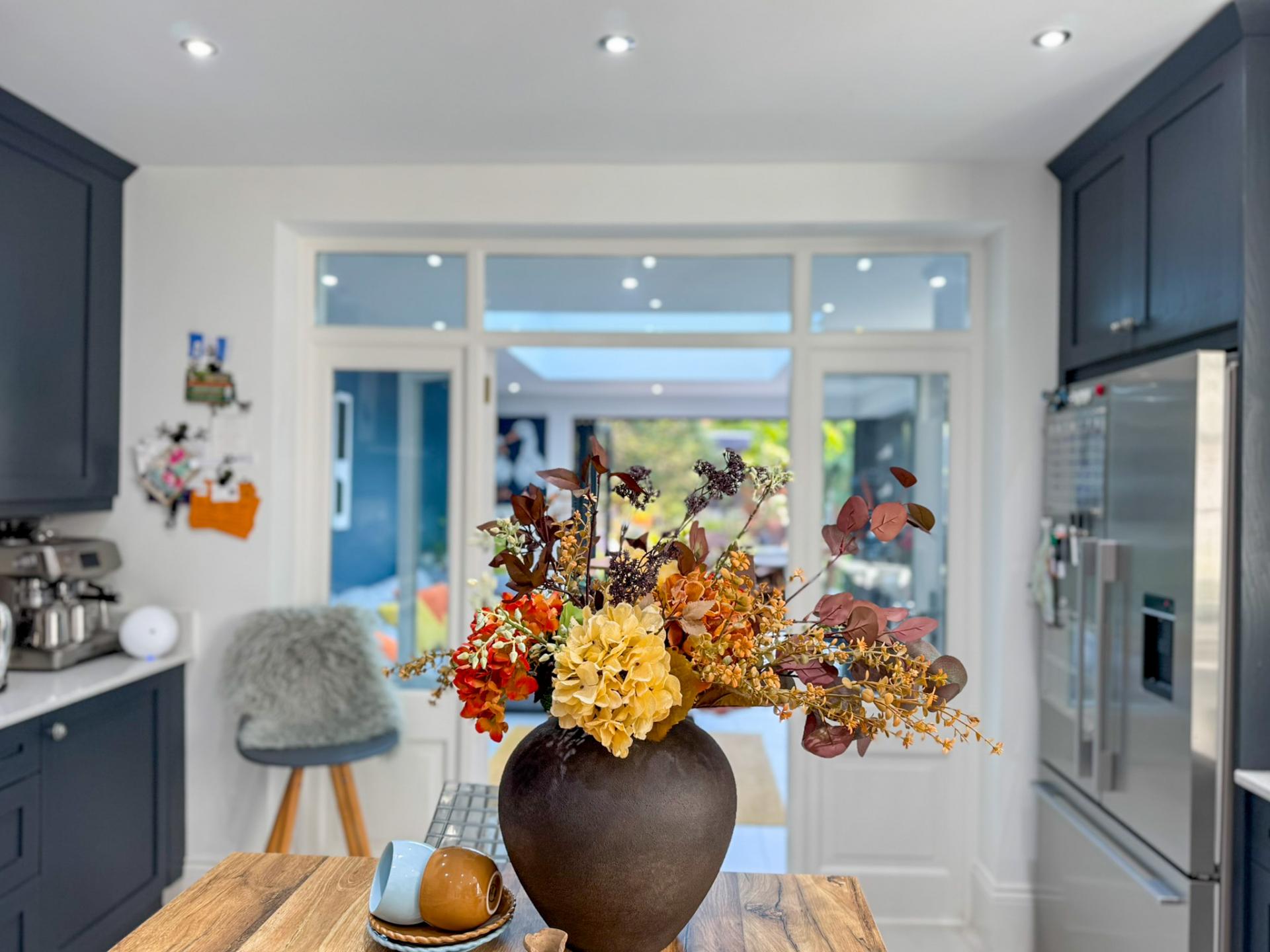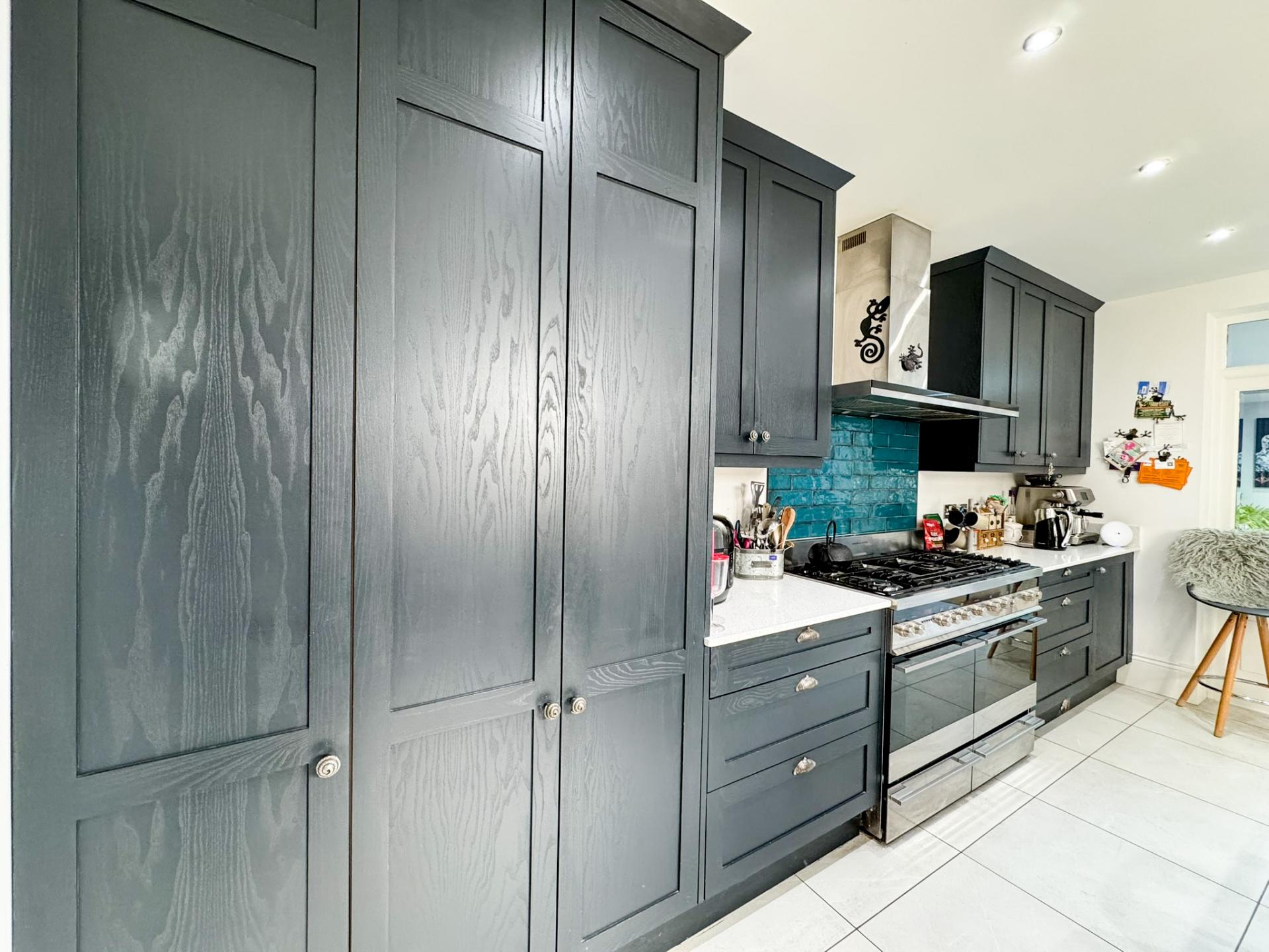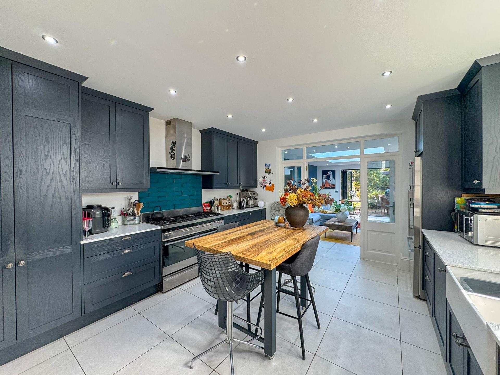 The kitchen is both stylish and practical, with underfloor heating and featuring bespoke beech cabinetry, quartz worktops, and premium Fisher & Paykel appliances. It flows effortlessly into the garden room, making it ideal for everyday family life and entertaining. A separate dining room adds further flexibility, suitable for both relaxed meals and formal occasions.