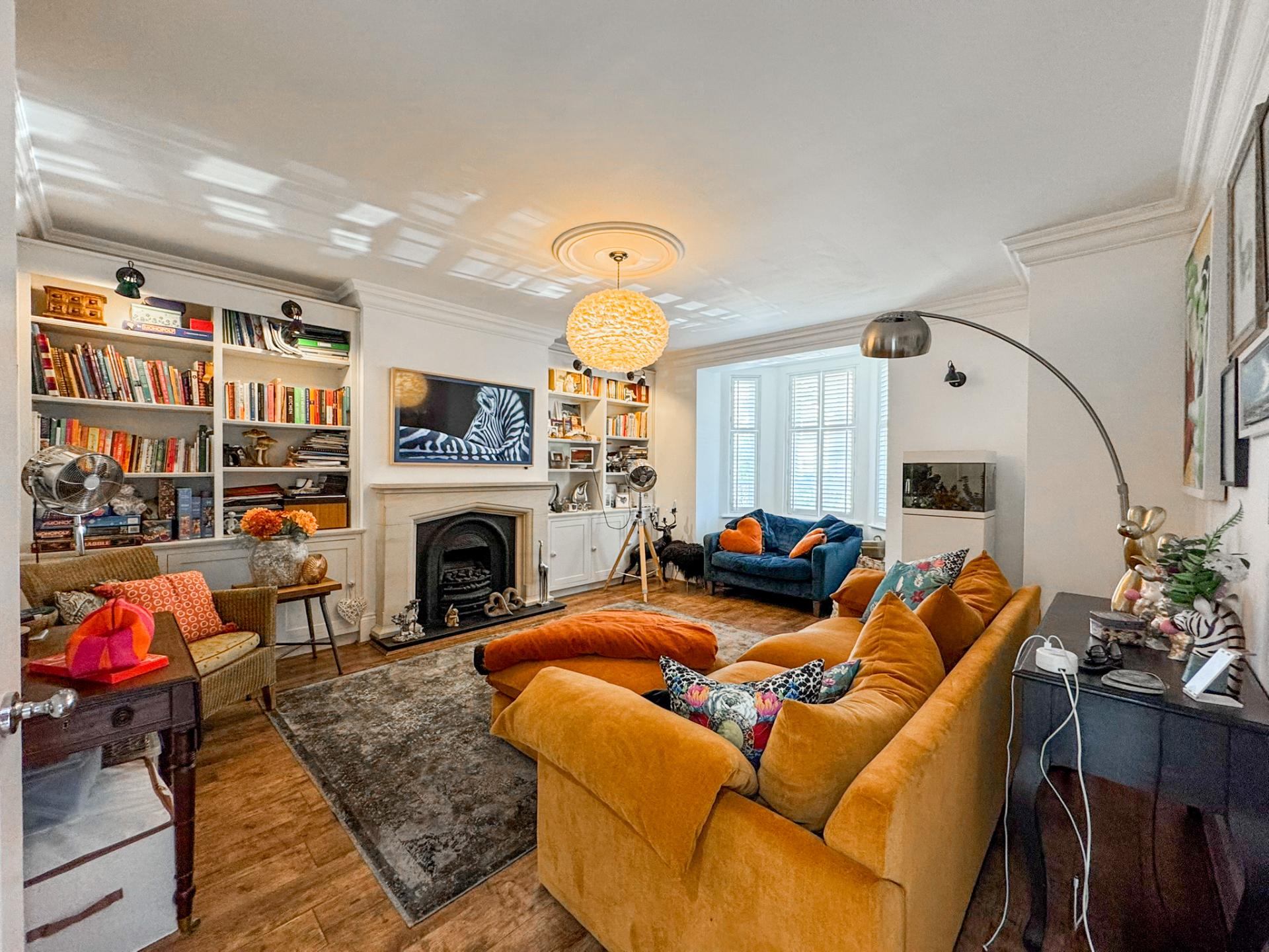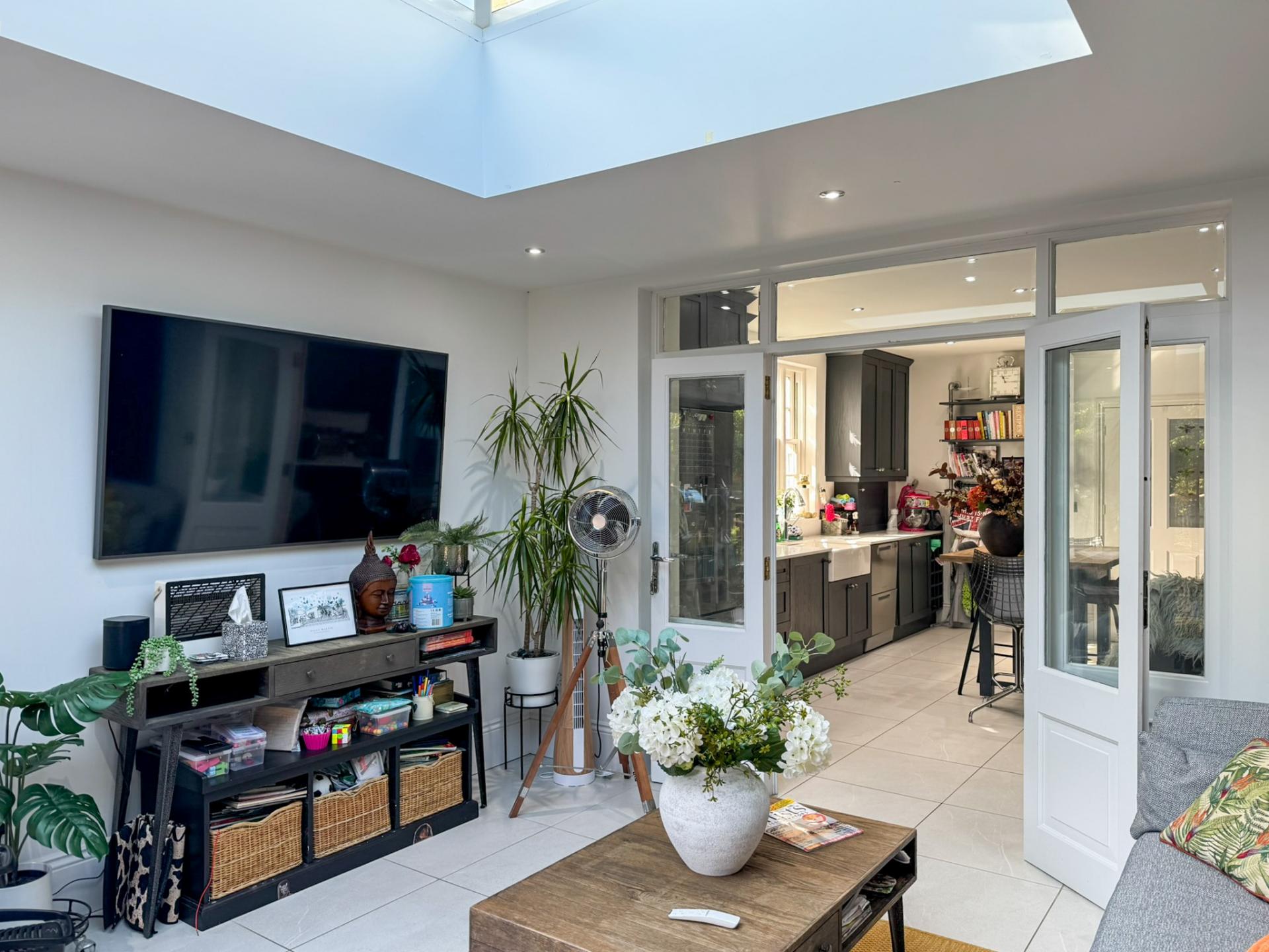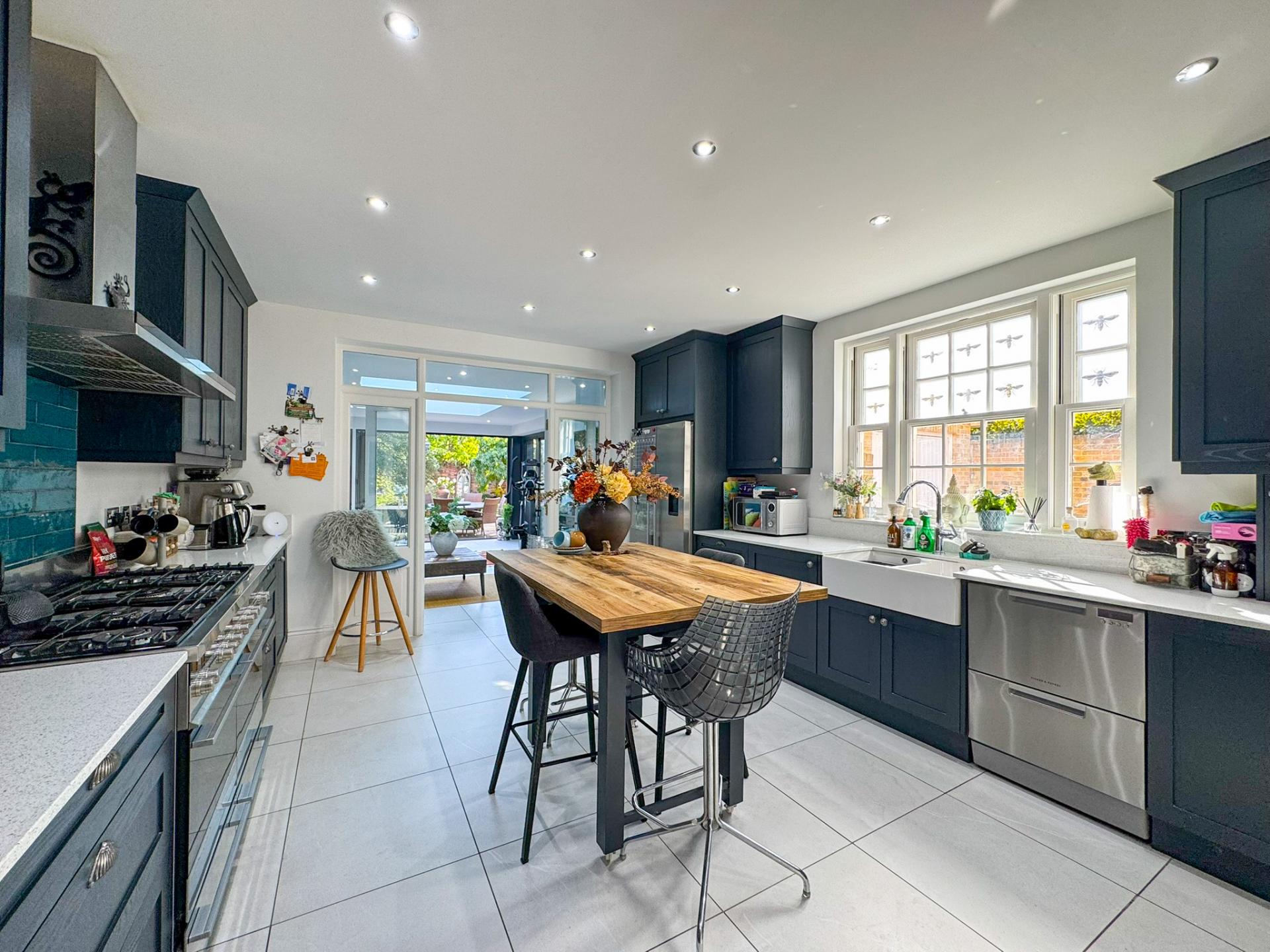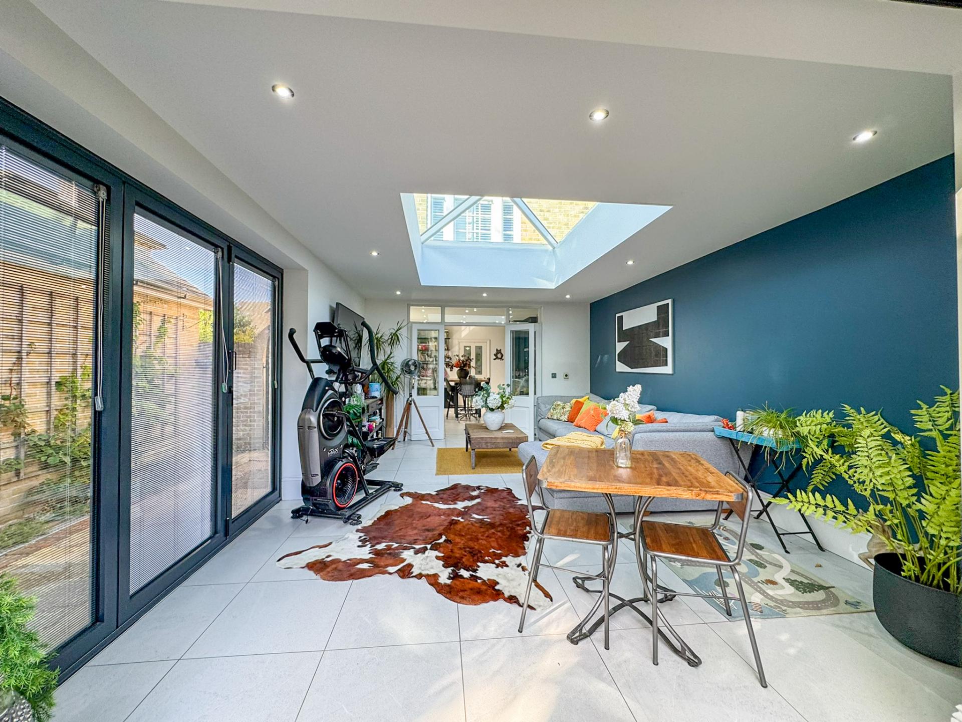 At the front of the home, a sophisticated sitting room boasts a charming fireplace and a large bay window, creating a warm and inviting atmosphere. The heart of the home lies in the stunning open-plan garden room, with underfloor heating and bathed in natural light from an impressive roof lantern and seamlessly connected to the patio via full-width, double-aspect bi-folding doors-perfect for indoor-outdoor living.