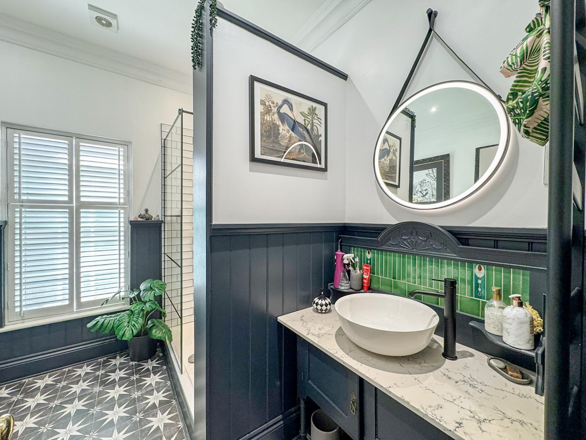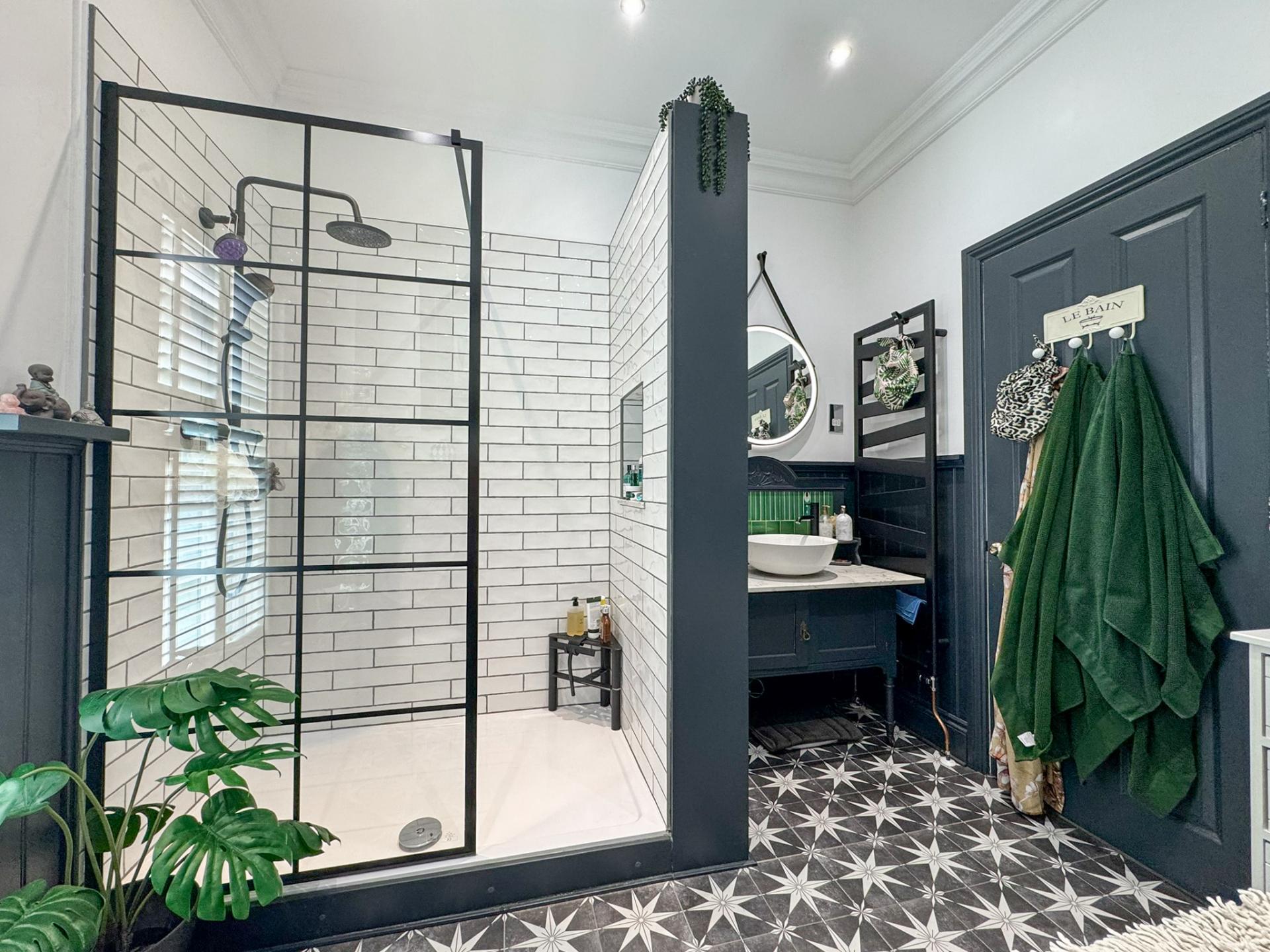 The family bathroom blends period elegance with contemporary style, featuring a striking monochrome tiled floor, a freestanding bath, and a separate walk-in shower. Large windows and high ceilings throughout the upper floor ensure a bright and airy ambiance.