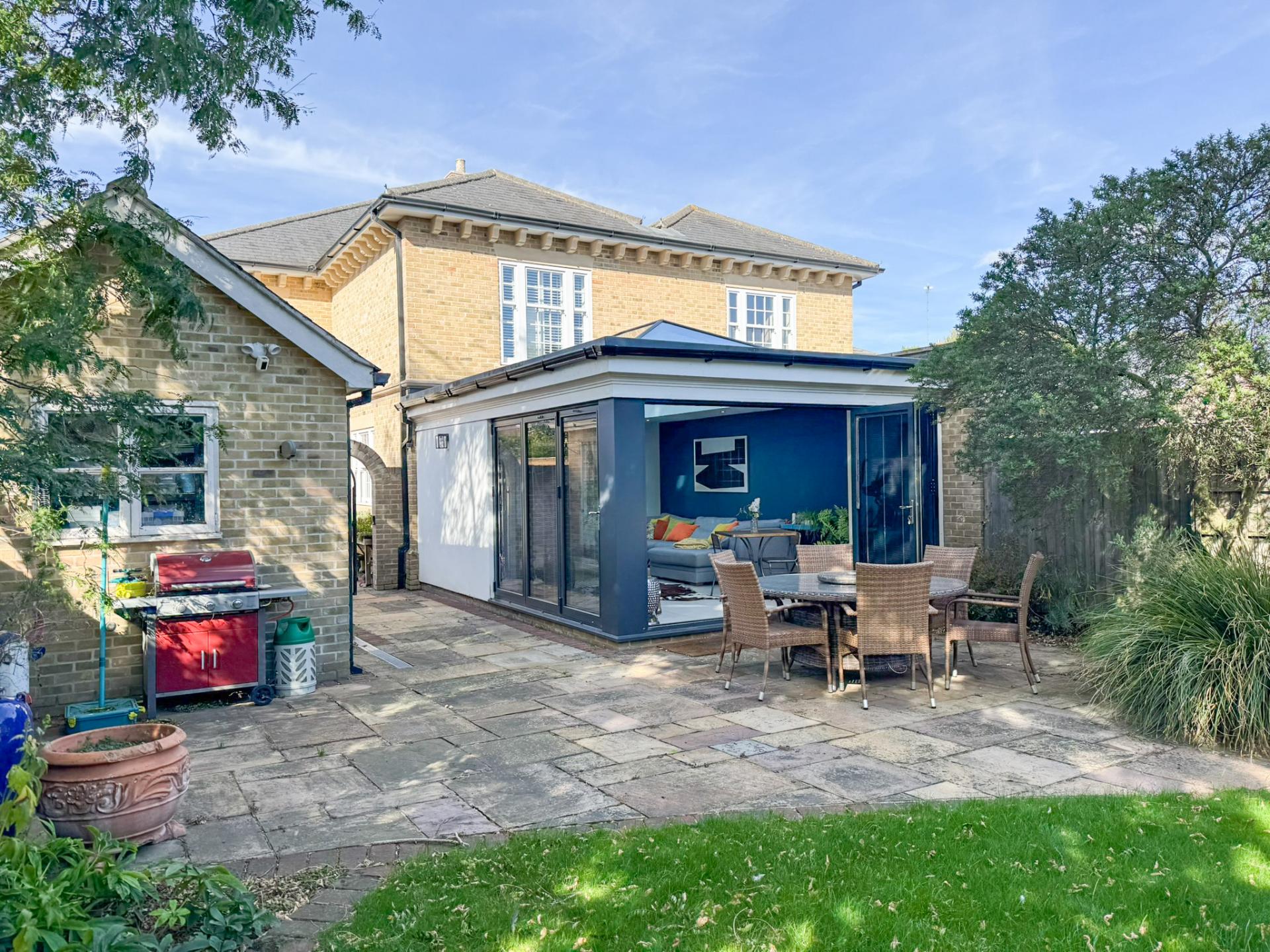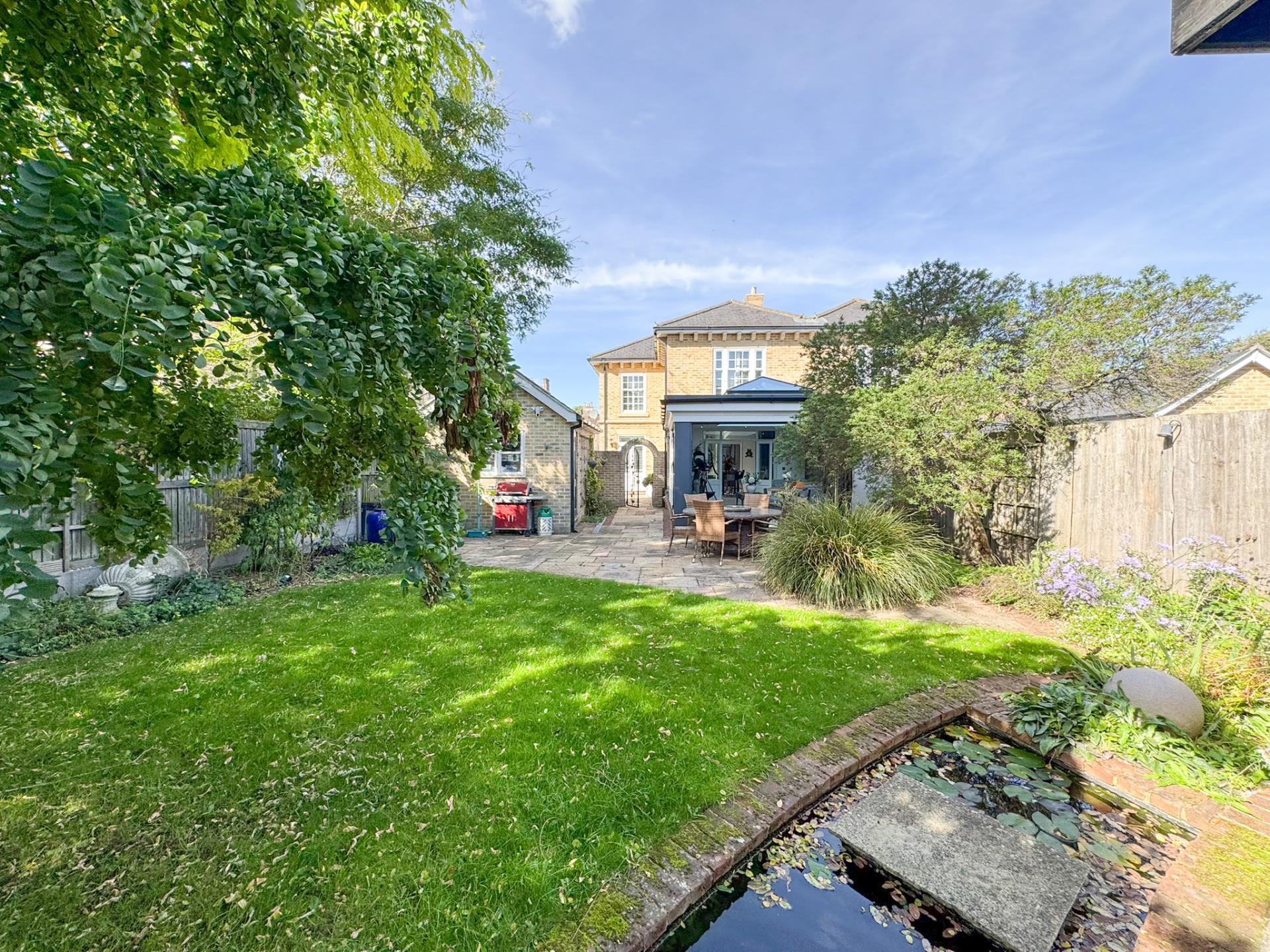 A broad patio adjoins the rear of the property, providing an ideal setting for al fresco dining and entertaining. At the far end of the garden, a stylish covered seating area offers a sheltered escape beside a serene pond, framed by characterful brickwork and established planting-perfect for relaxing in all seasons.