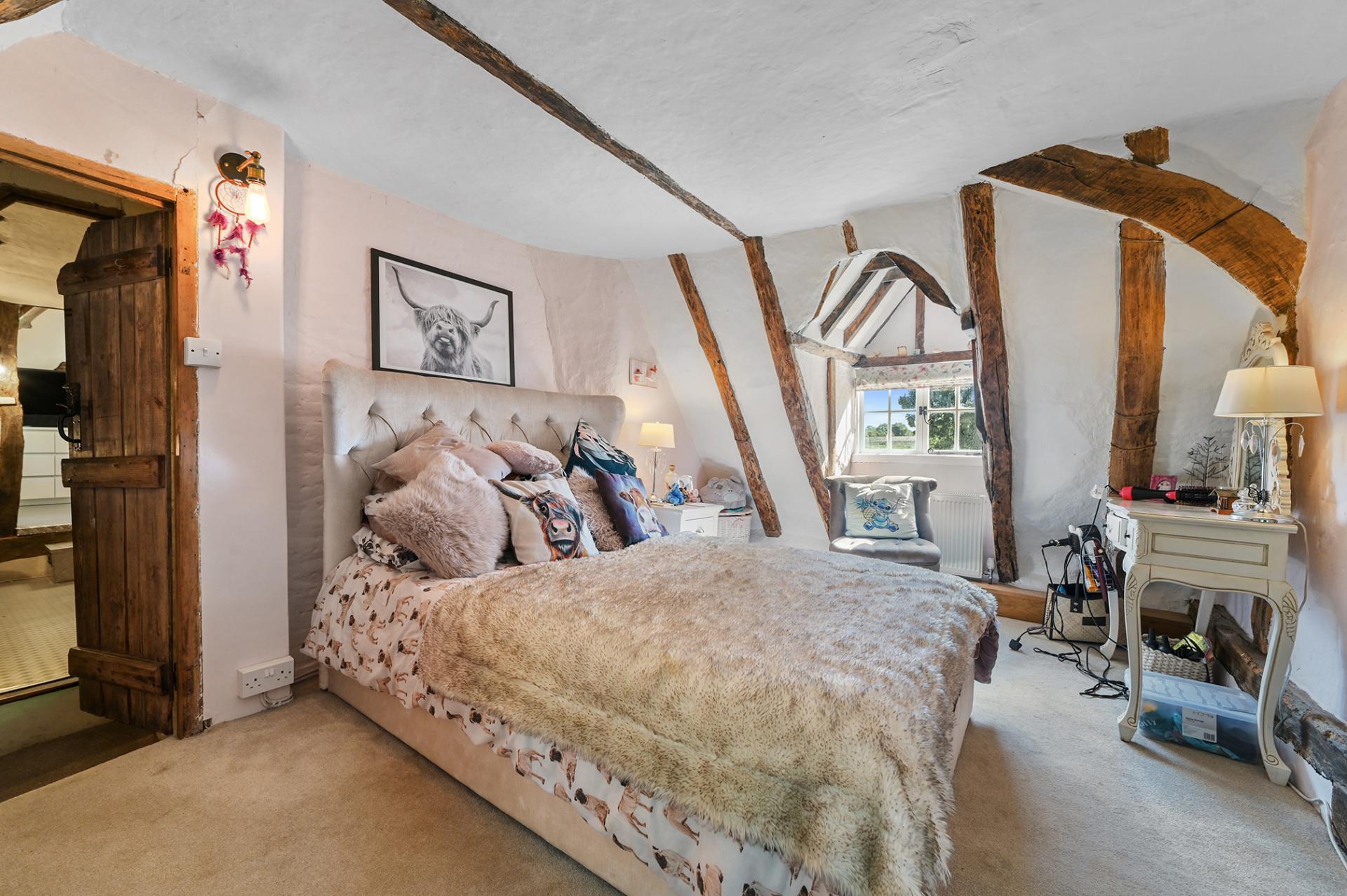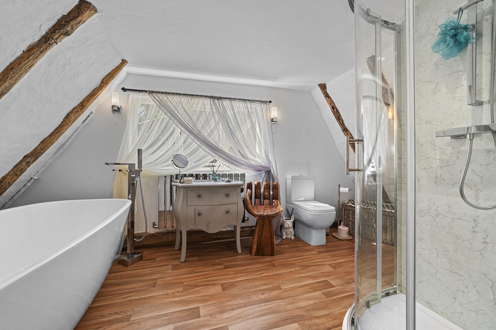 The property offers five comfortable bedrooms, on the first floor you have three bedrooms and on the ground floor two further bedrooms including a guest bedroom with French doors opening to the gardens and offering stunning views of the extensive grounds. The first floor features a spacious master bedroom with exposed beams and an en-suite bathroom complete with a free-standing bath, tiled shower cubicle, WC, and pedestal sink unit. Two more delightful bedrooms, each with their own unique charm, complete the first floor.