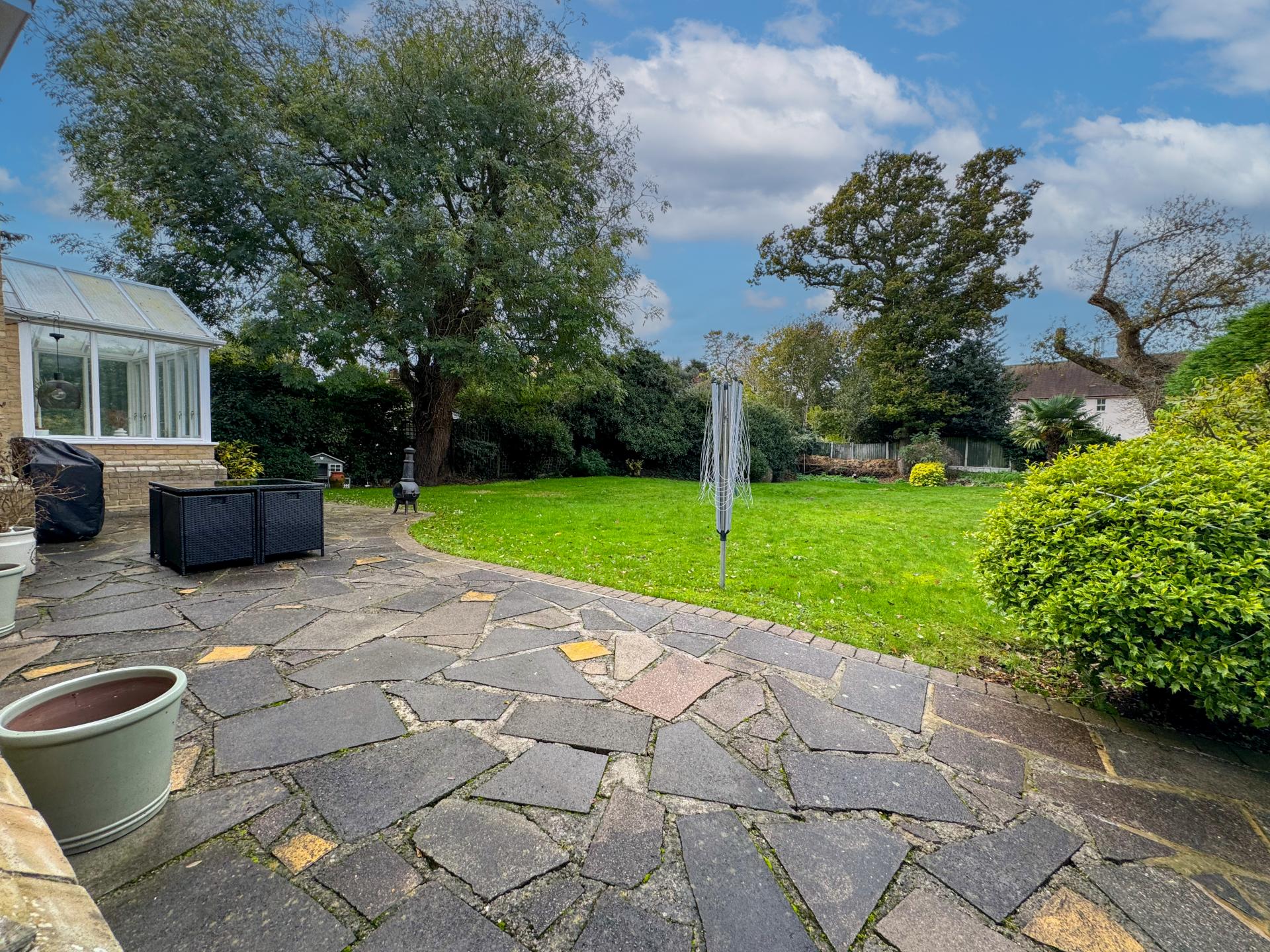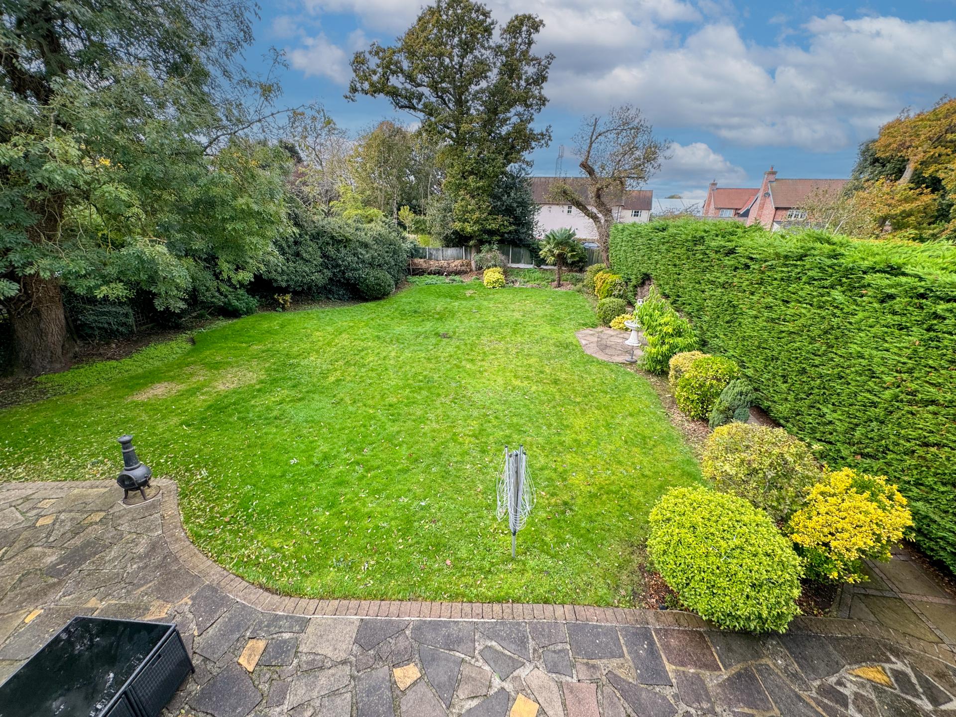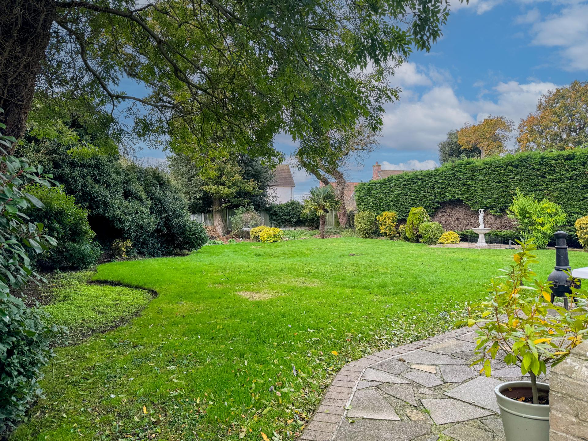 At the rear, the expansive garden offers a tranquil retreat, with a large lawn area ideal for family activities, children's play, or simply enjoying the outdoors. A spacious patio area provides the perfect setting for alfresco dining or entertaining guests, while the established planting and trees offer privacy and a picturesque backdrop. The grounds are designed for both relaxation and outdoor living, making them a perfect extension of the home for families and those who love to entertain.