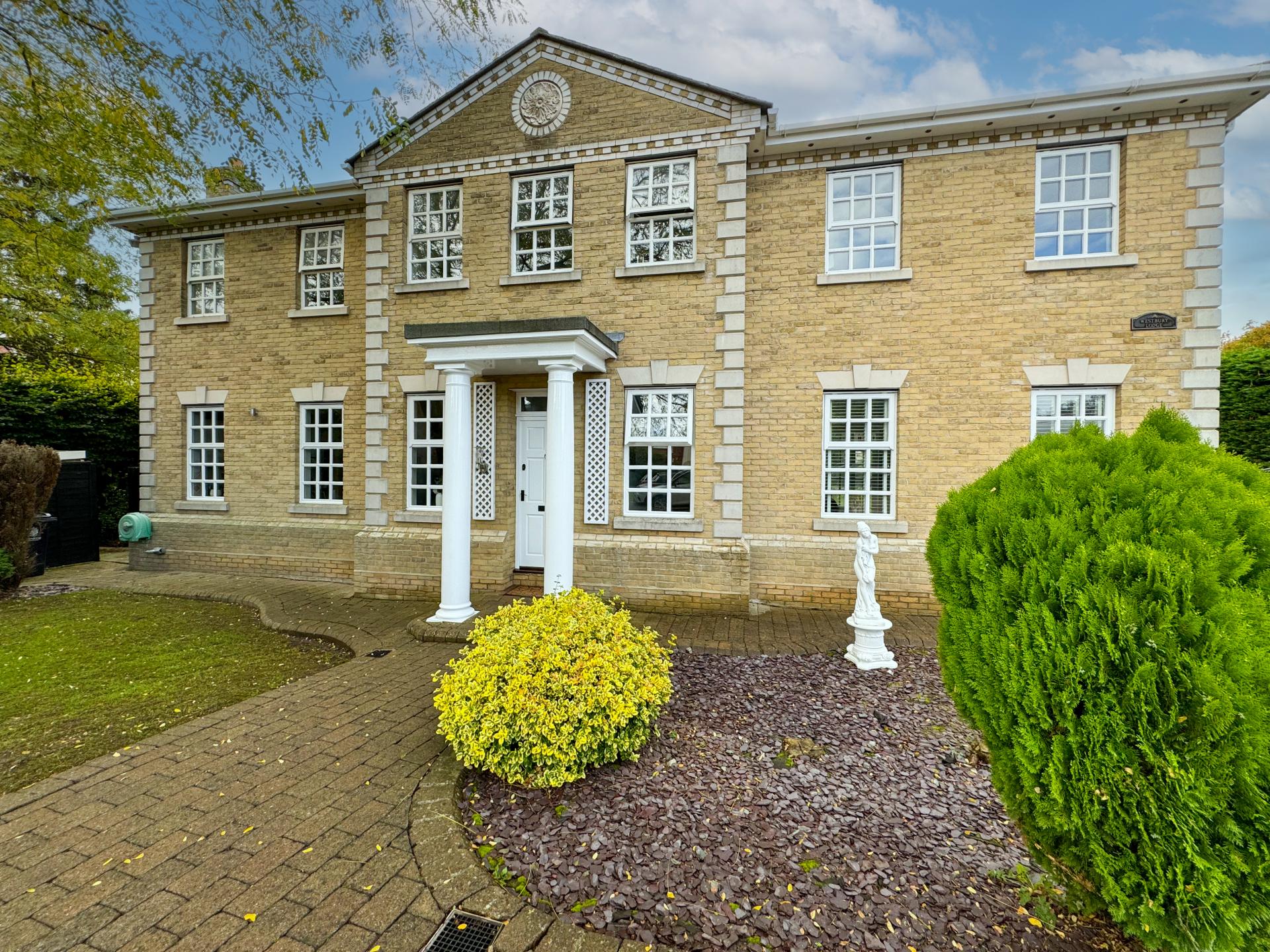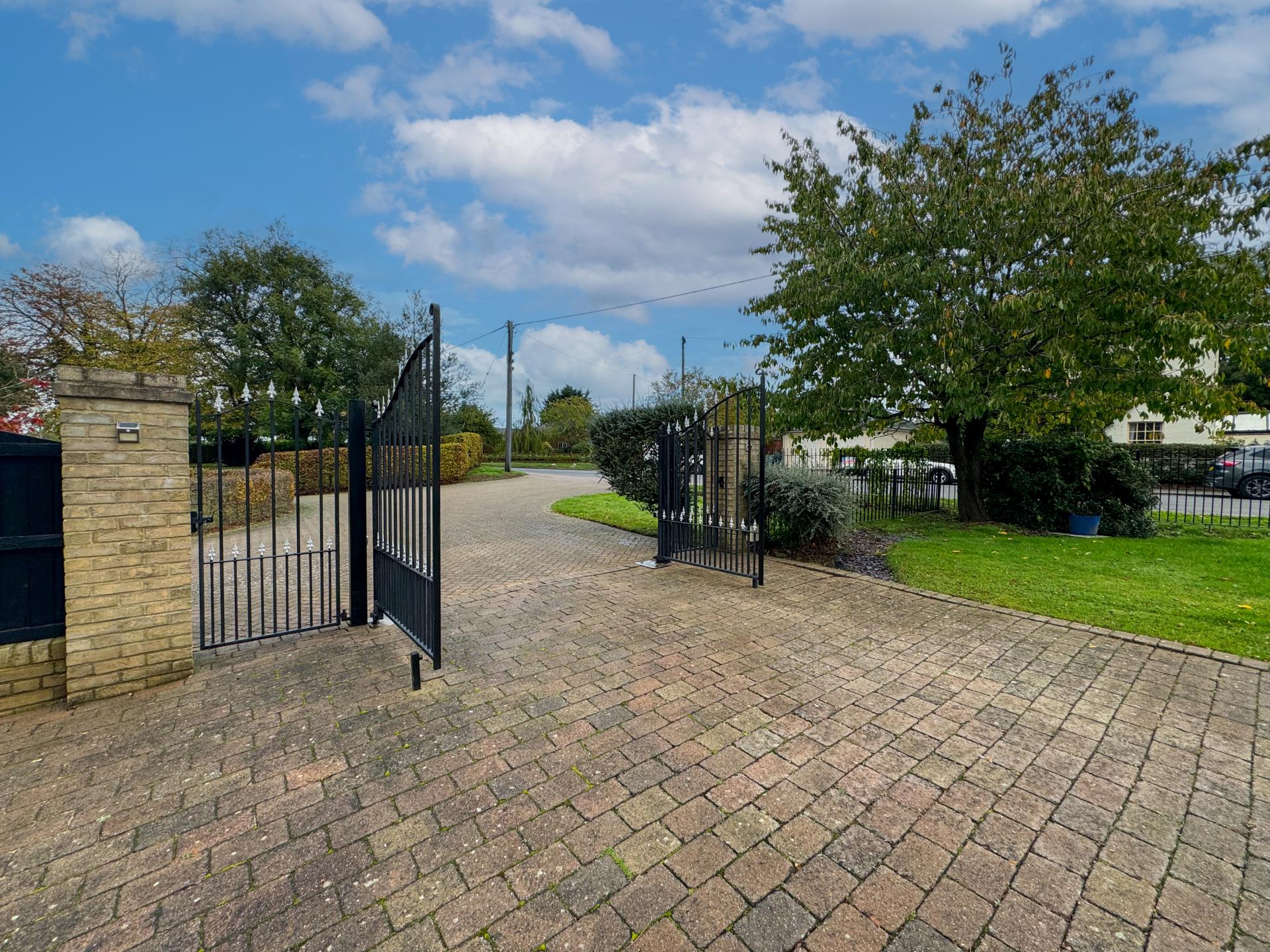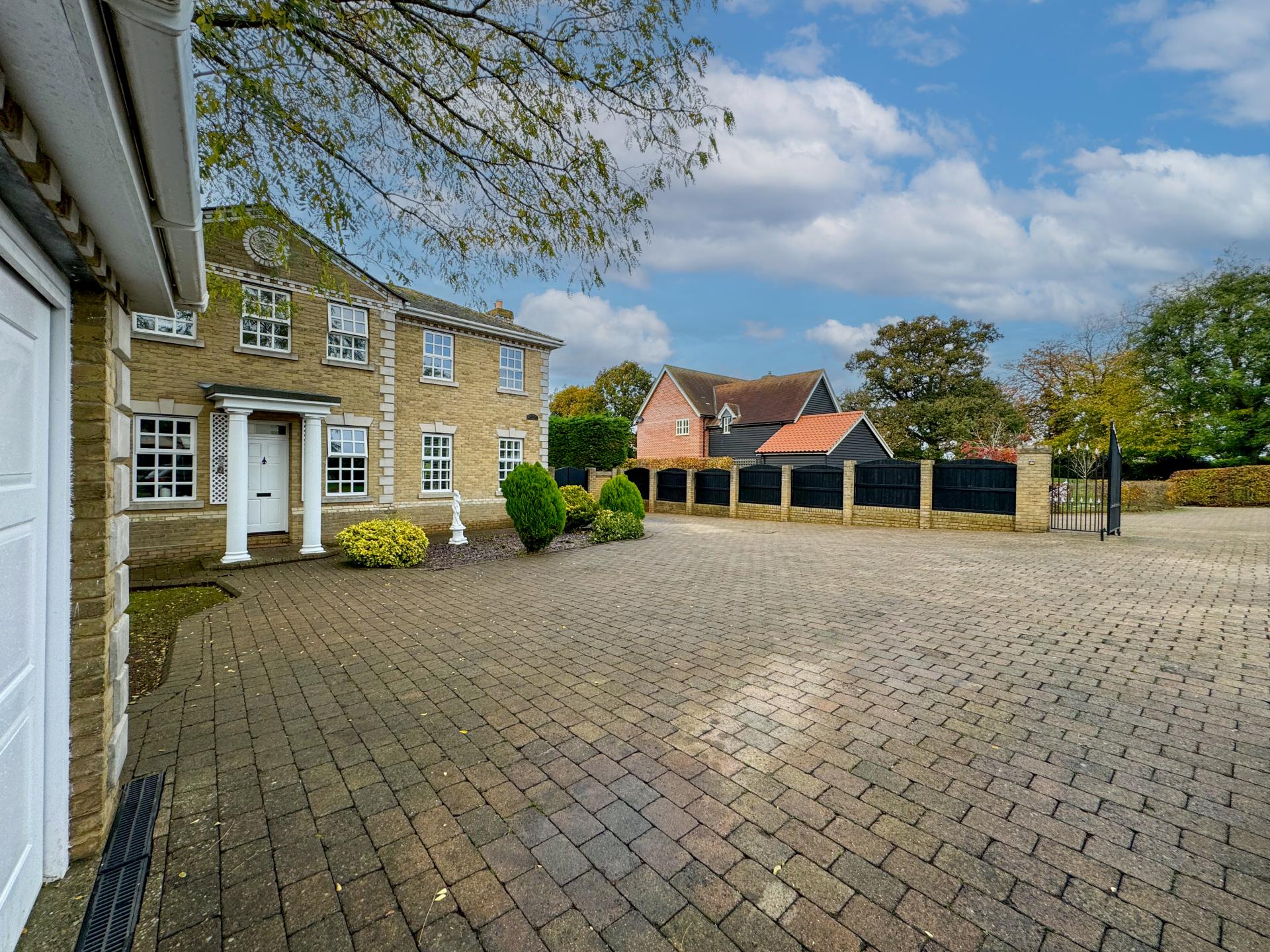 OUTSIDE The grounds and garden provide a serene and private outdoor space that perfectly complements the grandeur of the house. The property is set behind electric gates, leading to a large driveway with ample parking space for multiple vehicles. The front garden is meticulously landscaped, featuring a well-maintained lawn and mature trees that enhance the property's curb appeal.