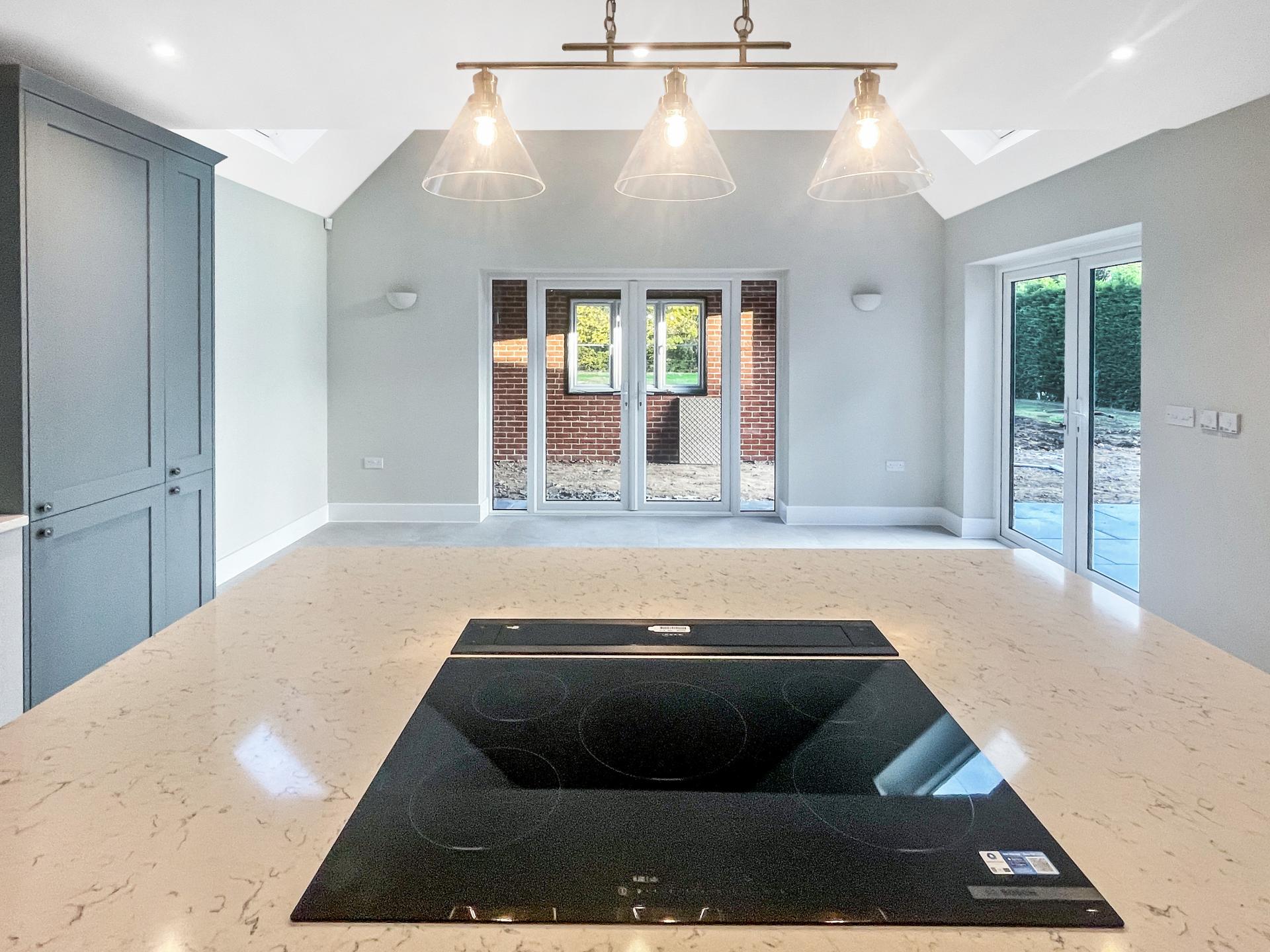 The heart of the ground floor is a generous open-plan space, combining the kitchen, dining, and lounge areas. Large bi-fold doors open up to the garden, bringing in ample natural light and seamlessly connecting indoor and outdoor spaces. The kitchen itself features a central island with a modern design, fitted cabinetry, and high-end appliances, providing an ideal setting for cooking, entertaining, and family time.