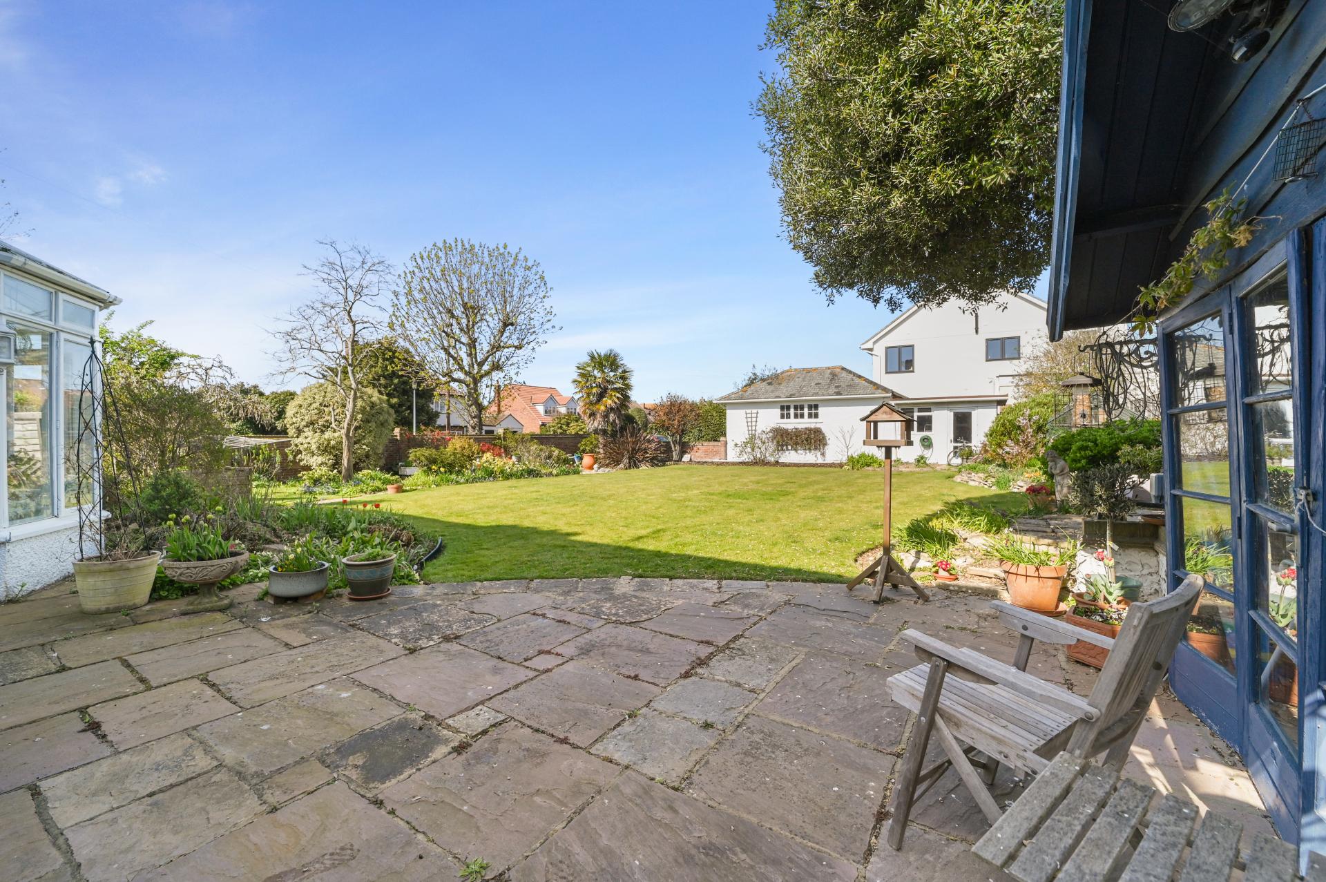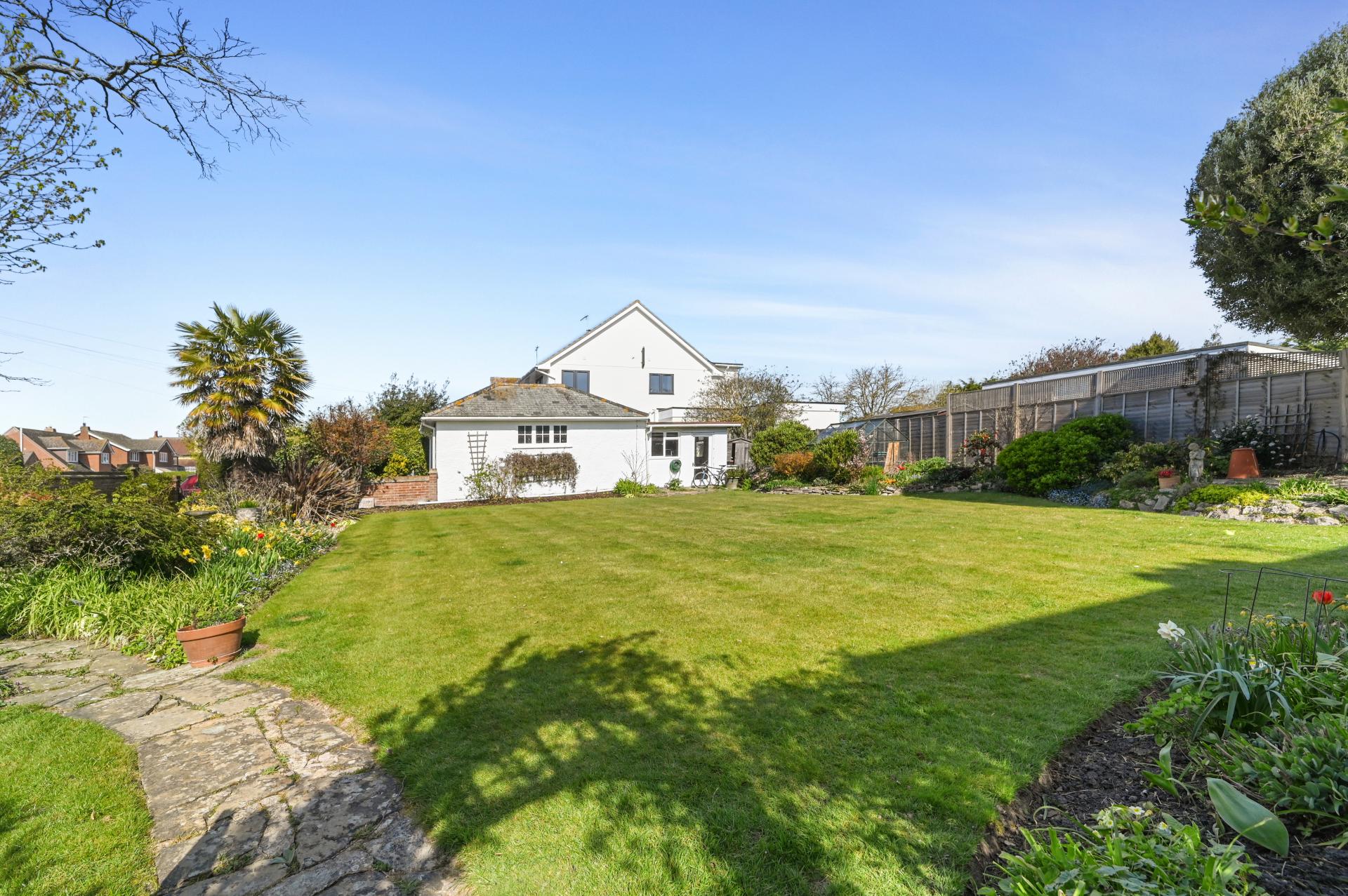 The rear garden features a spacious lawn bordered by vibrant flower beds, offering a beautiful backdrop for relaxation and entertainment and provides both open areas and intimate corners.