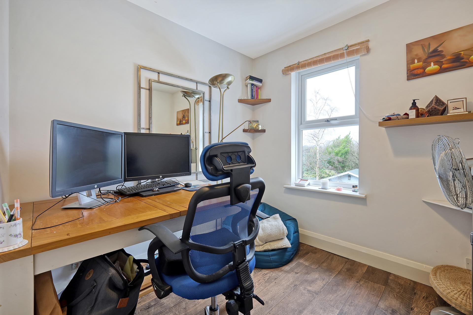 The first floor offers a generous dual-aspect living room with a feature fireplace, three bedrooms including one with en-suite, and a stylish family bathroom. The second floor reveals a luxurious master suite with en-suite shower room, a fifth bedroom with built-in study furniture, ideal for remote working, and access to a large walk-in loft area offering ample storage.