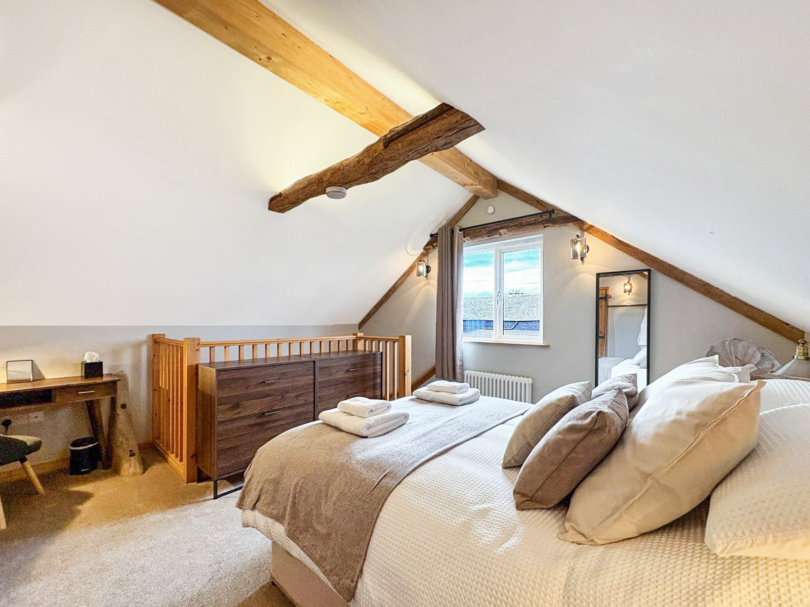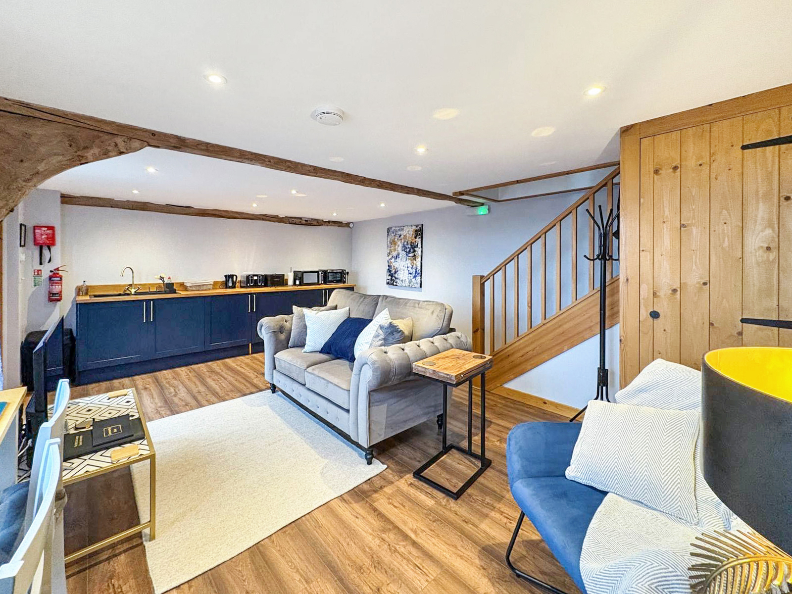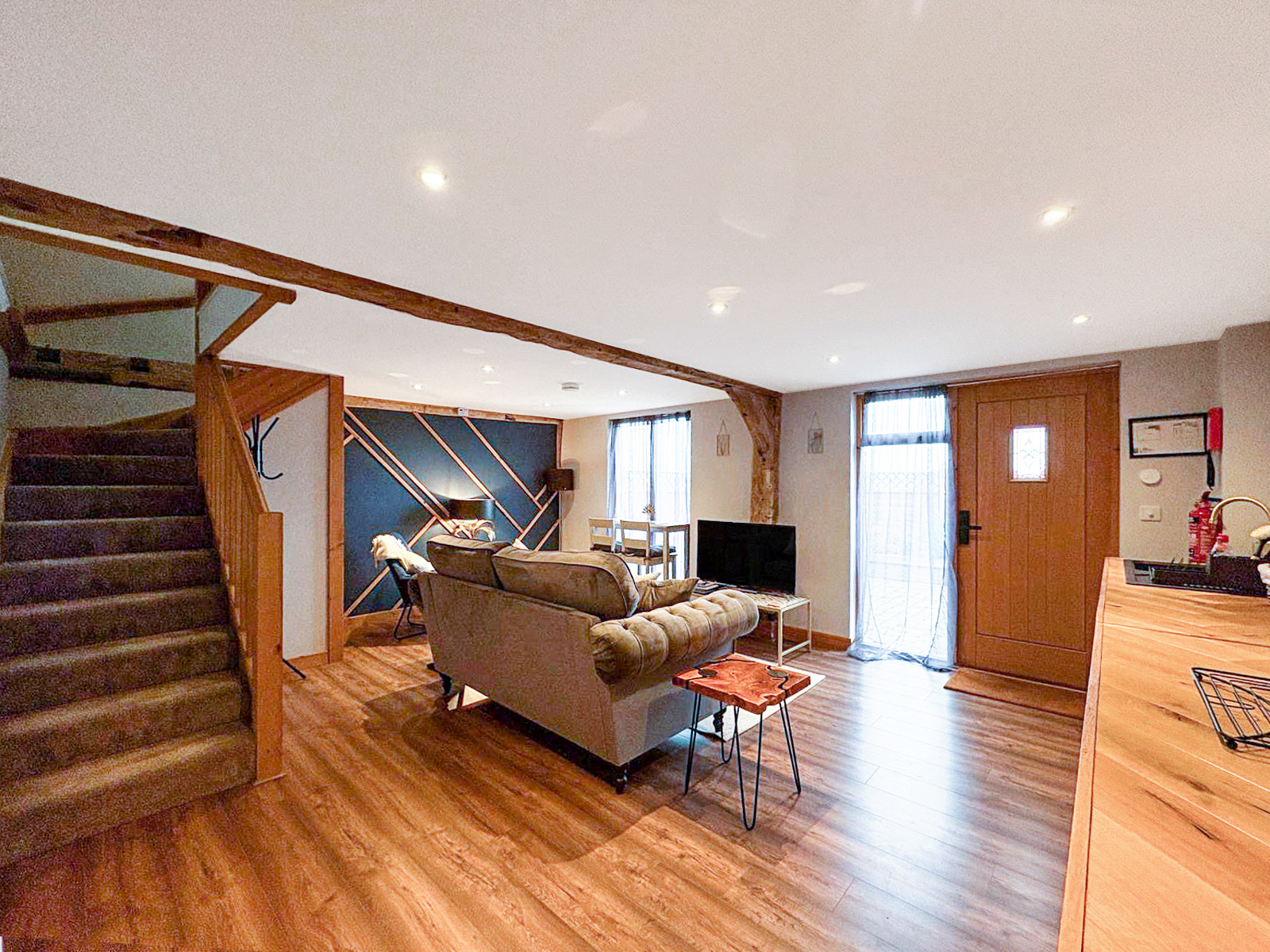 The exquisite two-storey cart lodge, previously serving as a Bridal Suite and holiday let, includes an inviting open-plan sitting area, a double bedroom with en-suite, and a private garden.