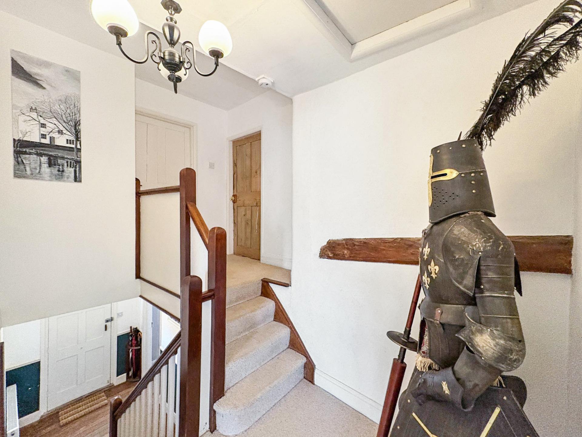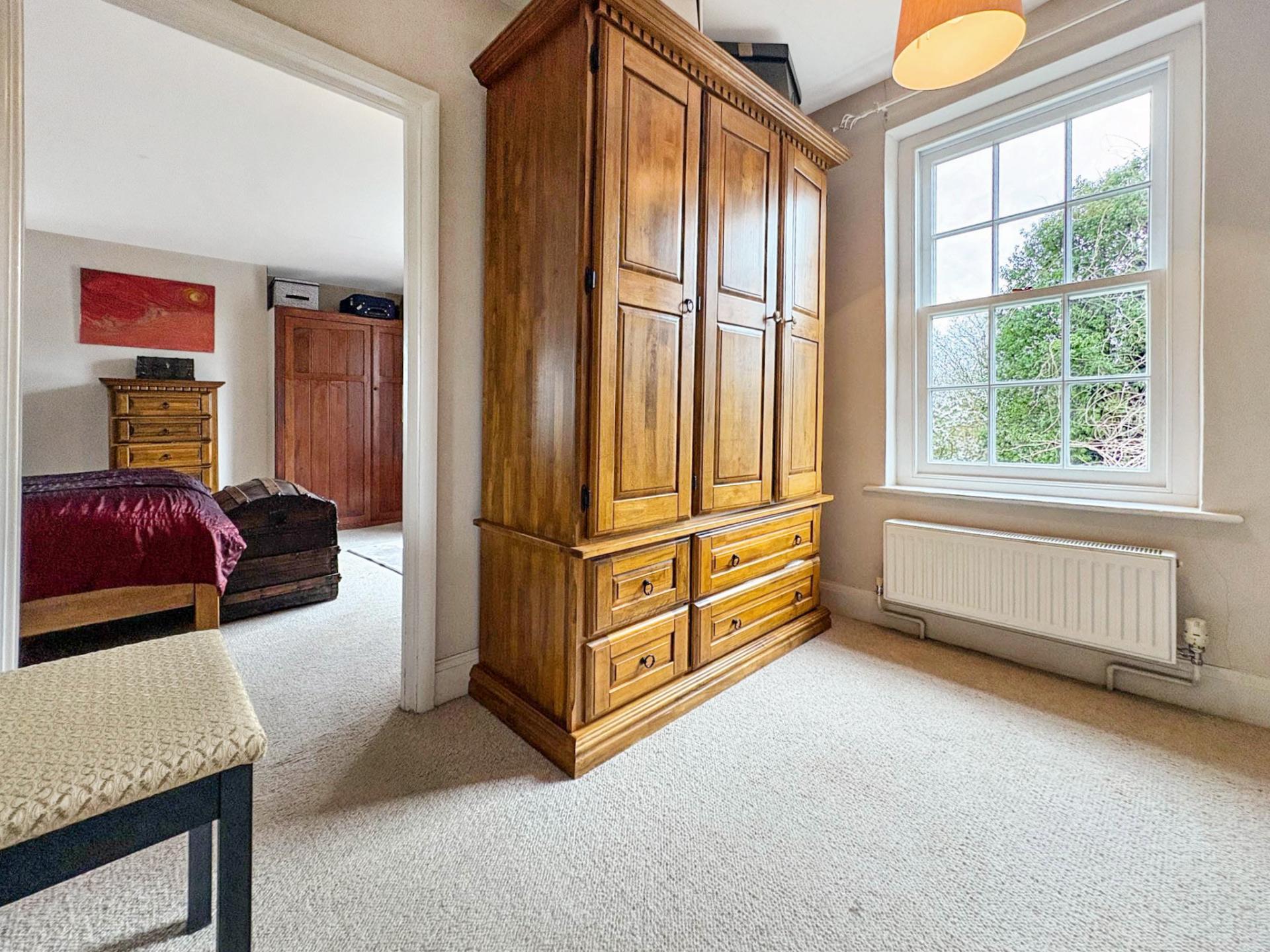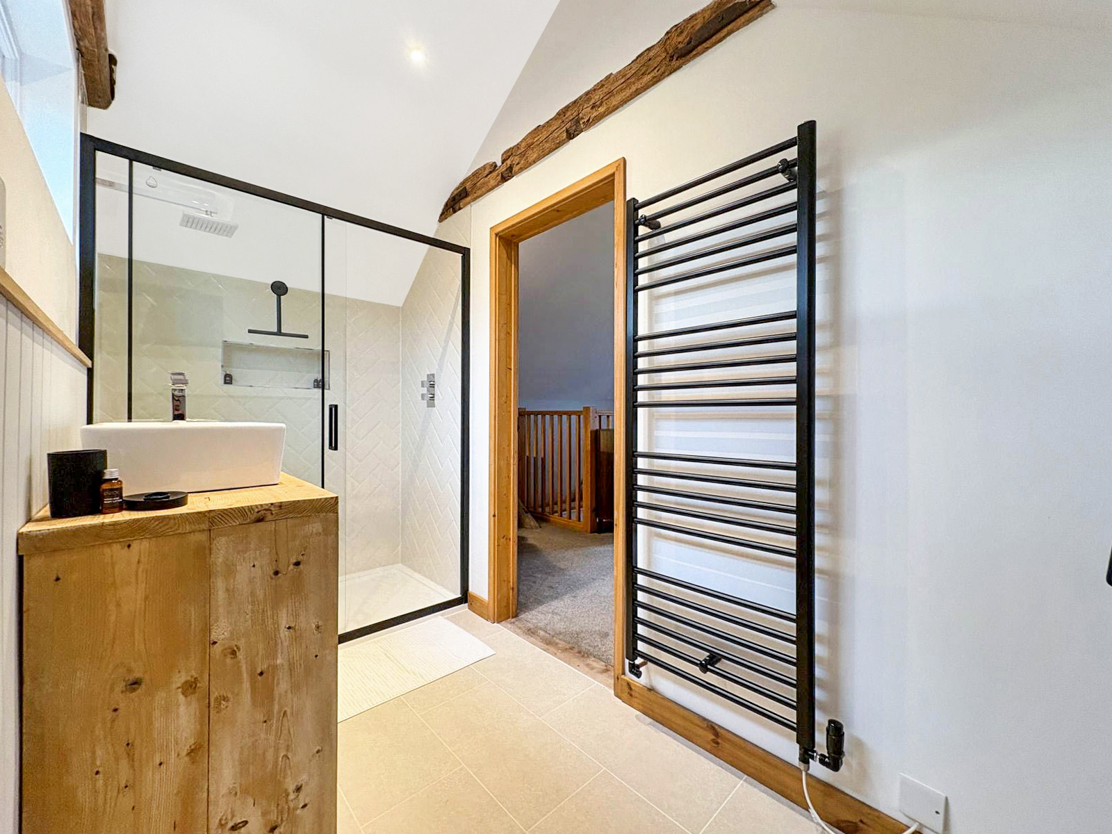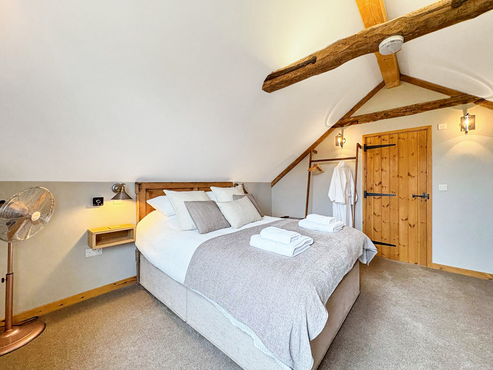 The exquisite two-storey cart lodge, previously serving as a Bridal Suite and holiday let, includes an inviting open-plan sitting area, a double bedroom with en-suite, and a private garden.