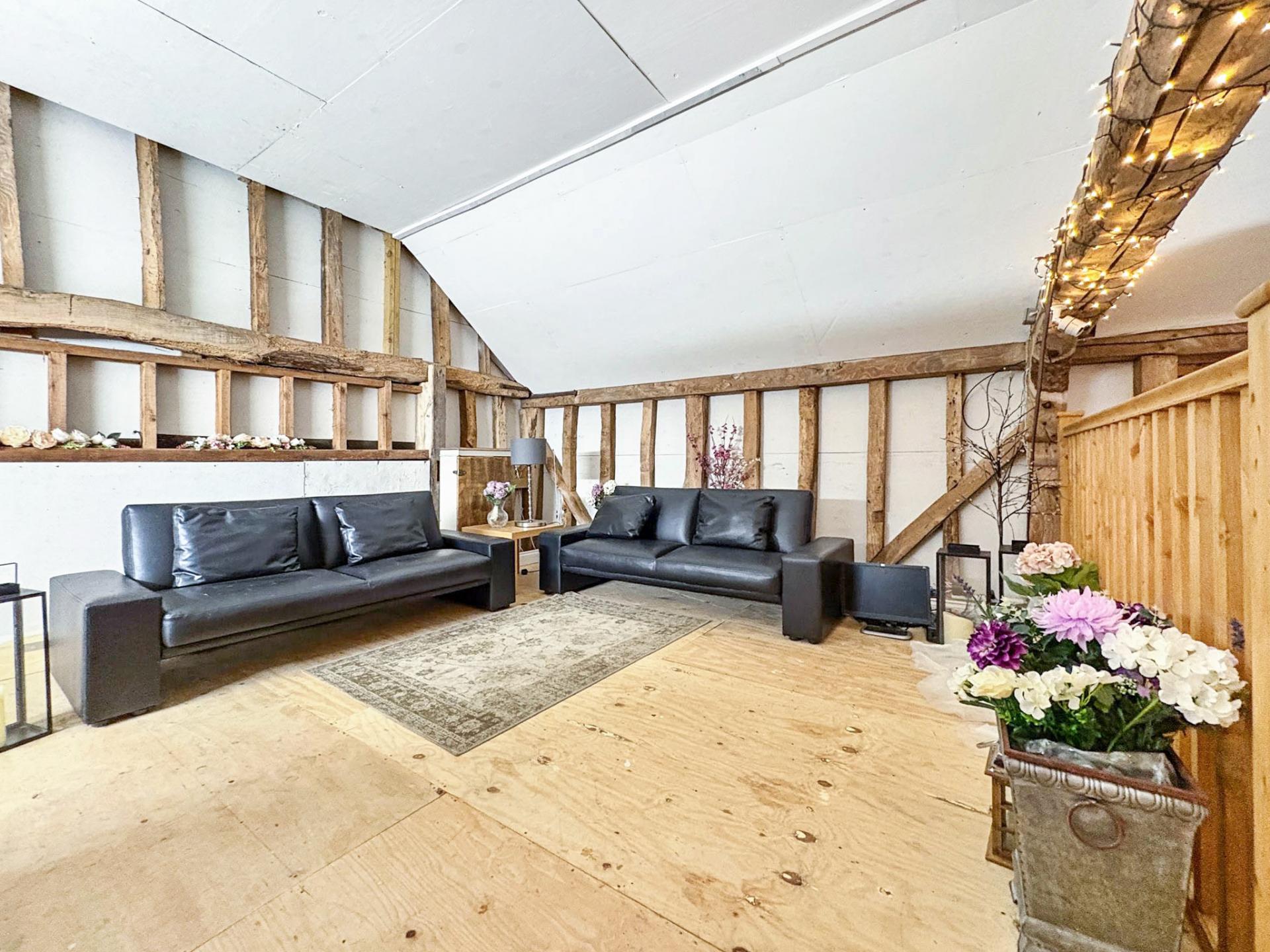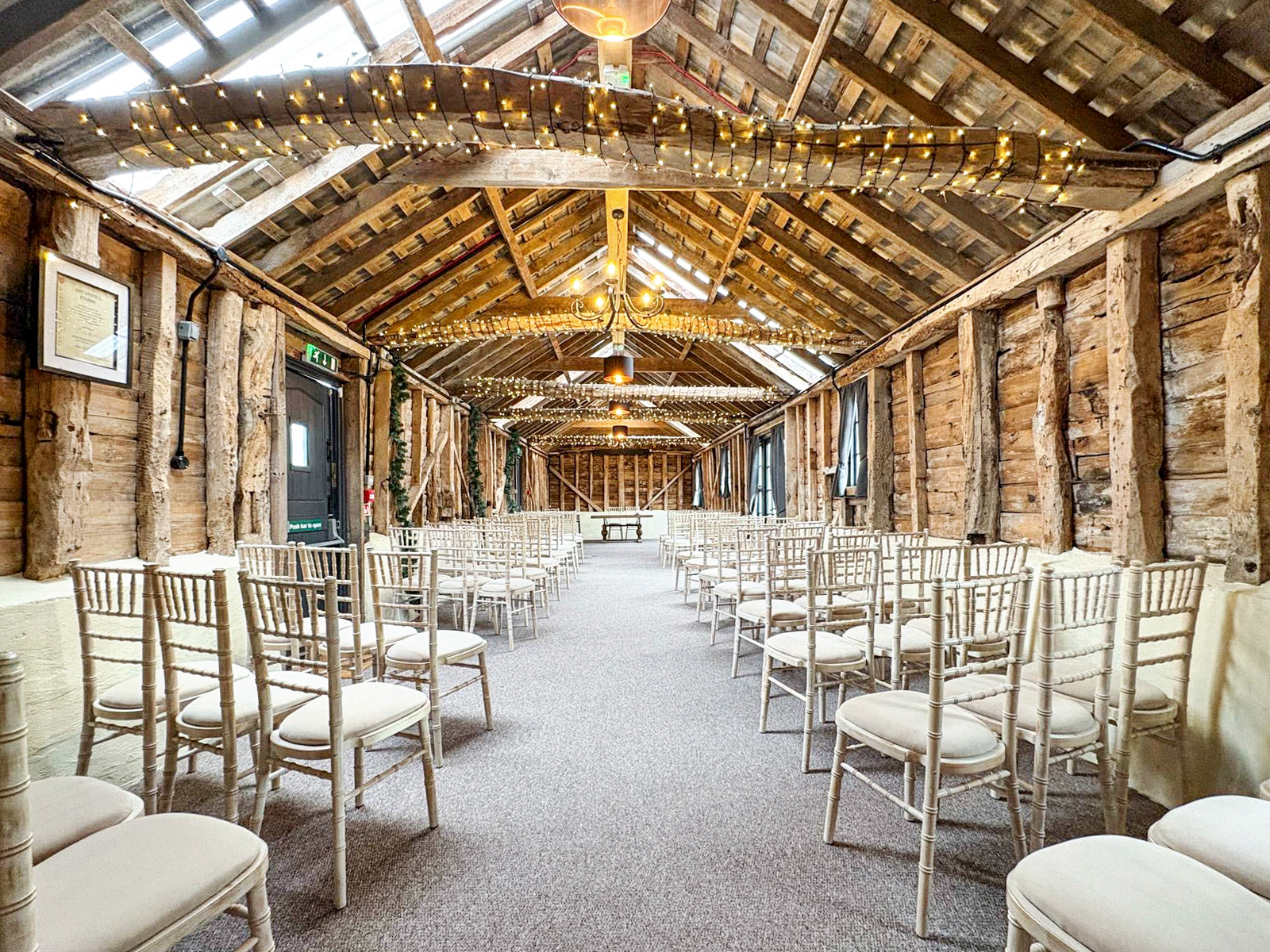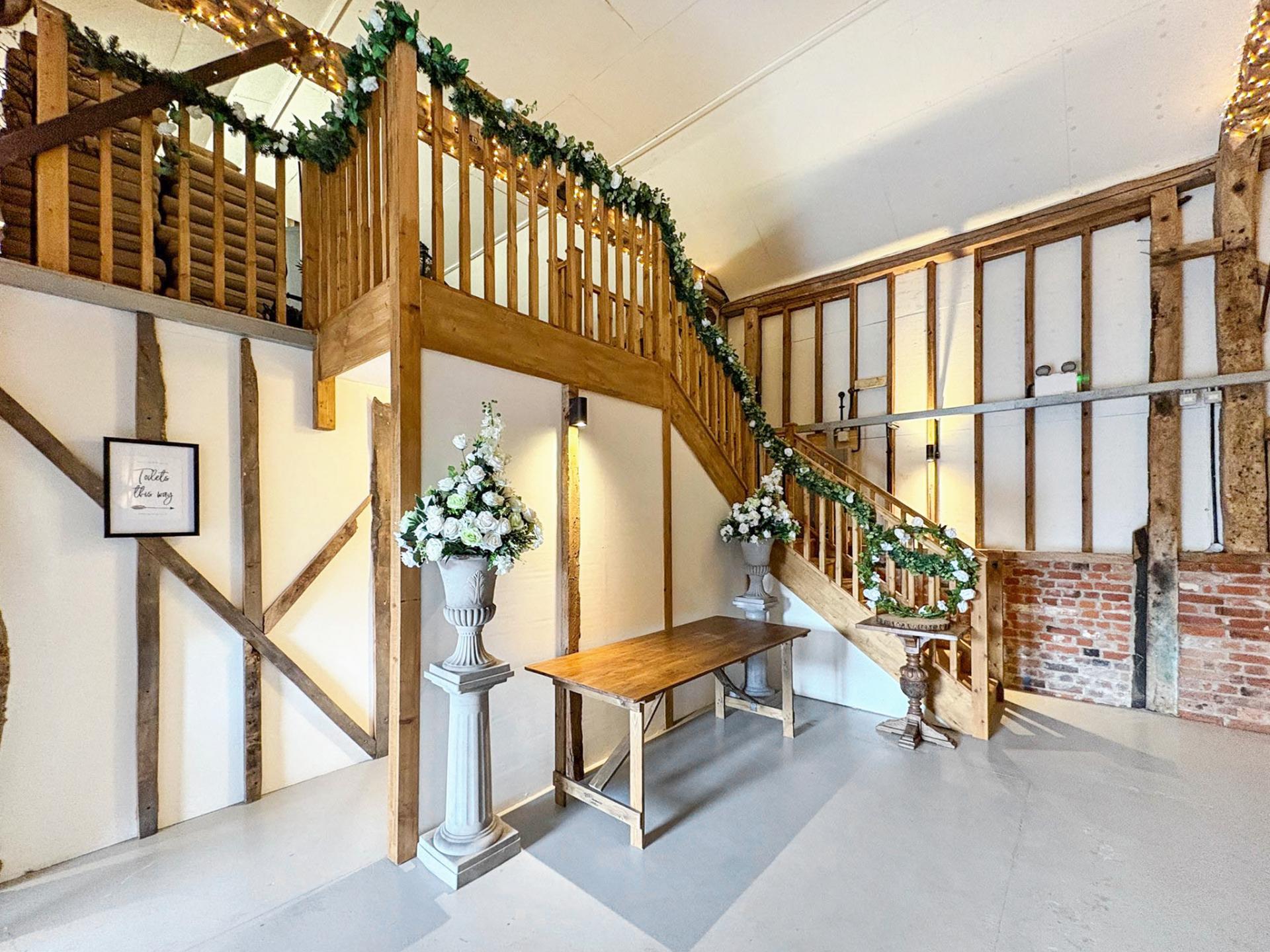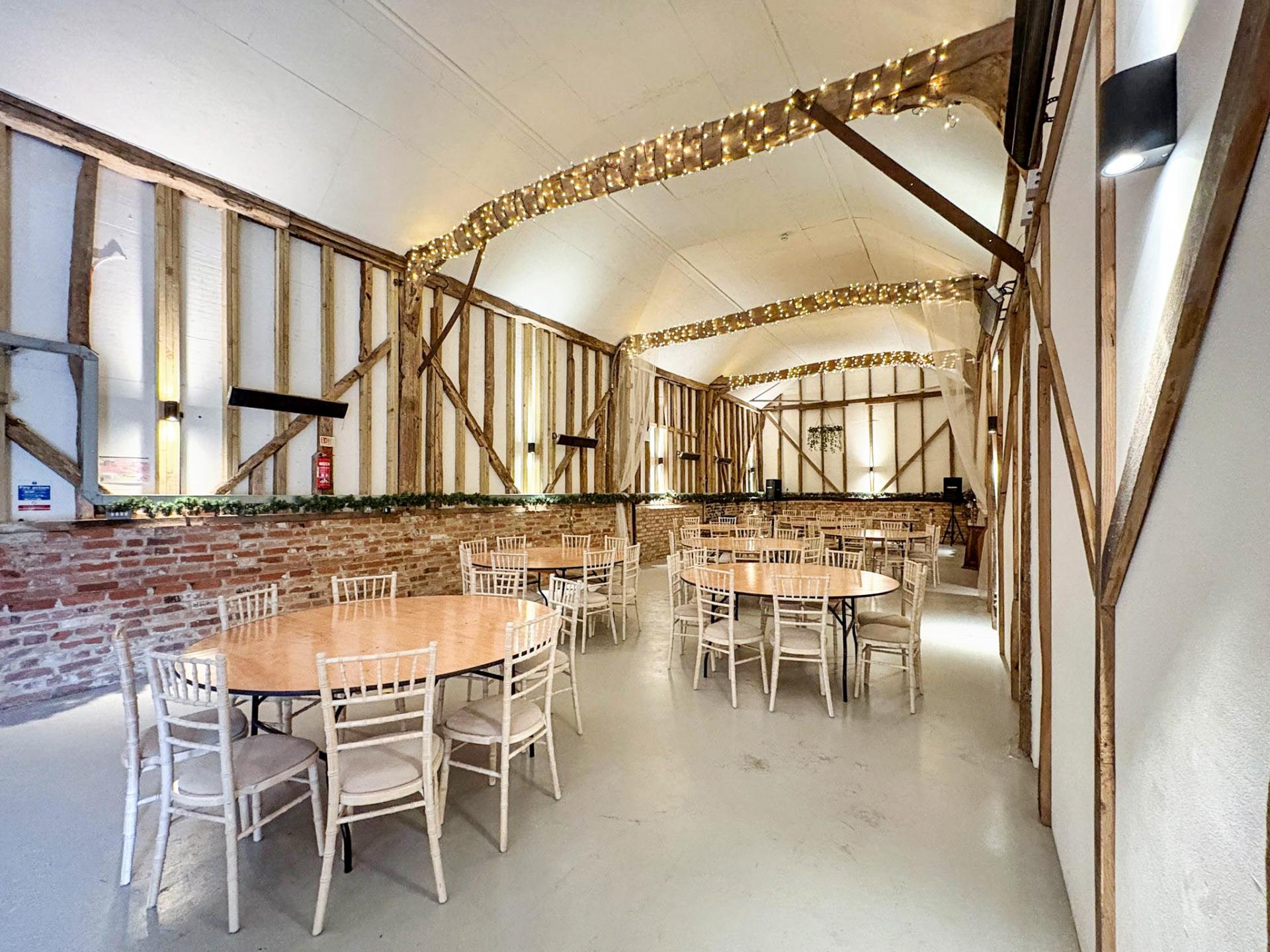 The unlisted Essex Barn, beautifully converted and restored, offers a reception area, an office, accessible restrooms, a separate bar area, and a main function space that can host up to 130 seated guests or 300 standing. The barn features an upper gallery and a kitchen prep area. A spacious ceremony room and secondary barn provide open-plan reception space, complete with additional storage, plans for a bar, and commercial kitchen facilities.