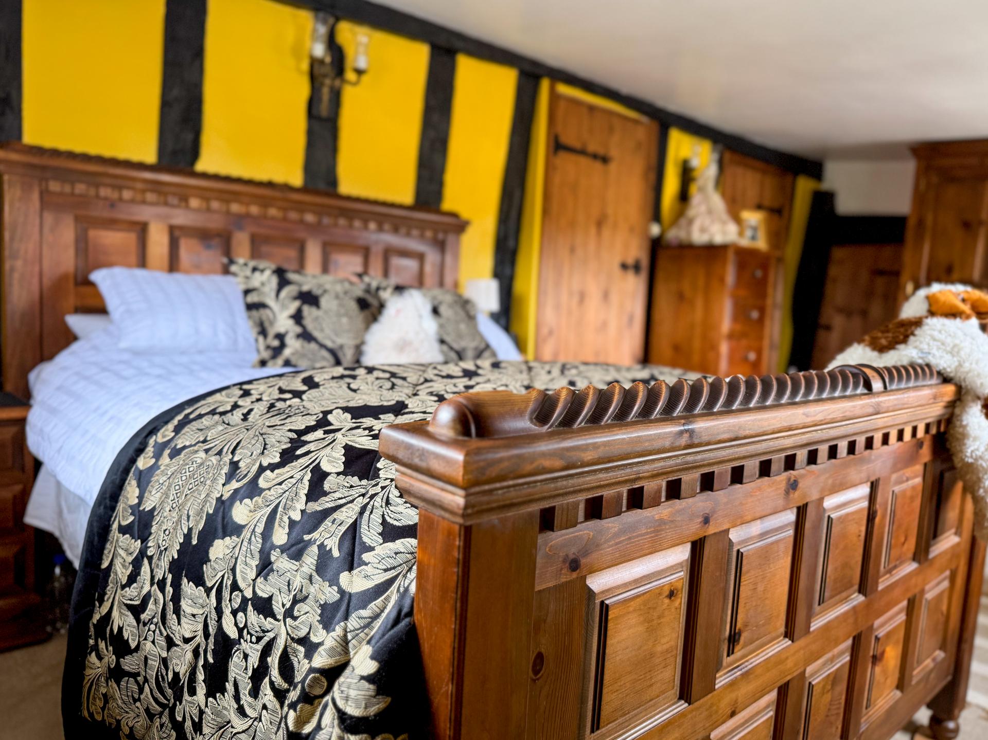 The cosy and inviting living room features a brick-built fireplace and exposed beams, with double doors that allow plenty of natural light and provide access to the garden. The ground floor also includes two additional reception rooms, currently used as bedrooms, along with a study.