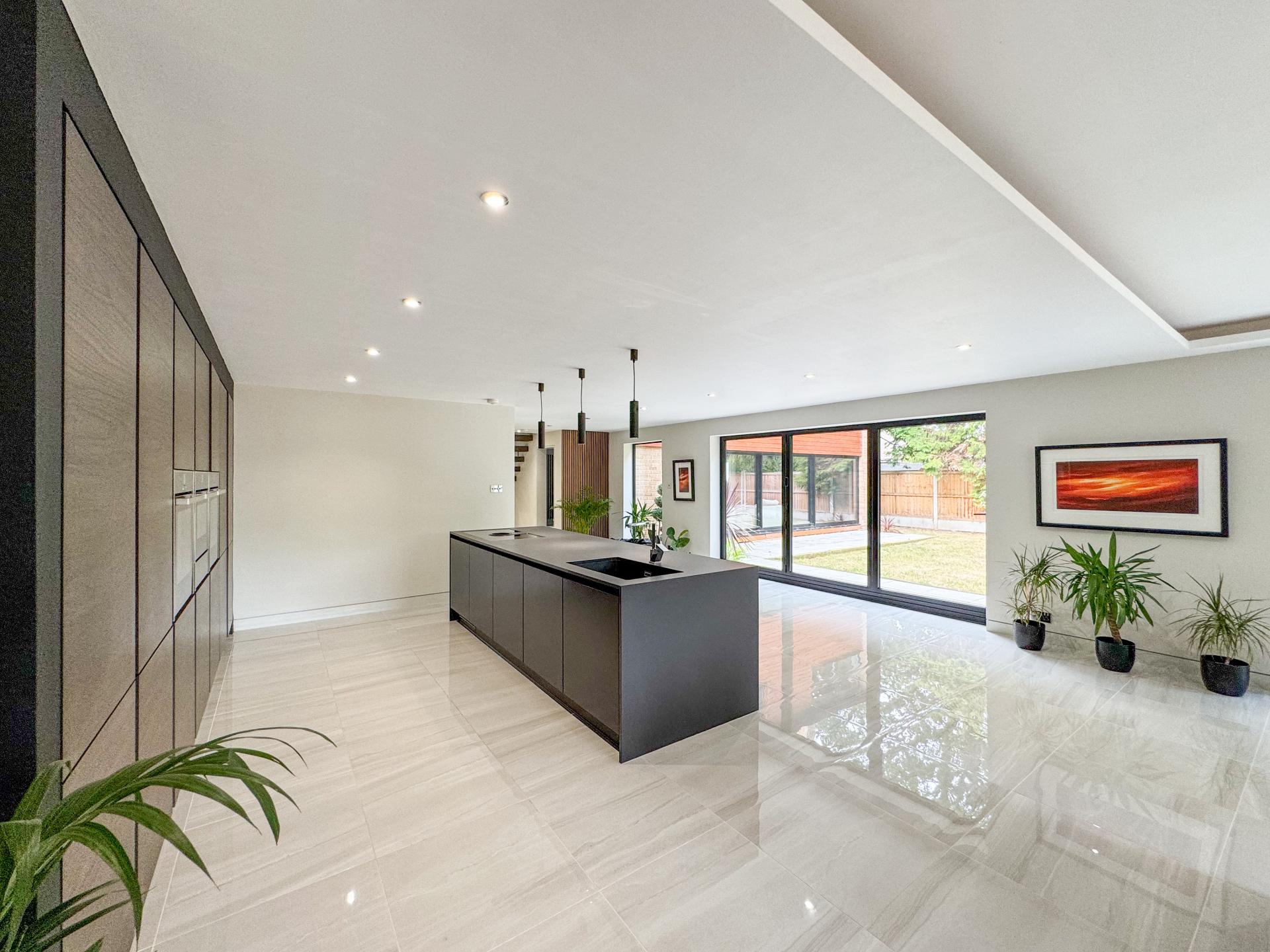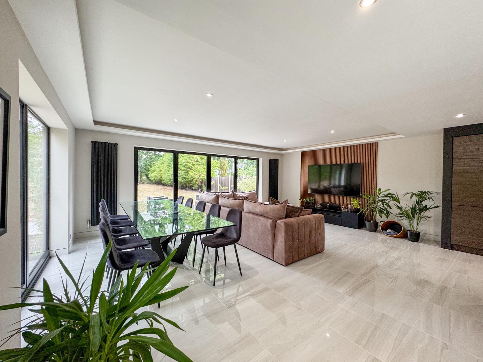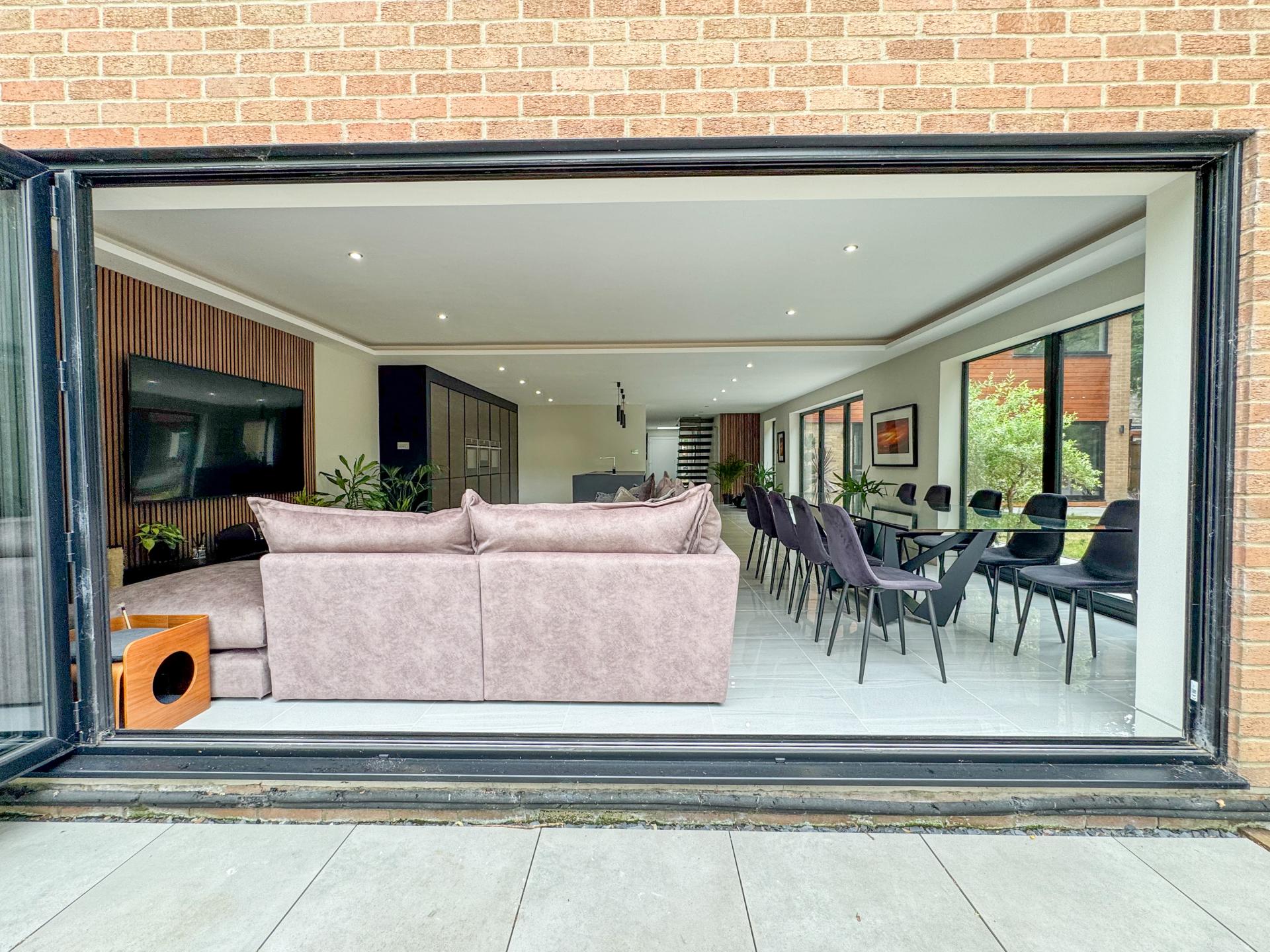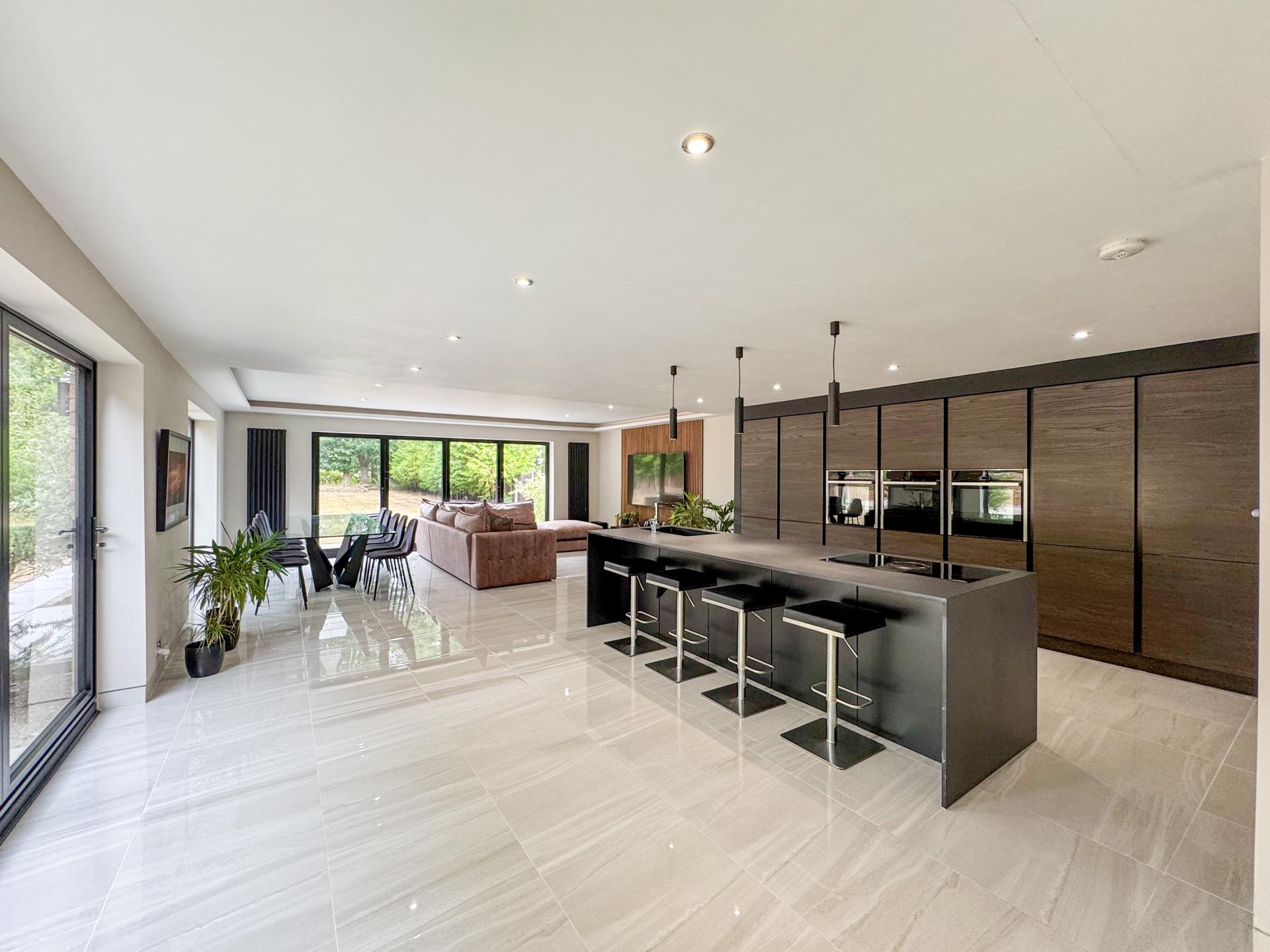 Adjacent is the striking kitchen/dining family room. The high-specification kitchen includes an Elica induction hob and extractor fan, a Neff double hide-and-slide oven, a microwave combi, and a warming drawer, as well as zonal underfloor heating. The open-plan layout encourages fluidity and interaction, with the bifold doors creating the perfect indoor-outdoor environment.