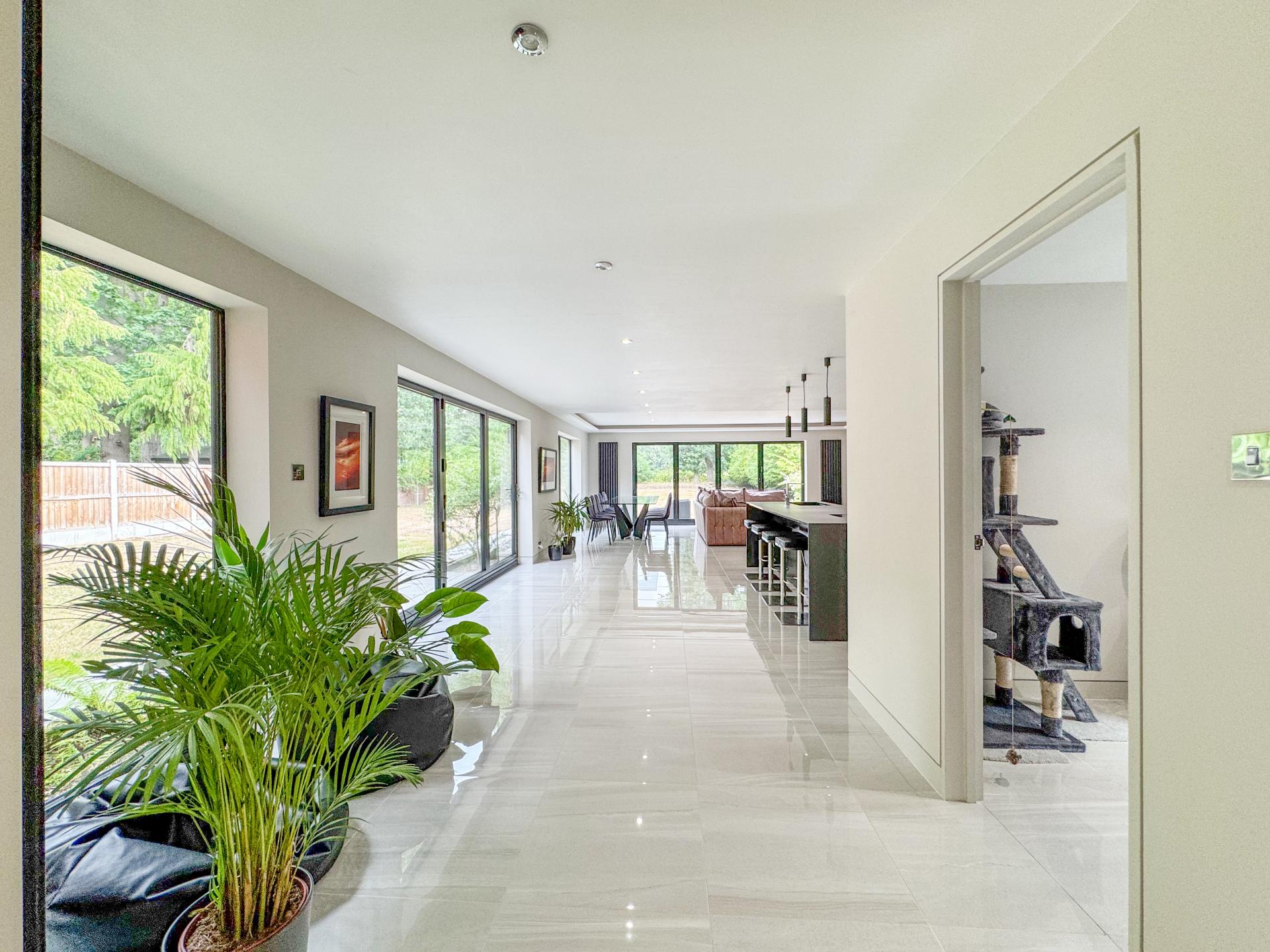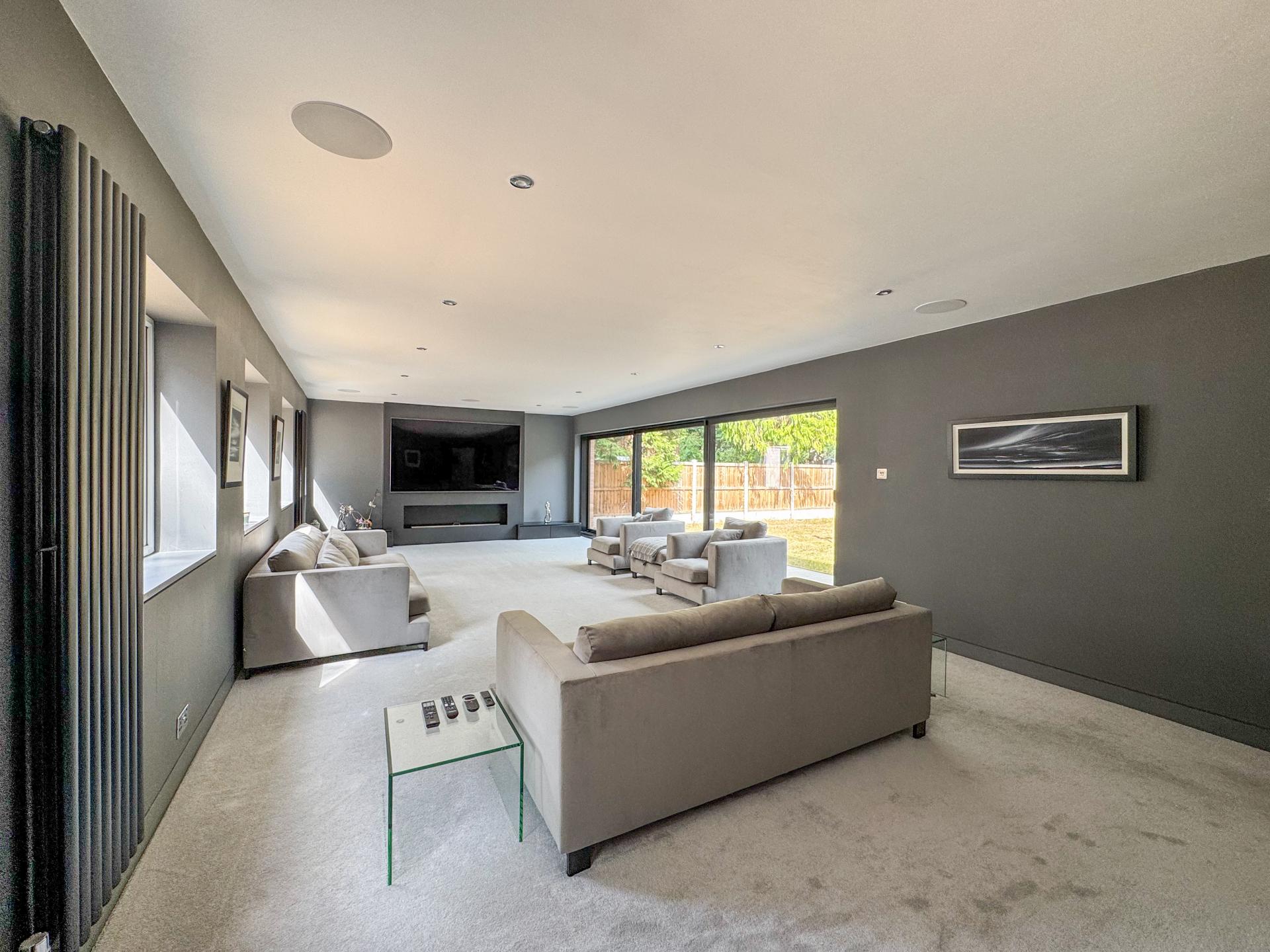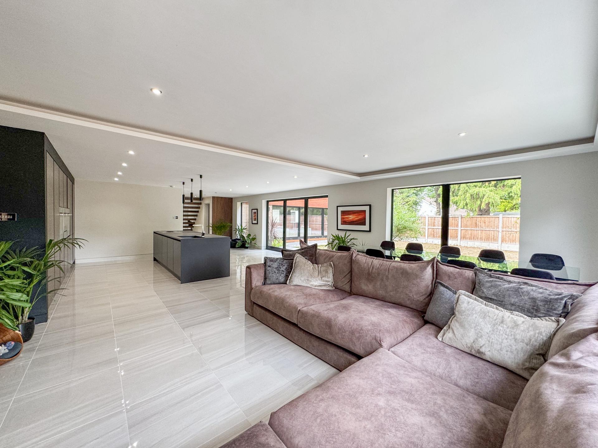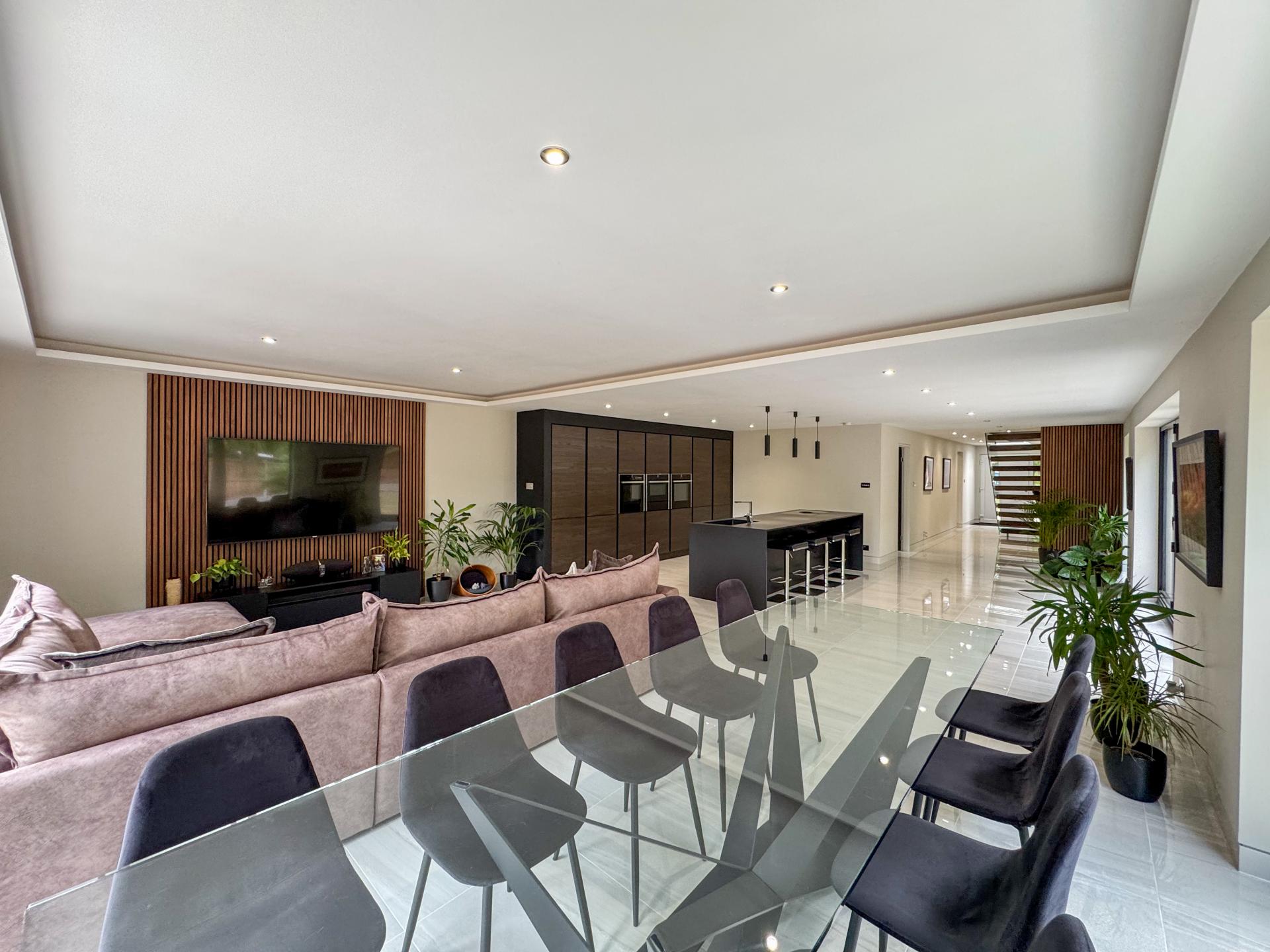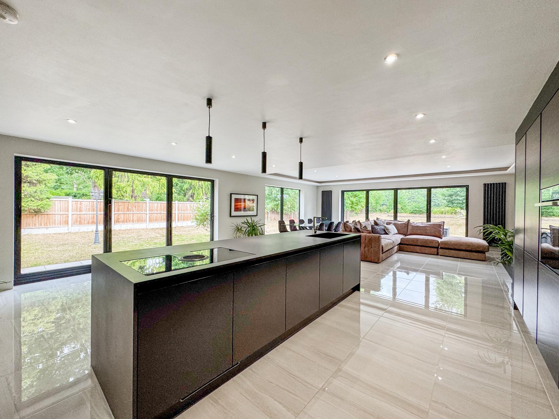 Adjacent is the striking kitchen/dining family room. The high-specification kitchen includes an Elica induction hob and extractor fan, a Neff double hide-and-slide oven, a microwave combi, and a warming drawer, as well as zonal underfloor heating. The open-plan layout encourages fluidity and interaction, with the bifold doors creating the perfect indoor-outdoor environment.