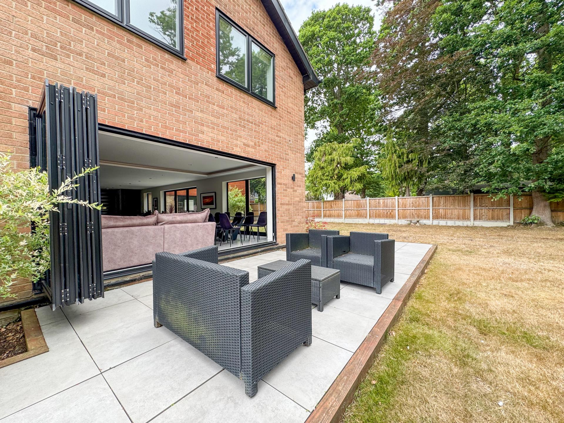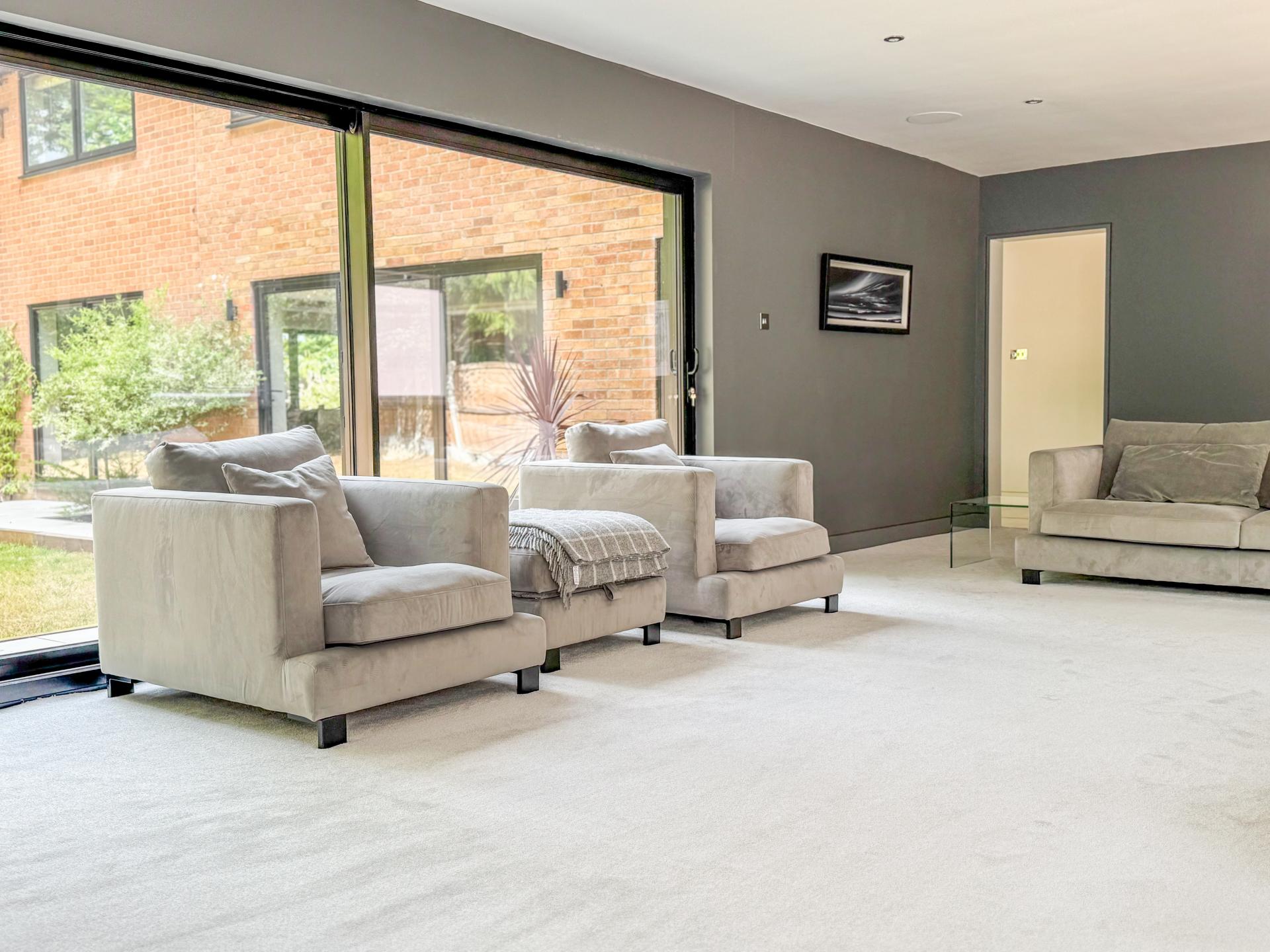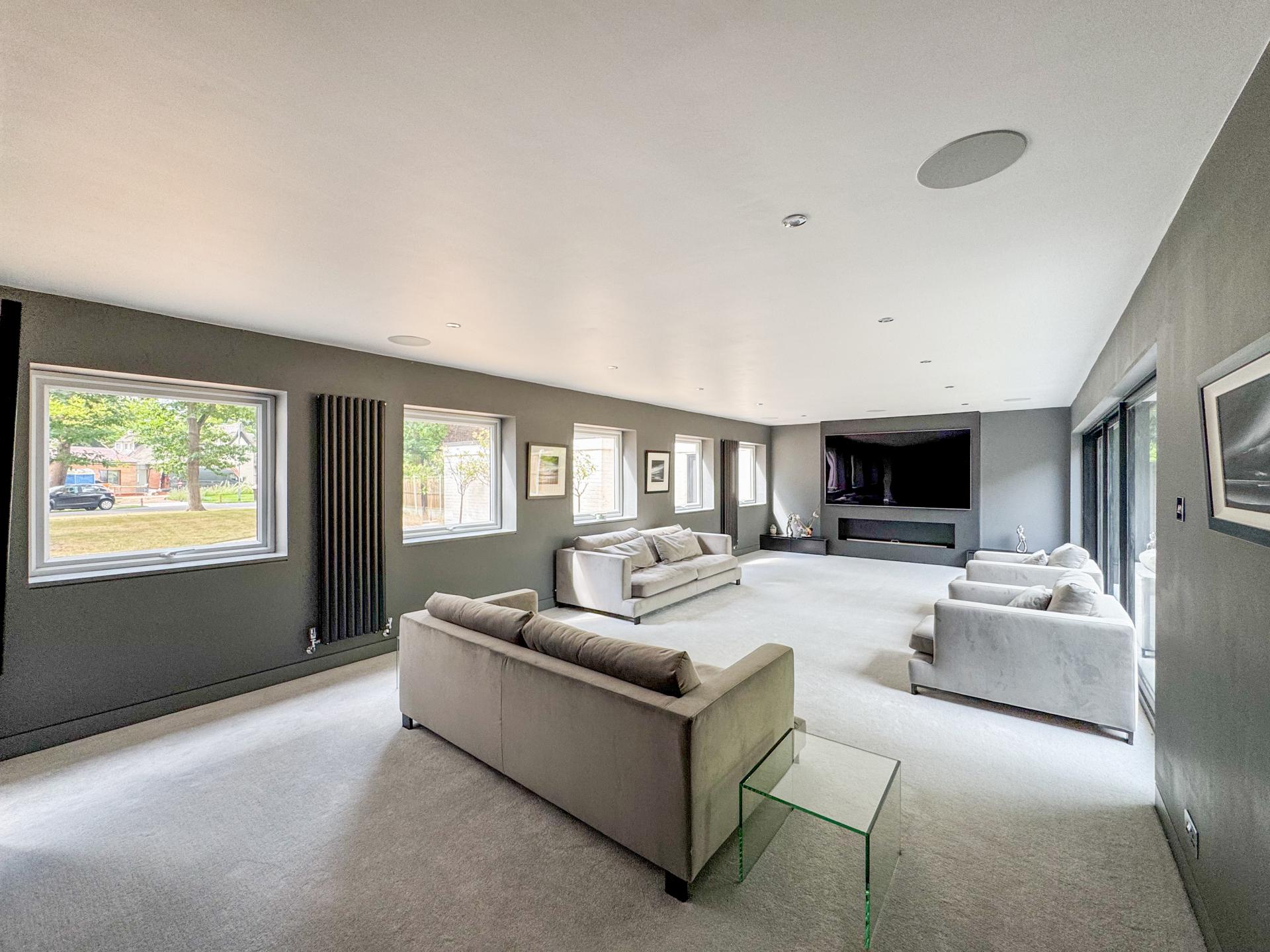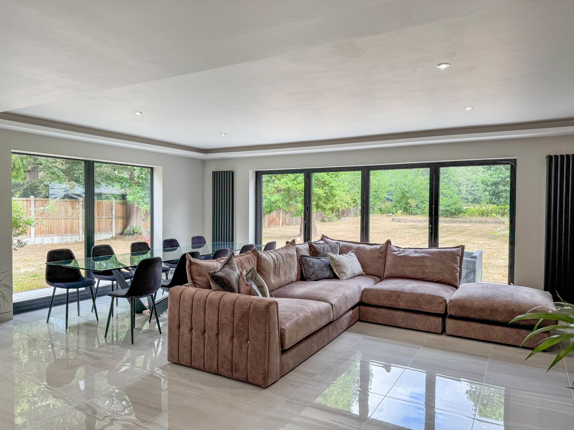 Adjacent is the striking kitchen/dining family room. The high-specification kitchen includes an Elica induction hob and extractor fan, a Neff double hide-and-slide oven, a microwave combi, and a warming drawer, as well as zonal underfloor heating. The open-plan layout encourages fluidity and interaction, with the bifold doors creating the perfect indoor-outdoor environment.