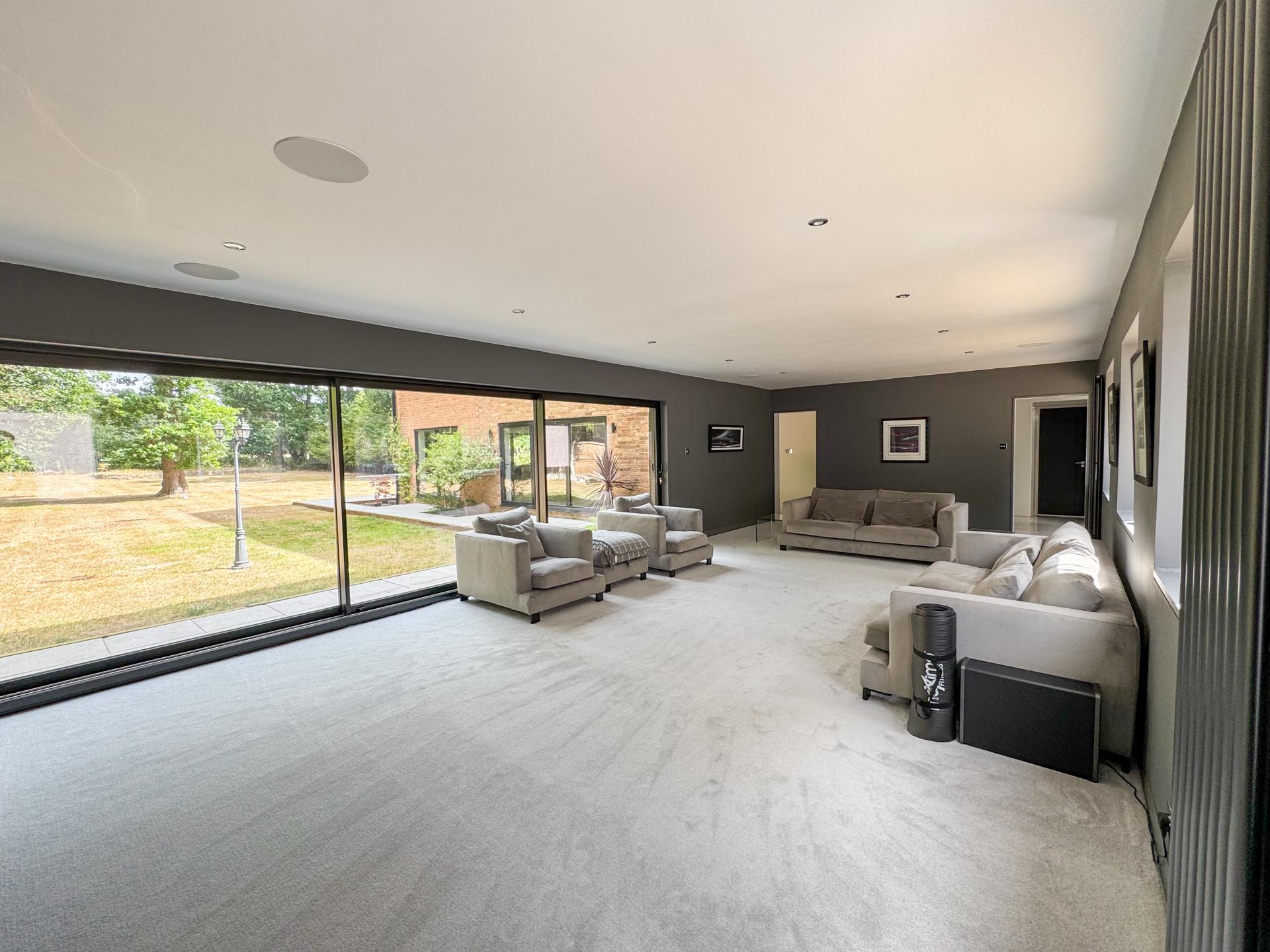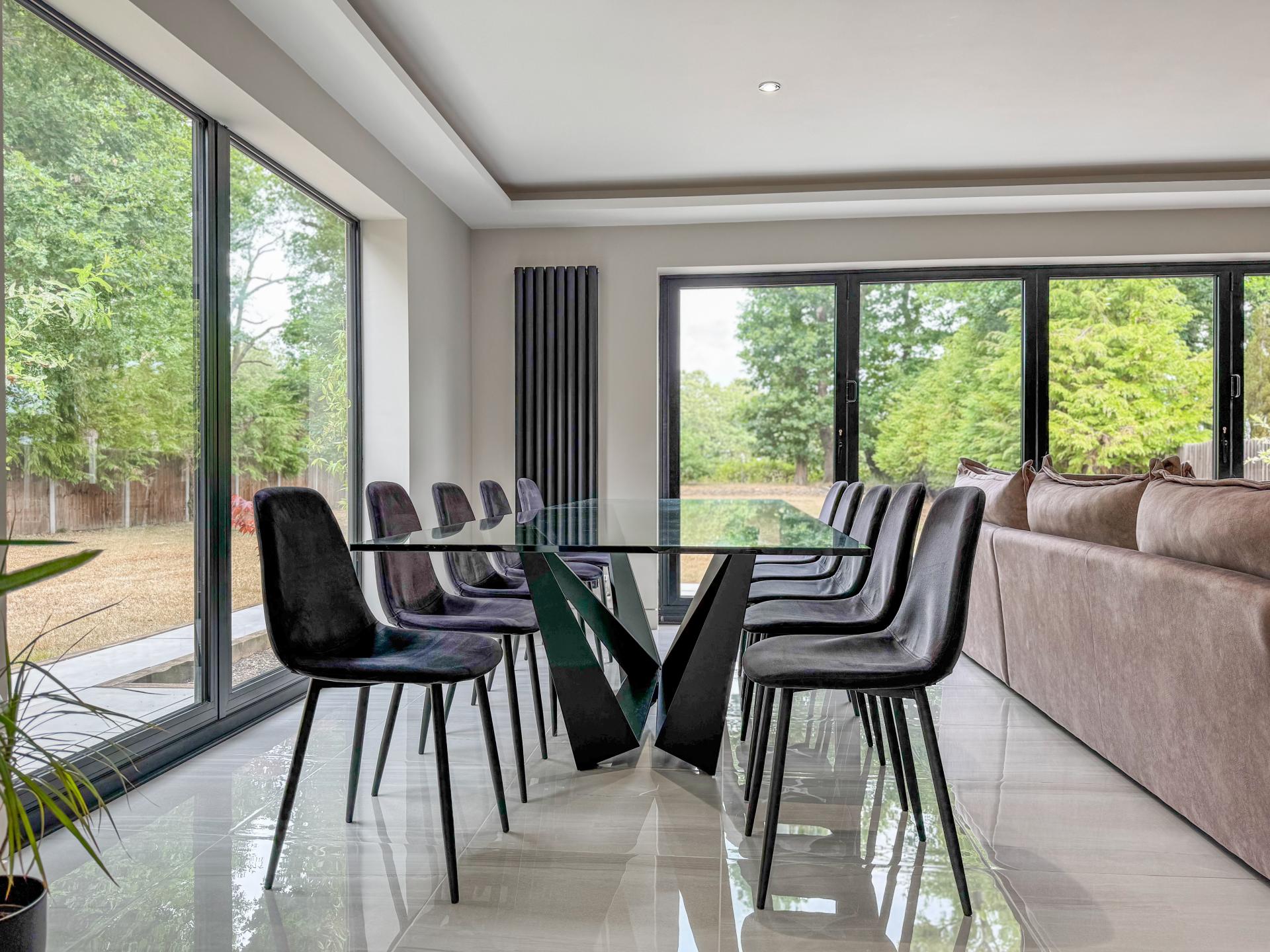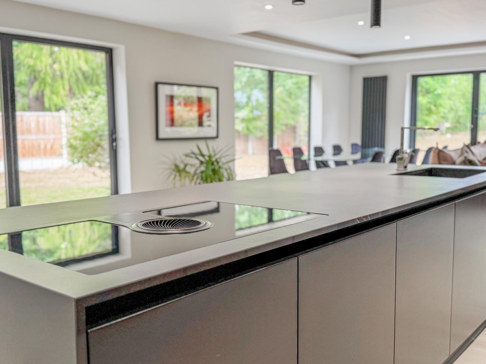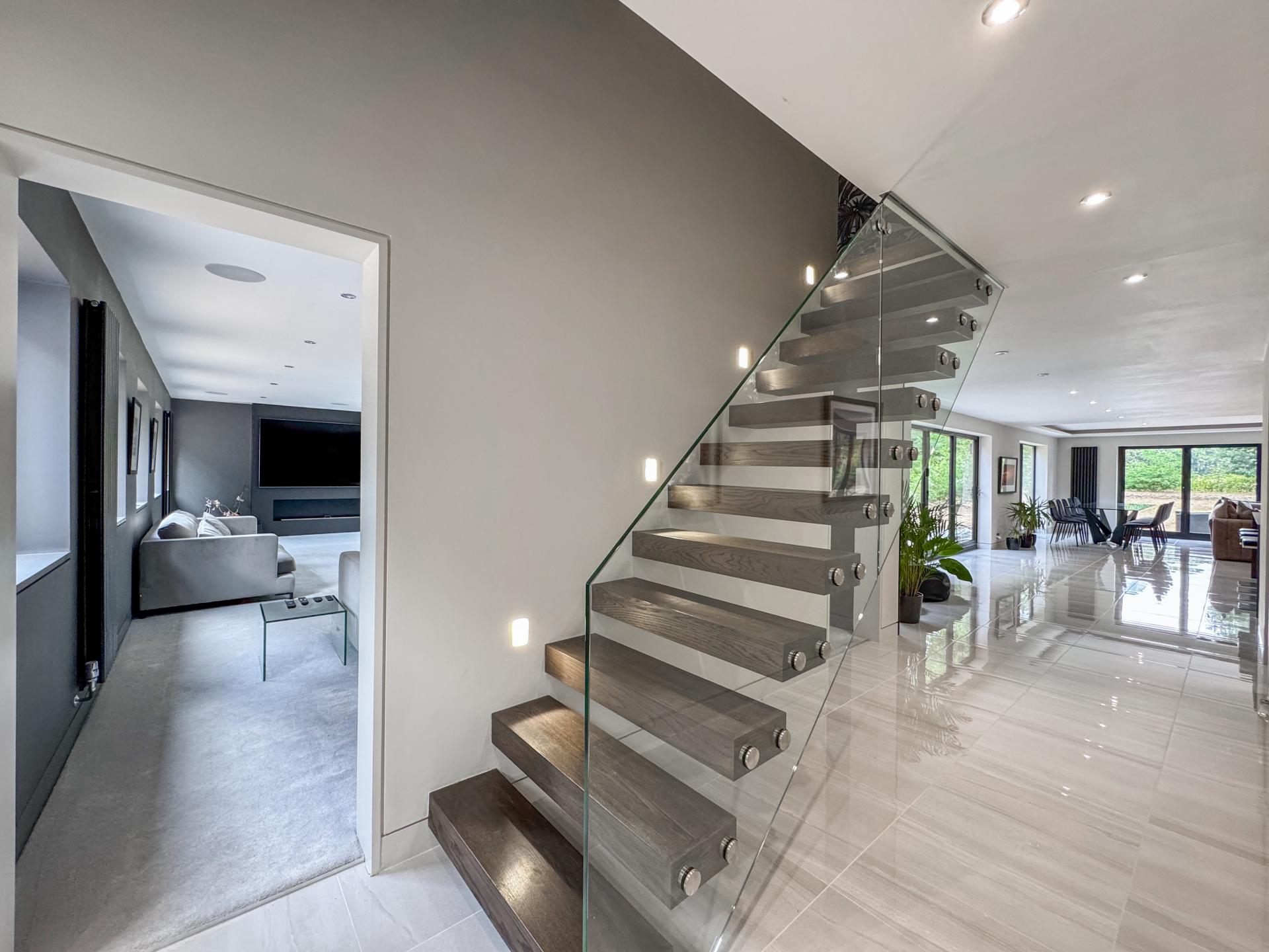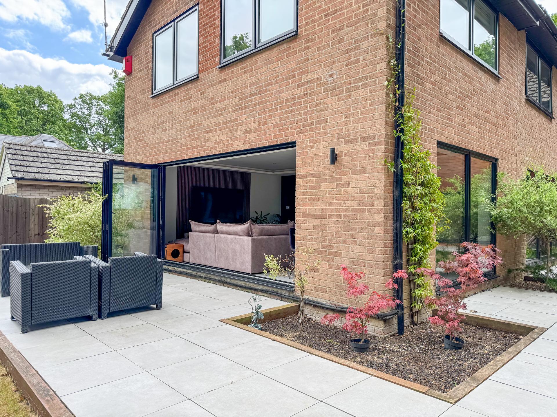 Adjacent is the striking kitchen/dining family room. The high-specification kitchen includes an Elica induction hob and extractor fan, a Neff double hide-and-slide oven, a microwave combi, and a warming drawer, as well as zonal underfloor heating. The open-plan layout encourages fluidity and interaction, with the bifold doors creating the perfect indoor-outdoor environment.